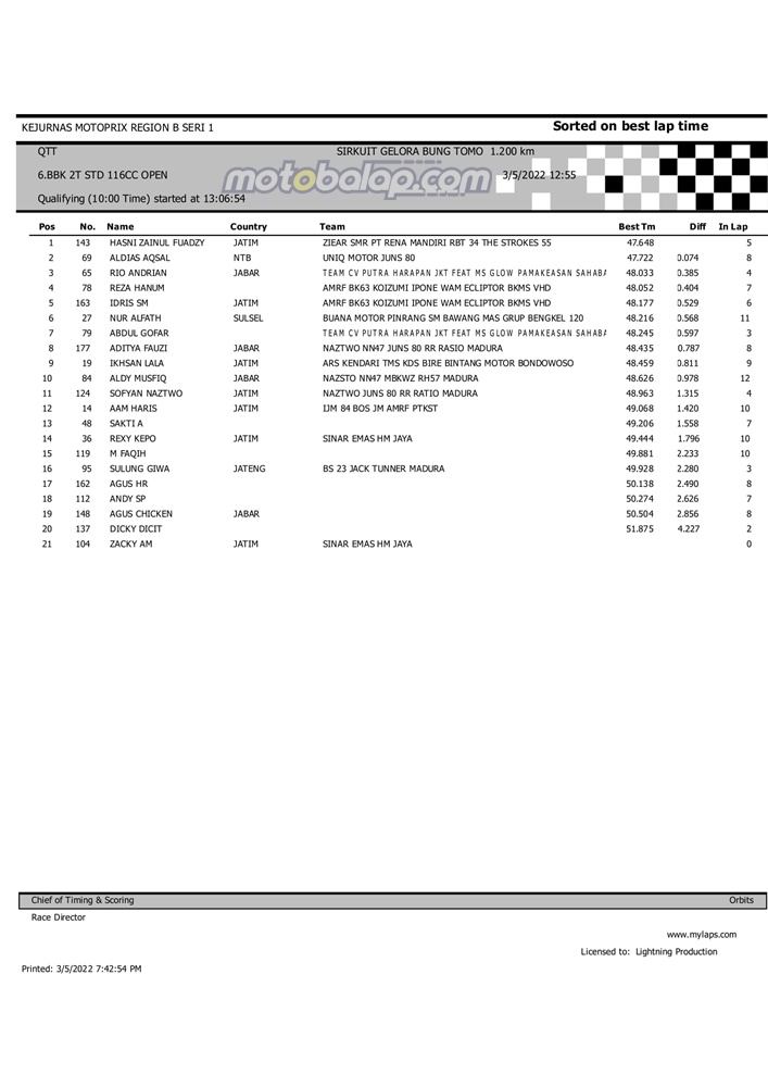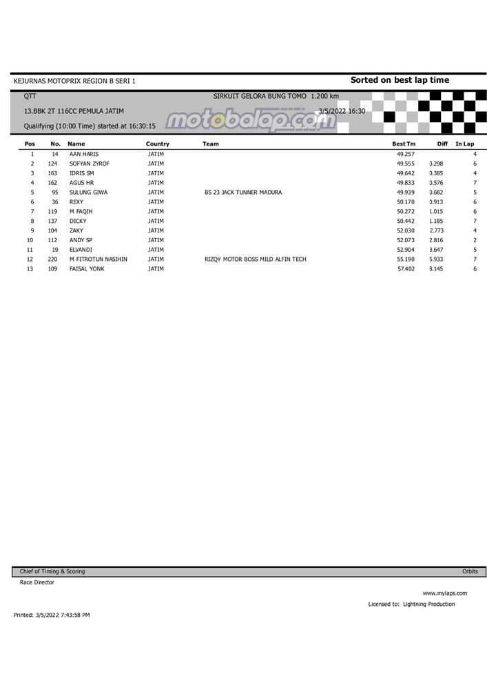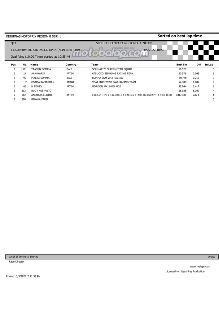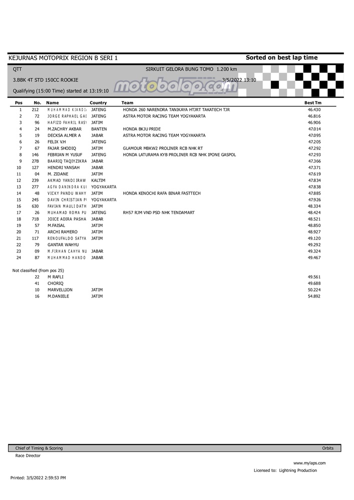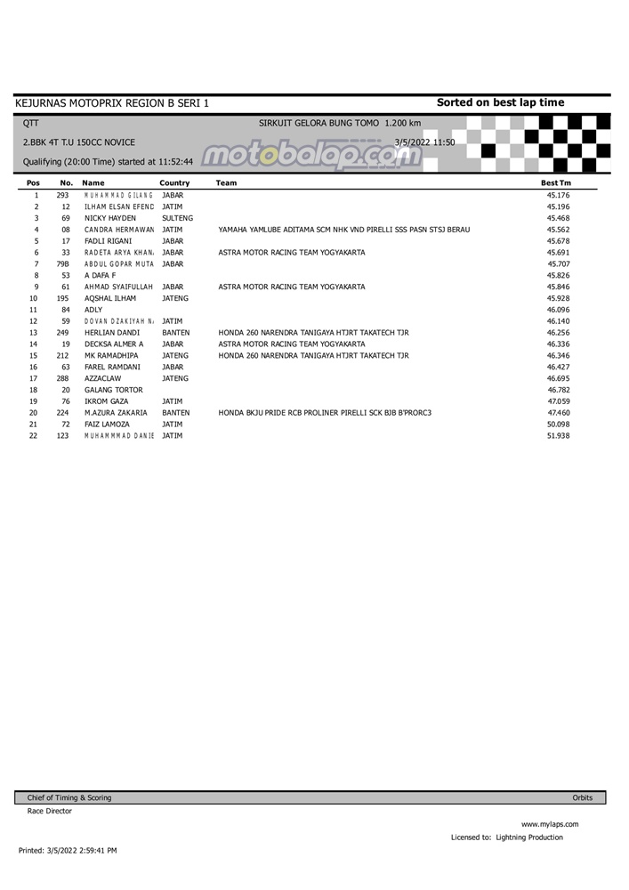 Hasil Lengkap QTT Semua Kelas Kejurnas Motoprix Region B di Surabaya, MOTOBALAP.COM – Hasil lengkap semua kelasĀ QTT Kejurnas Motoprix Region B Jawa yang berlangsung di sirkuit Internasional Bung Tomo, Surabaya, Sabtu (05/02/2022) adalah sebagai berikut: