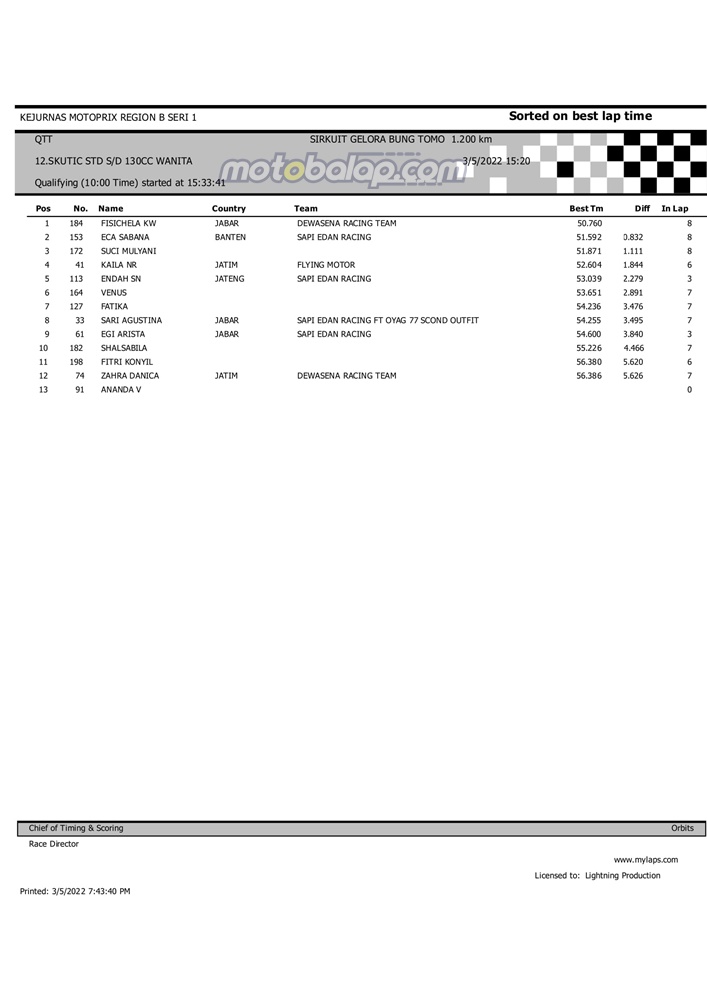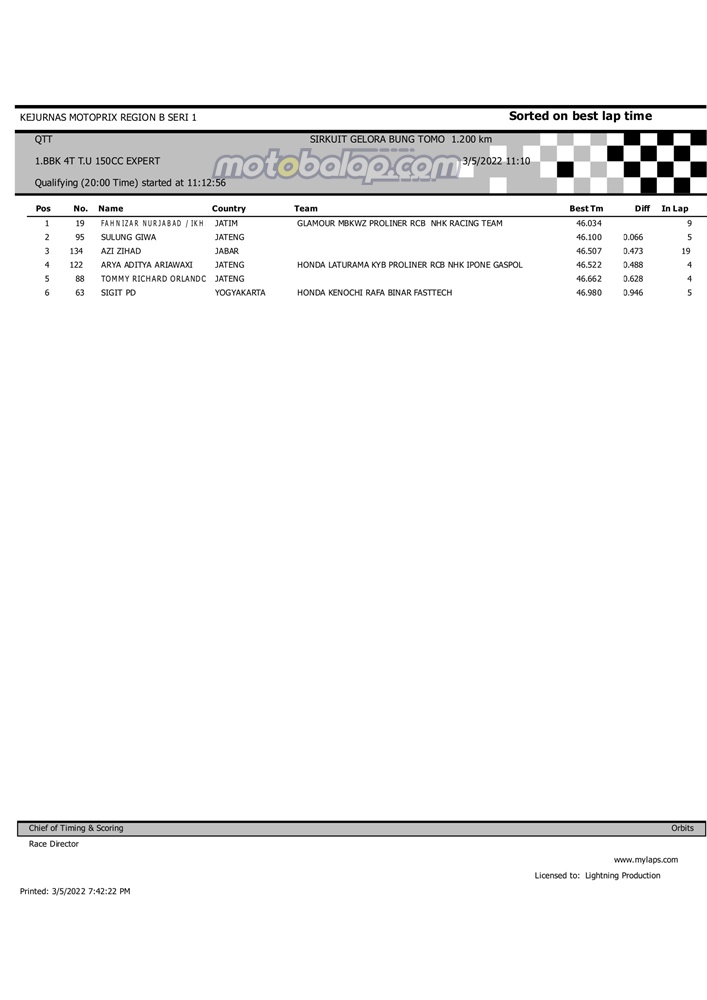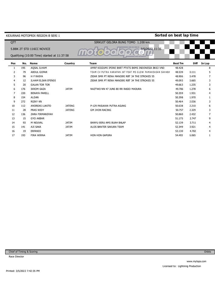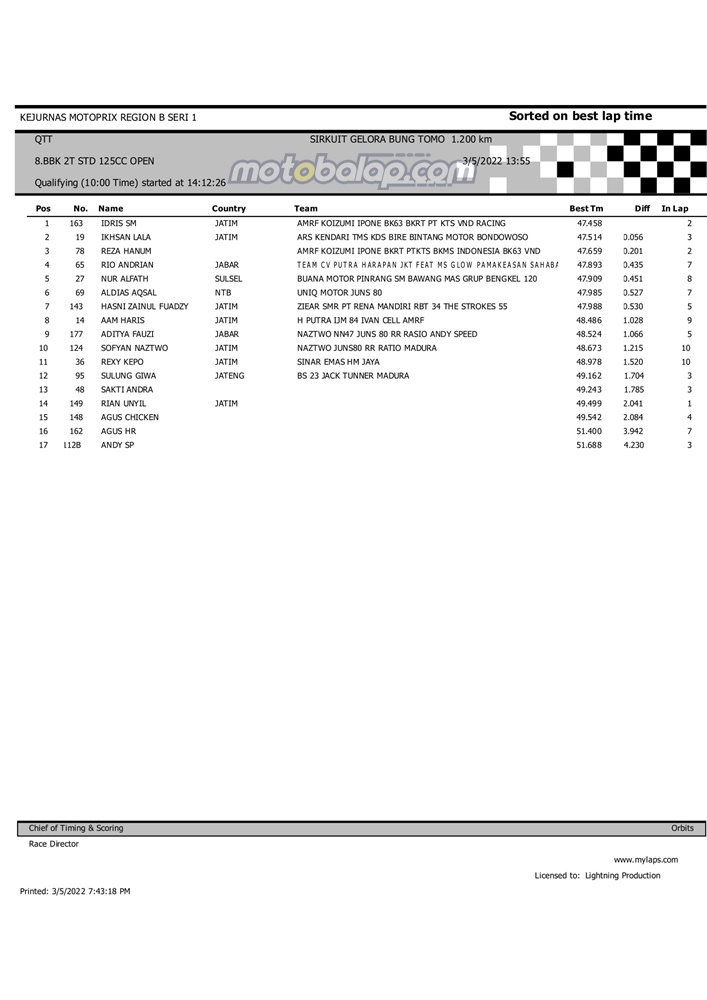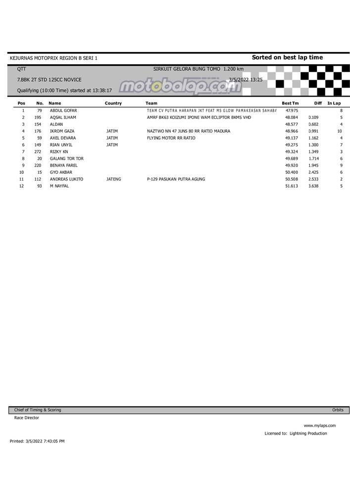 Hasil Lengkap QTT Semua Kelas Kejurnas Motoprix Region B di Surabaya, MOTOBALAP.COM – Hasil lengkap semua kelasĀ QTT Kejurnas Motoprix Region B Jawa yang berlangsung di sirkuit Internasional Bung Tomo, Surabaya, Sabtu (05/02/2022) adalah sebagai berikut: