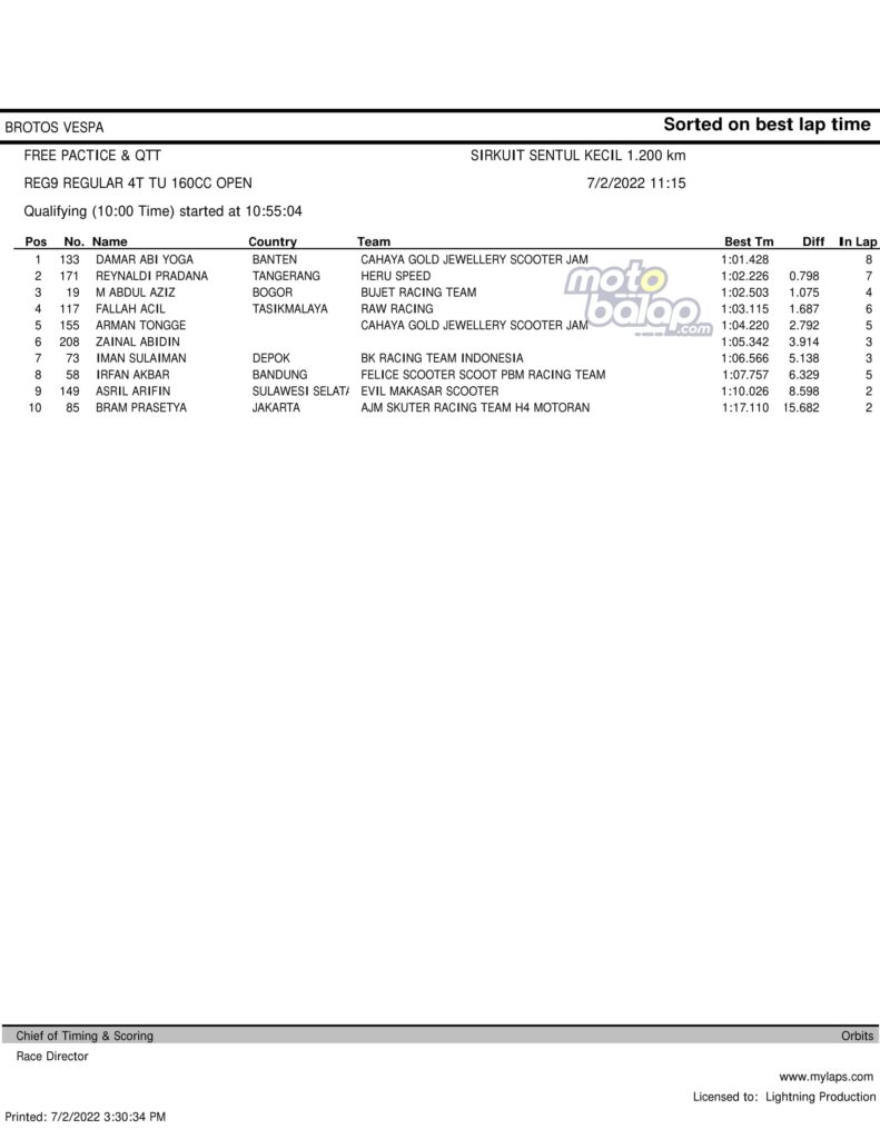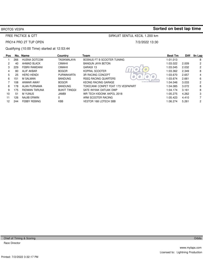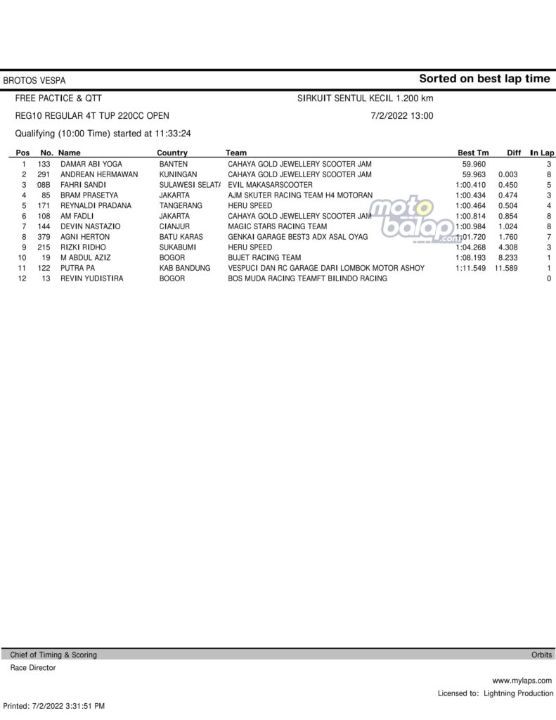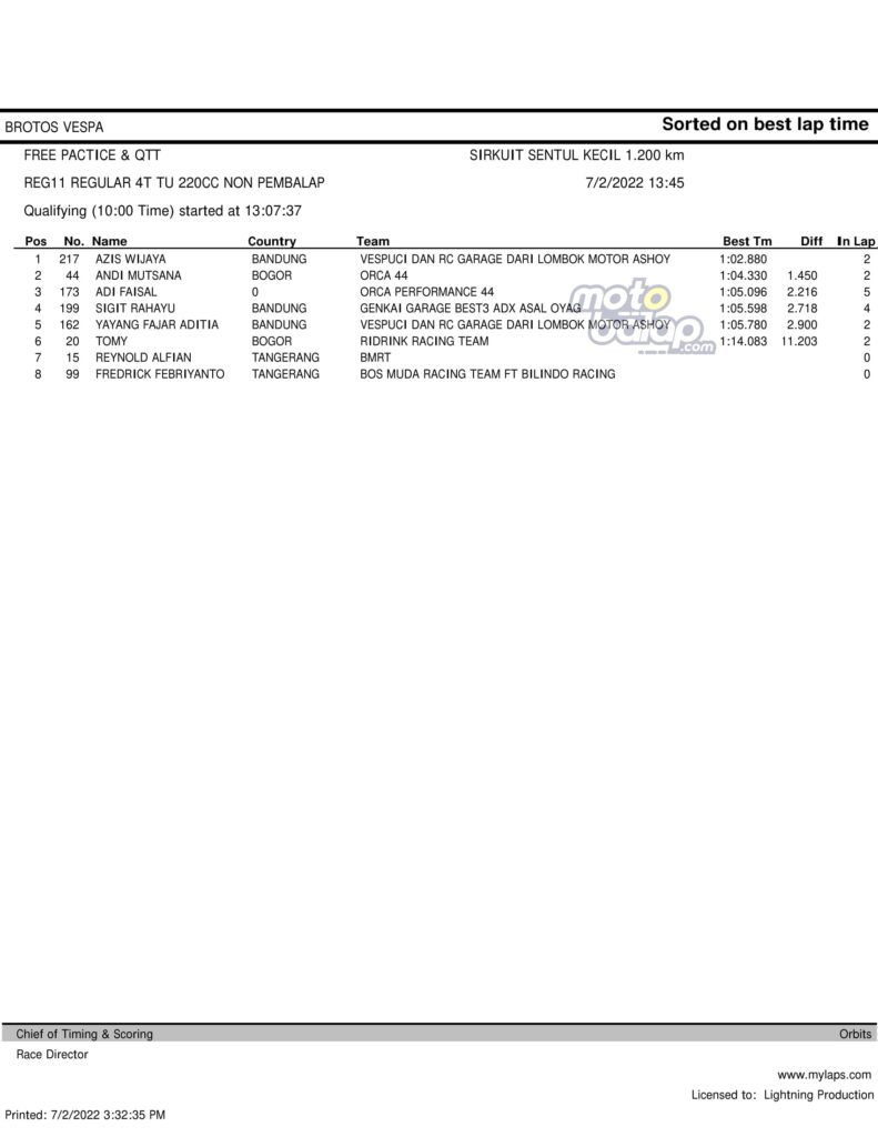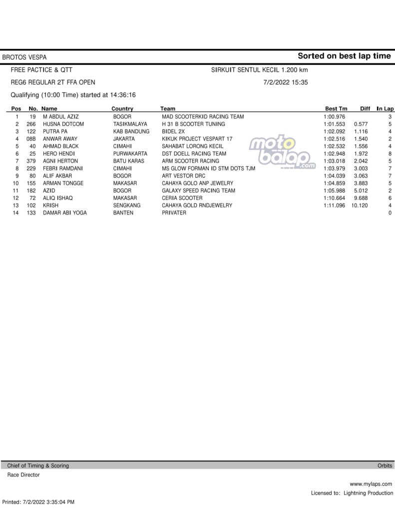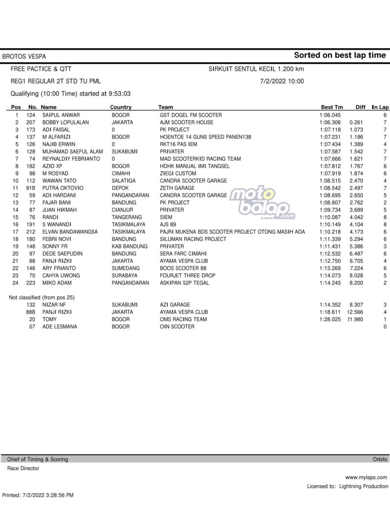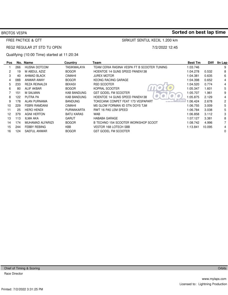Sebanyak 21 kelas yang dipelombakan kategori pemula dan open pada kejuaraaan ini dan diawali dengan sesi qualifikasi maka, di bawah ini merupakan hasil lengkap QTT The Brotos Vespa Race seri II adalah sebagai berikut: