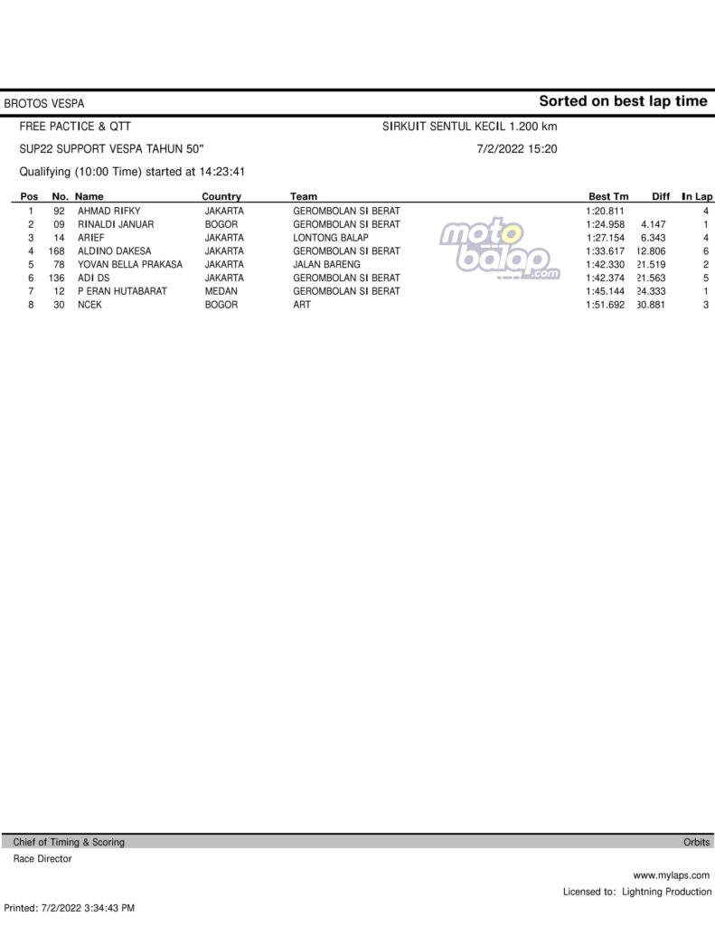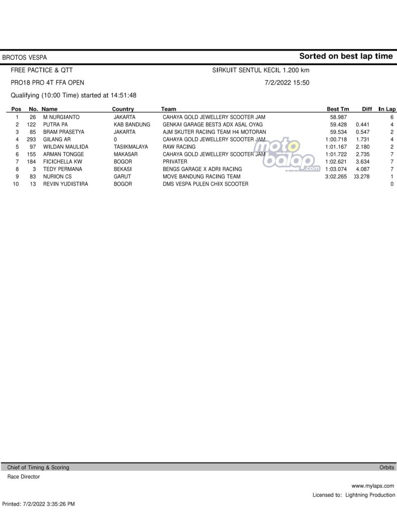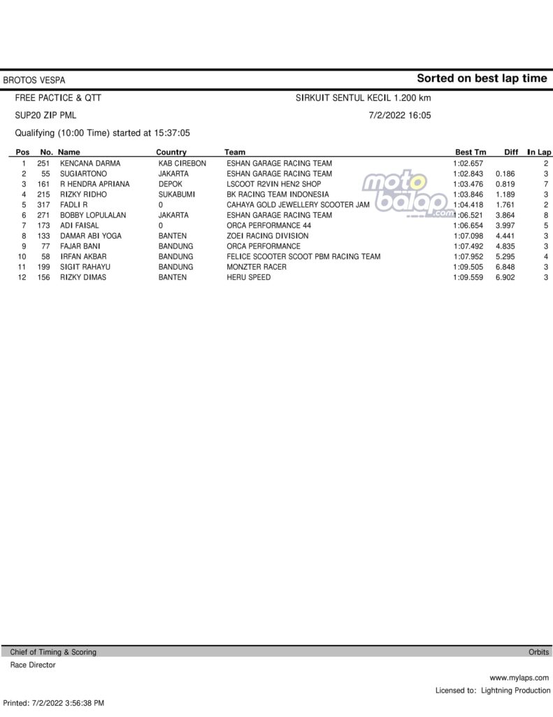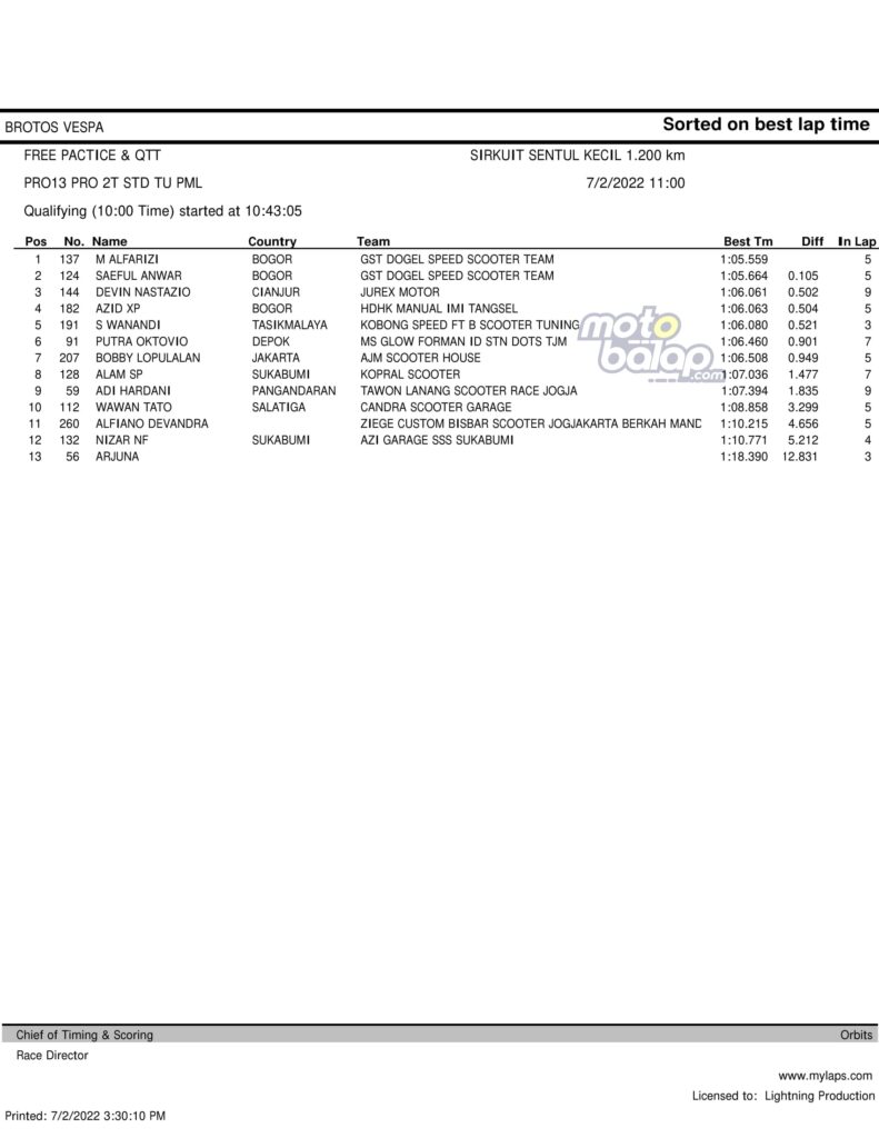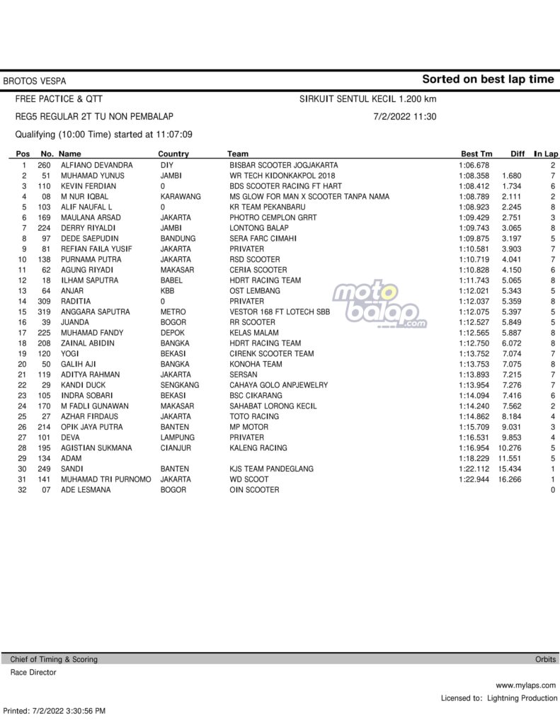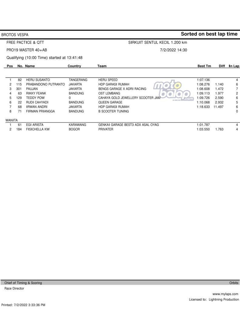 Sebanyak 21 kelas yang dipelombakan kategori pemula dan open pada kejuaraaan ini dan diawali dengan sesi qualifikasi maka, di bawah ini merupakan hasil lengkap QTT The Brotos Vespa Race seri II adalah sebagai berikut: