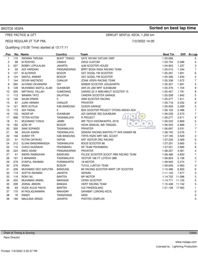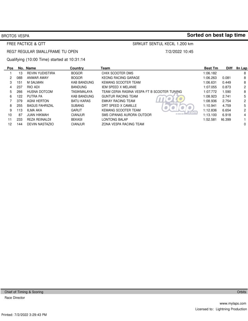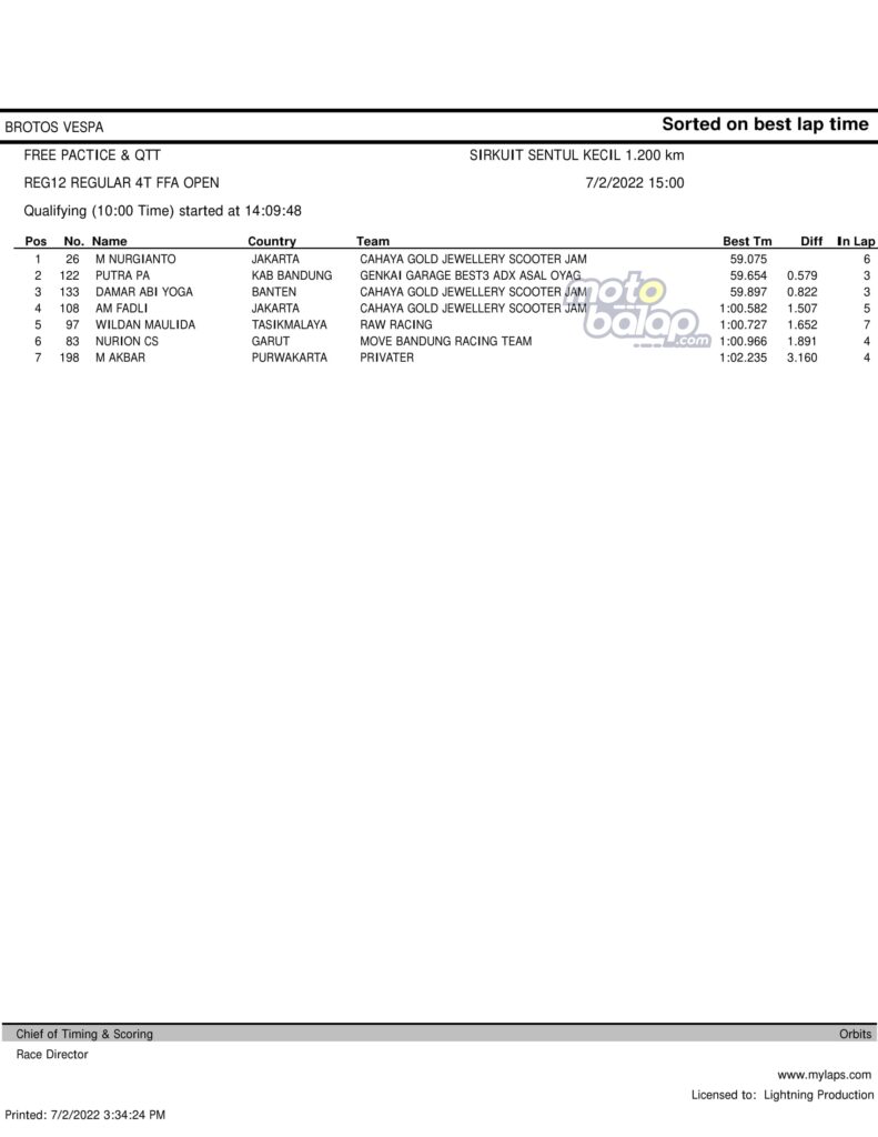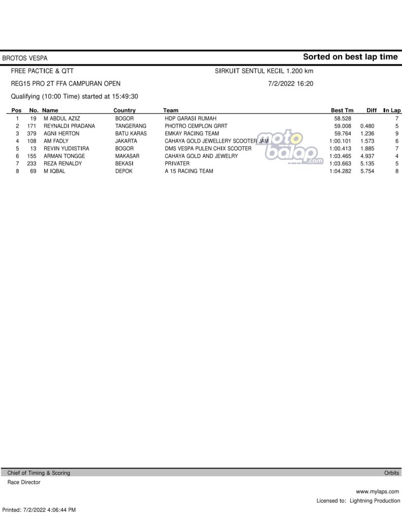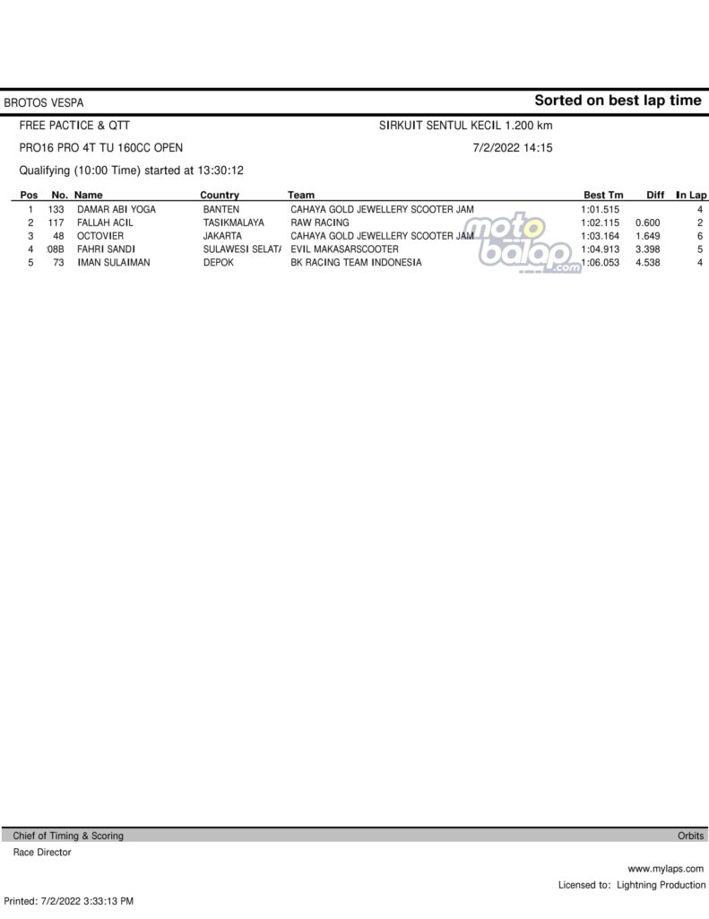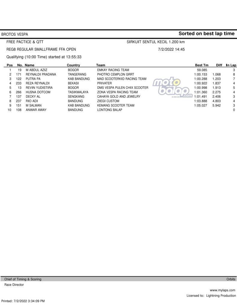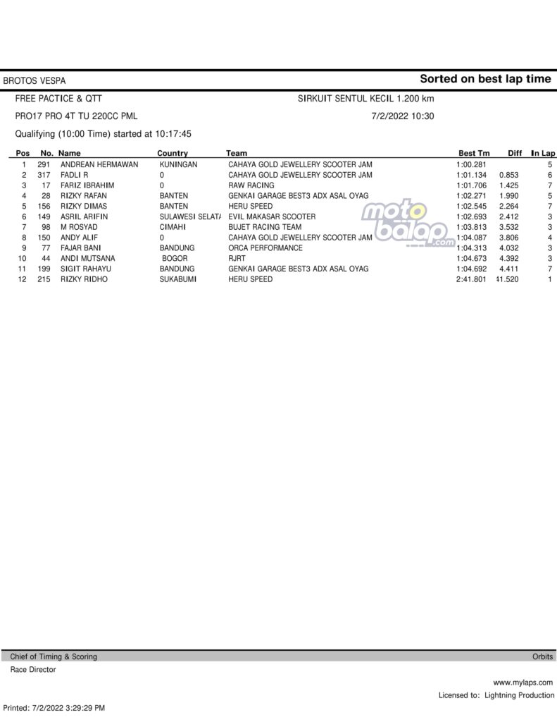 Sebanyak 21 kelas yang dipelombakan kategori pemula dan open pada kejuaraaan ini dan diawali dengan sesi qualifikasi maka, di bawah ini merupakan hasil lengkap QTT The Brotos Vespa Race seri II adalah sebagai berikut: