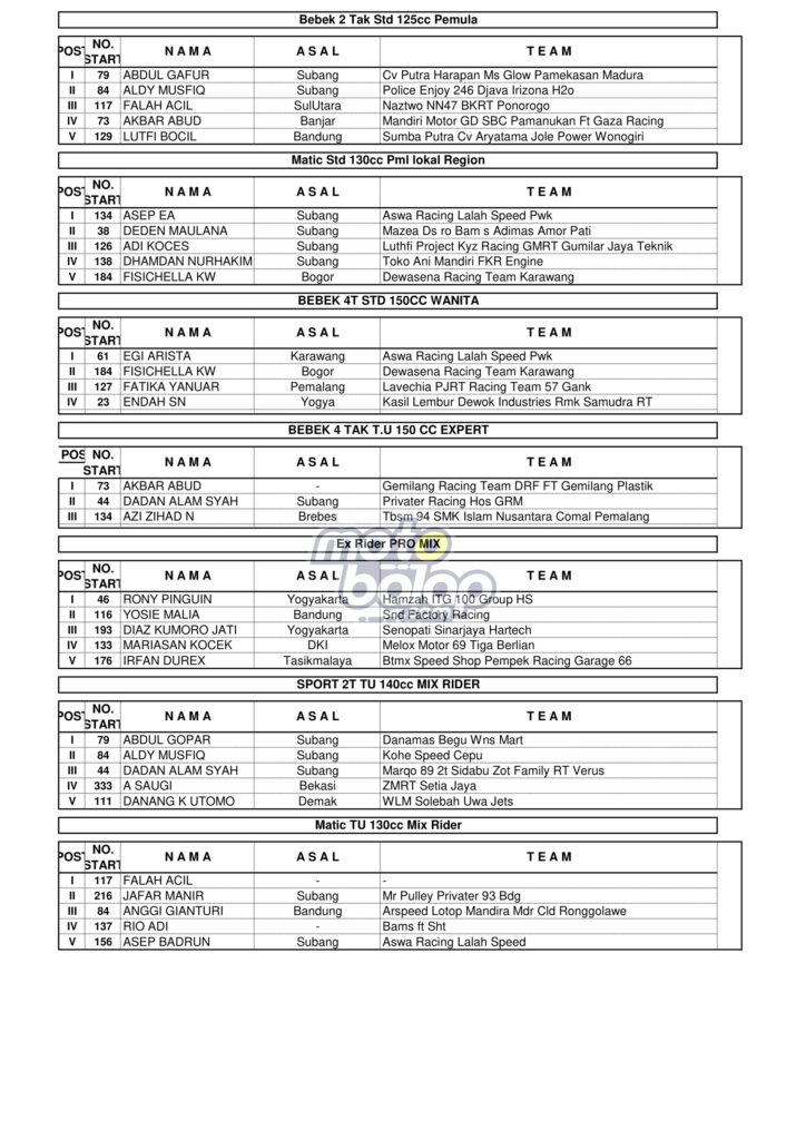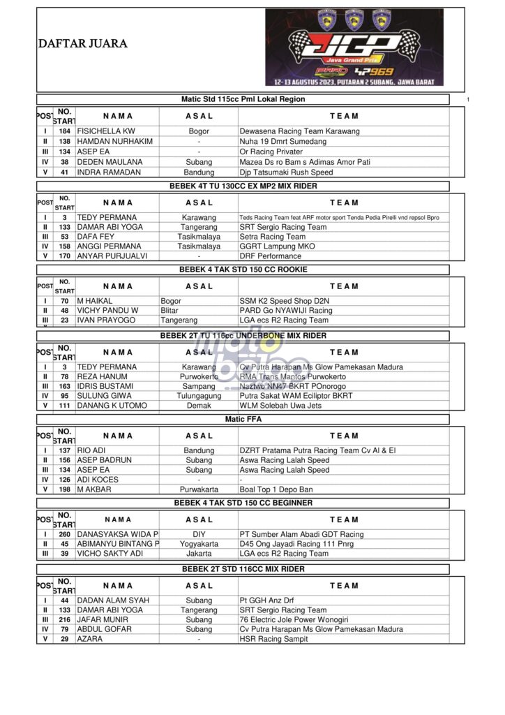 Dari keselurahan kelas yang dilombakan, di bawah ini merupakan Hasil Lengkap Java Grand Prix (JGP) 2023 Putaran 2 Subang adalah sebagai berikut: