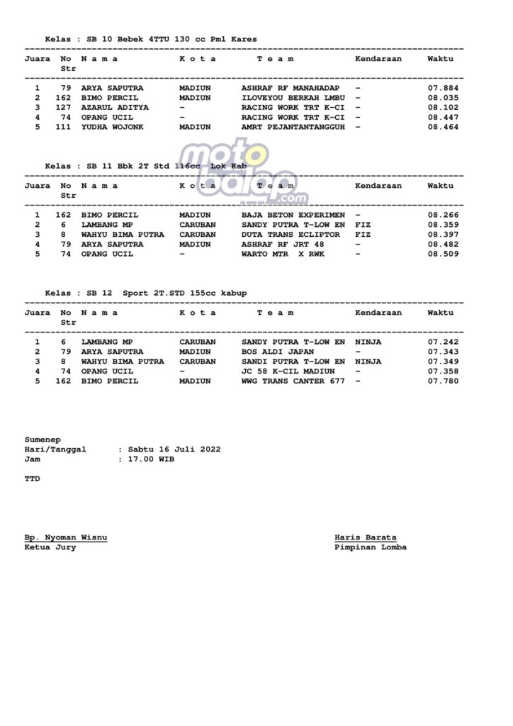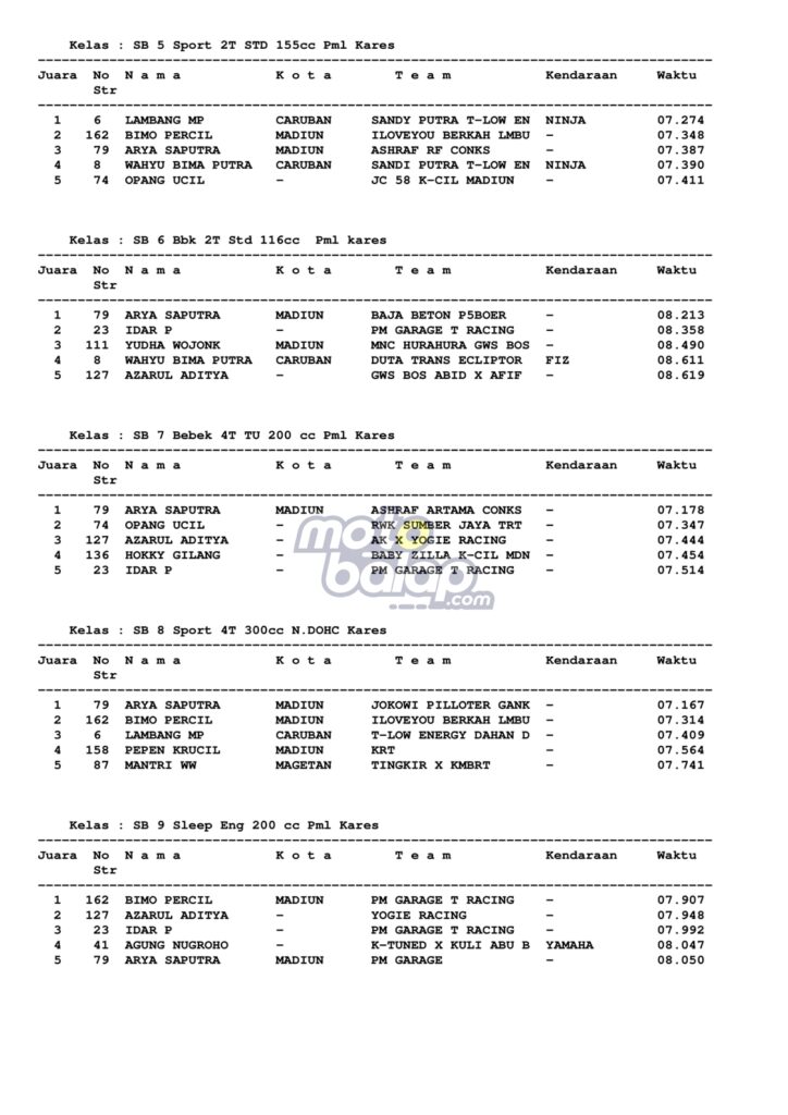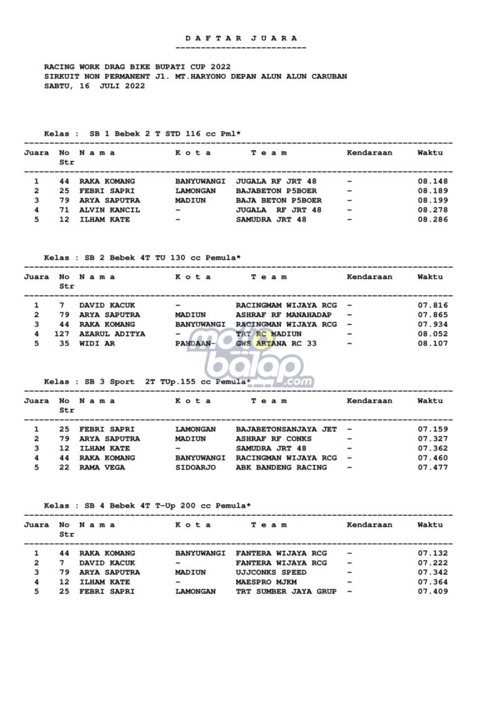 Di bawah ini merupakan hasil lengkap Racing Work Drag Bike Kategori Pemula adlah sebagai berikut:
