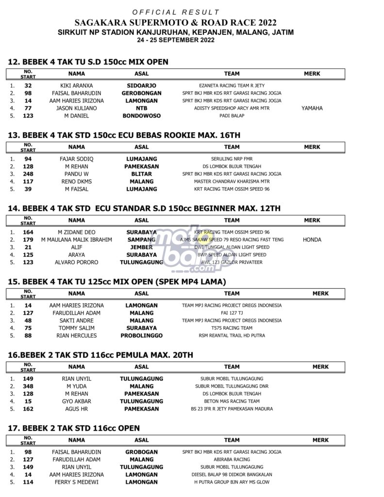 MOTOBALAP.COM – Kejuaraan balap motor bertajuk Sagakara Supermoto & Road Race 2022 di sirkuit non permanen stadion Kanjuruhan, Malang, Jawa Timur, Sabtu-Minggu (24-25/09/2022) berlangsung sengit.