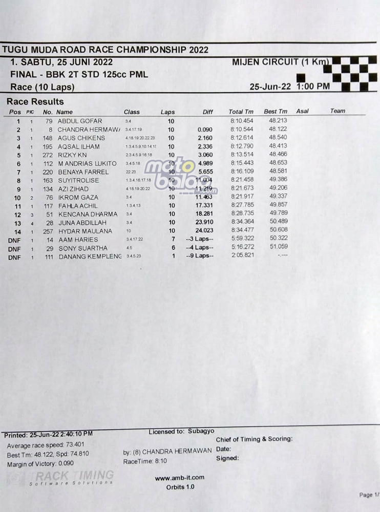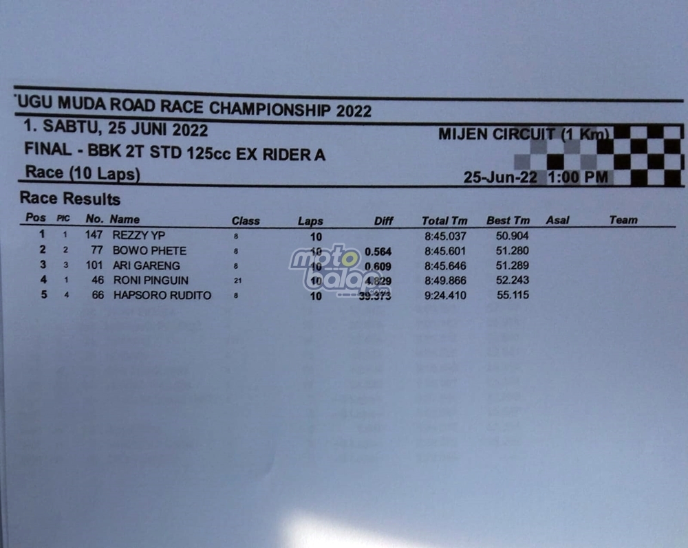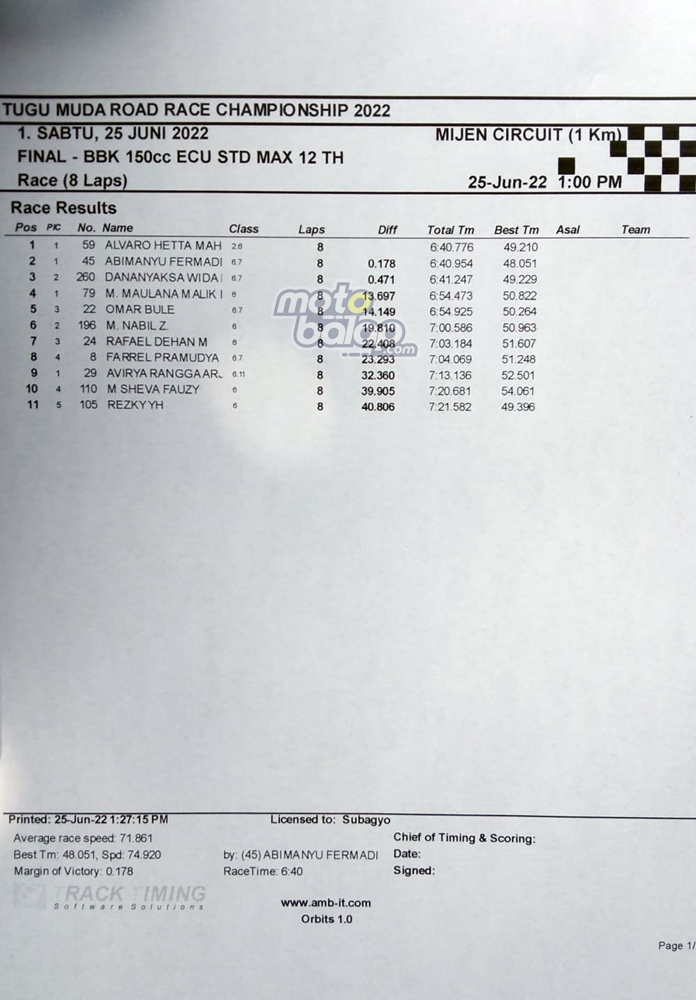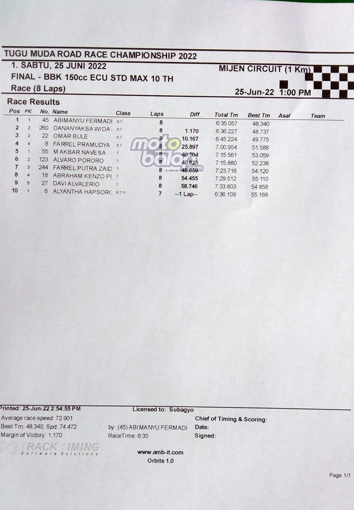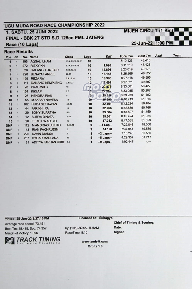 Berikut rangkaian hasil lengkap Tugu Muda Road Race Championship putaran 2 di sirkuit Mijen, Semarang, Sabtu(25/06/2022) adalah sebagai berikut: