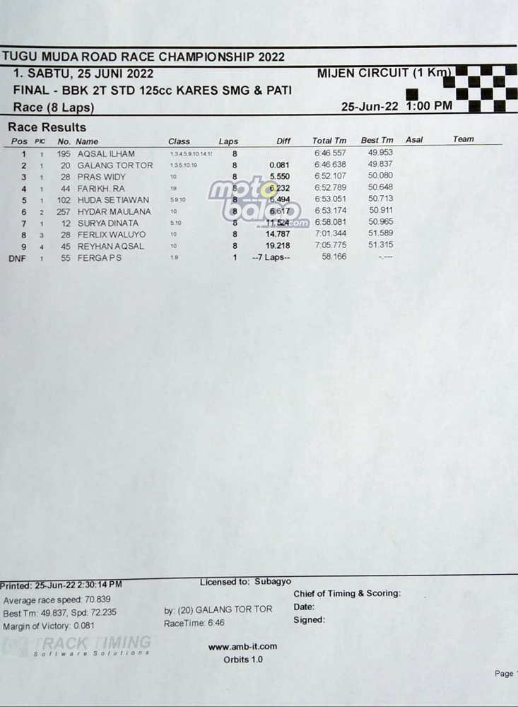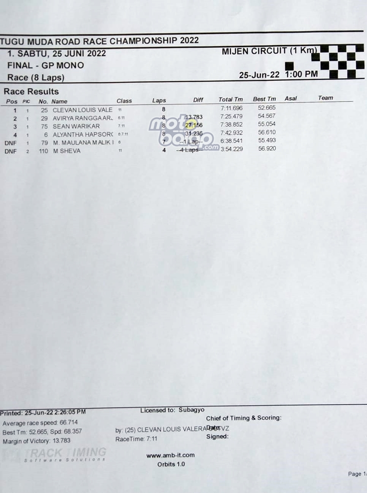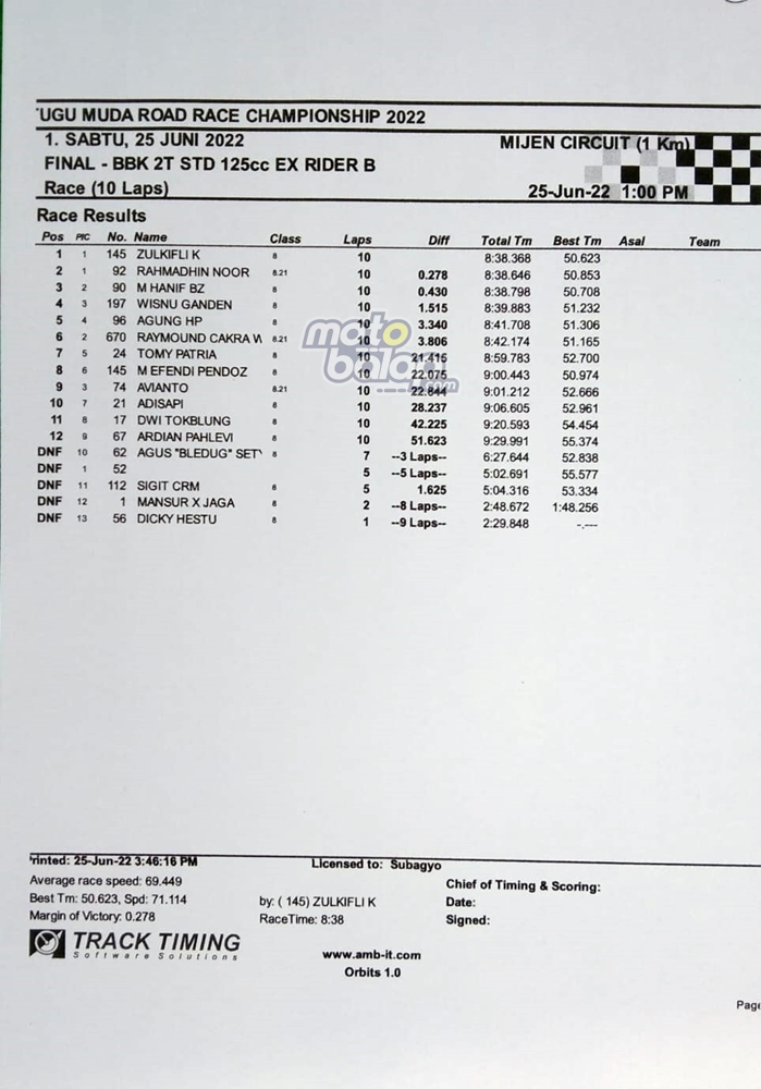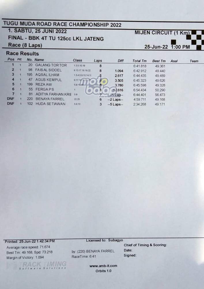 Berikut rangkaian hasil lengkap Tugu Muda Road Race Championship putaran 2 di sirkuit Mijen, Semarang, Sabtu(25/06/2022) adalah sebagai berikut: