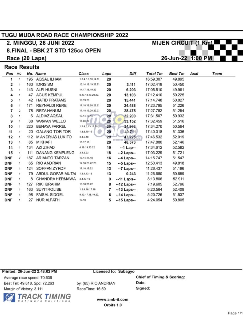 MOTOBALAP.COM – Berikut rangkaian hasil lengkap Tugu Muda Road Race Championship Putaran 2 yang dihelat di sirkuit Mijen, Semarang, Minggu (26/06/2022) adalah sebagai berikut: