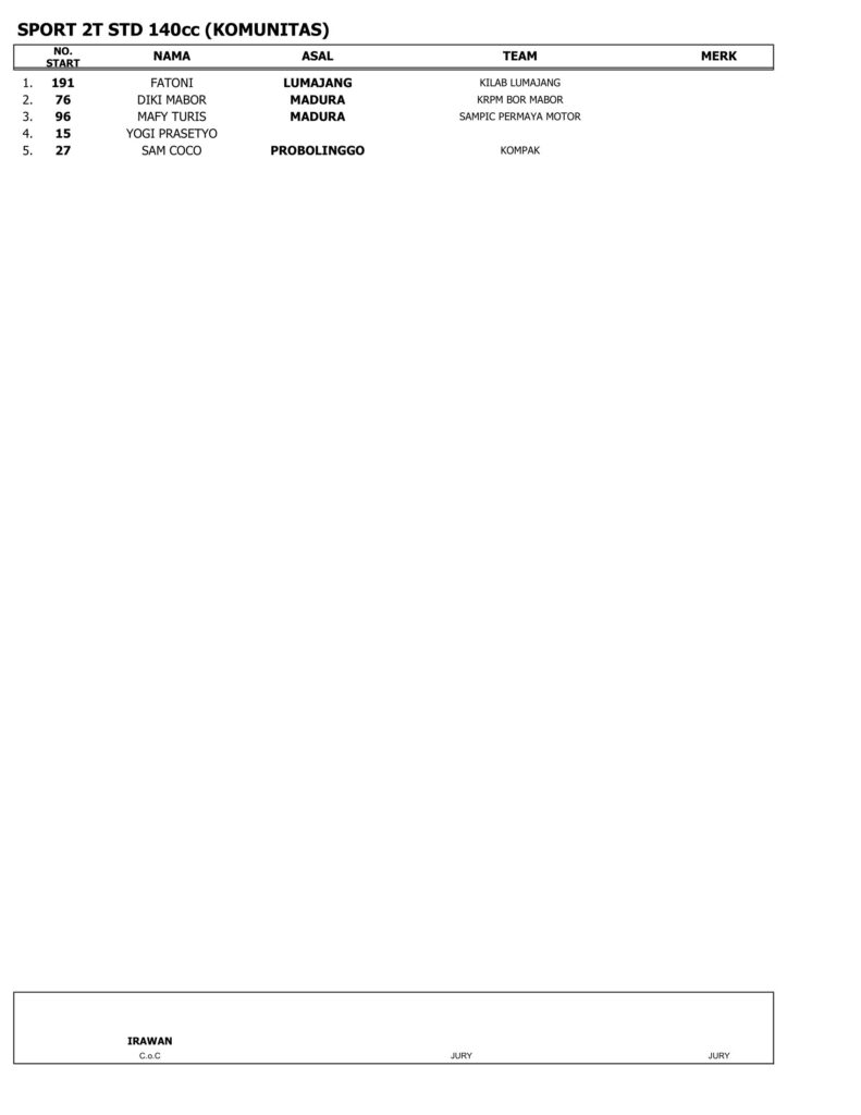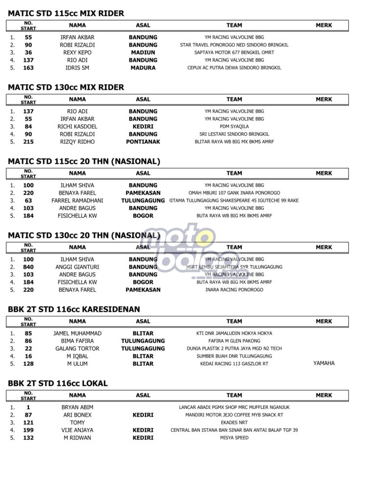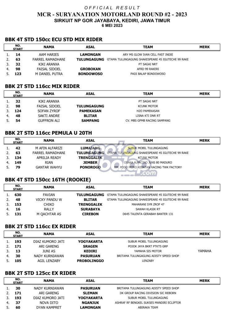 Di Bawah ini merupakan Hasil MCR-Suryanation Motorland Putaran 2 Kediri (Sabtu) adalah sebagai berikut: