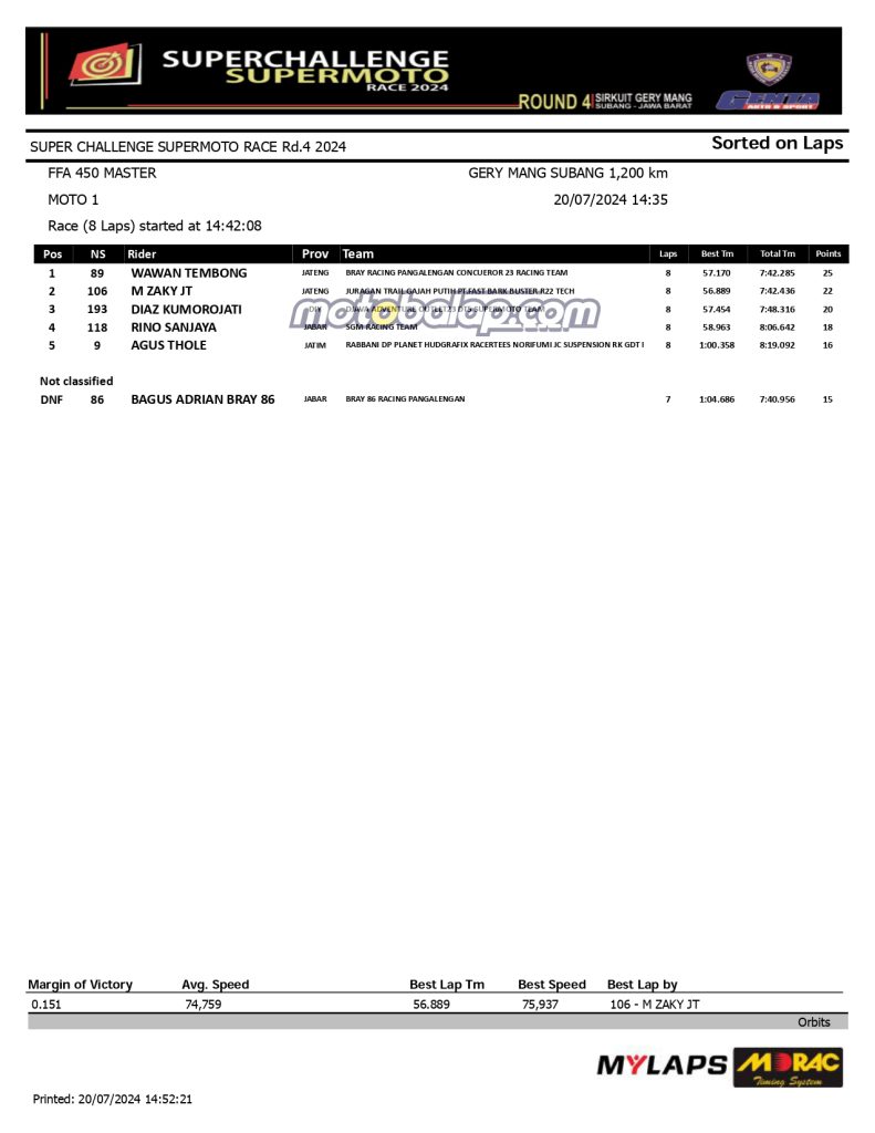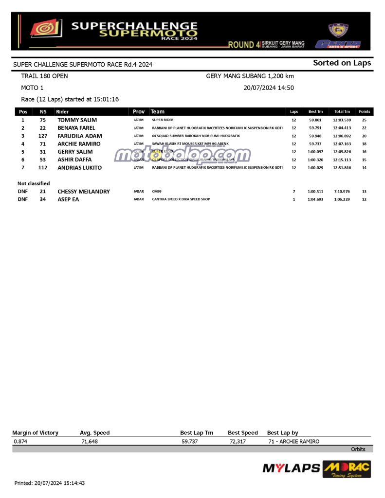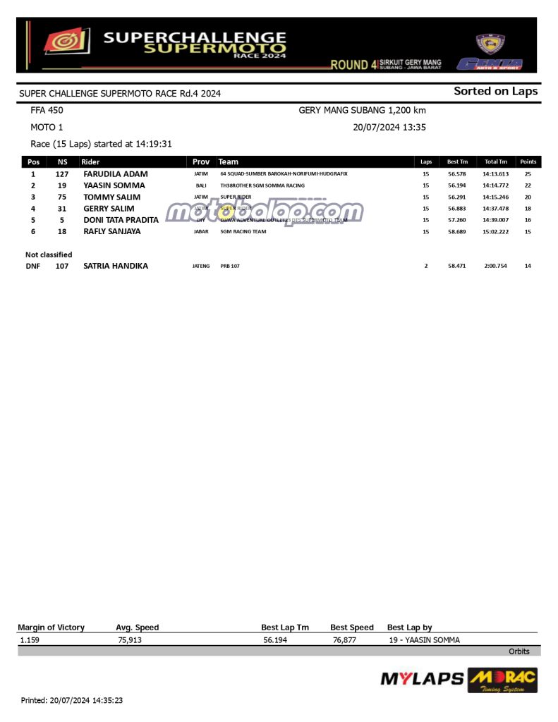 MOTOBALAP.COM- Berikut ini adalah hasil Kualifikasi Kejurnas Super Challenge Supermoto Race 2024 berlangsung hari ini Sabtu 20 Juli 2024 Di Sirkuit Gerymang Subang, Jawa Barat.