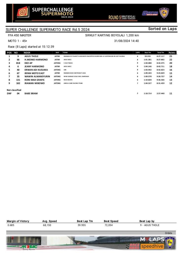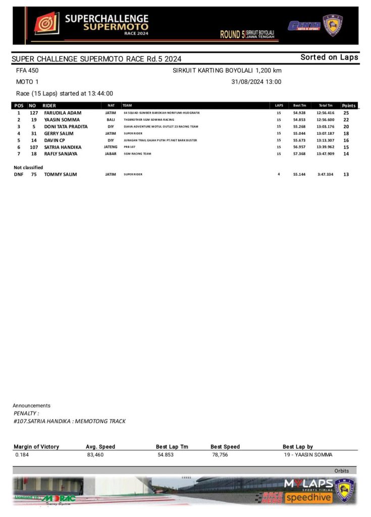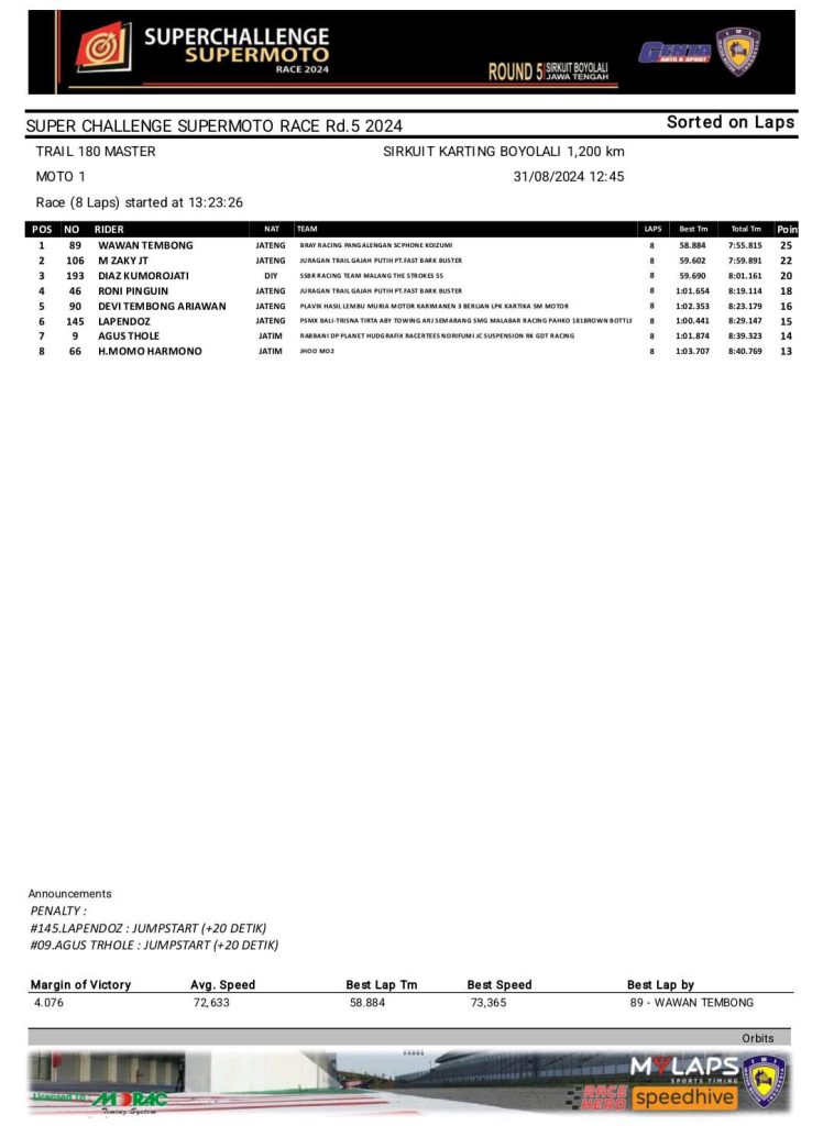 Dari keselurahan kelas yang dilombakan, di bawah ini merupakan Hasil Moto 1 Superchallenge Supermoto Race Seri 5 Boyolali adalah sebagai berikut:
