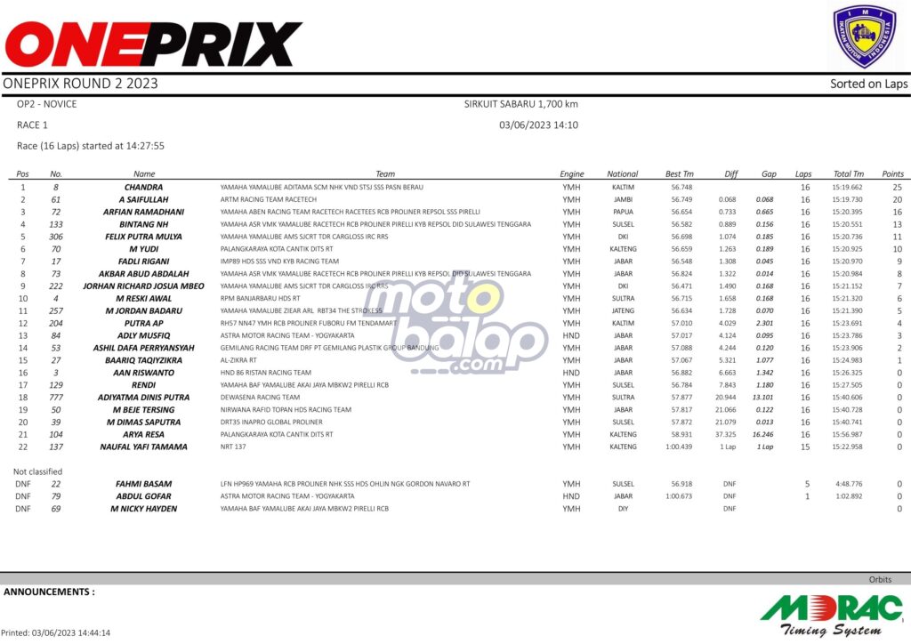 Dari kesulurahan kelas yang dilombakan, di bawah ini merupakan Hasil Oneprix Putaran 2 Race 1 Palangkaraya adalah sebagai berikut: