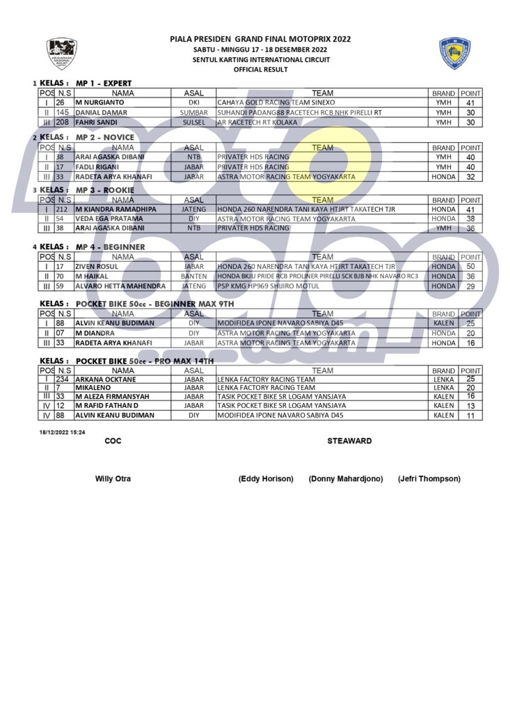 Hasil Piala Presiden Grand Final Motoprix 2022, Sentul Karting International Circuit