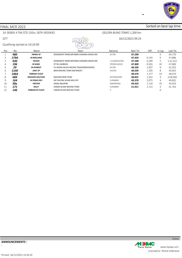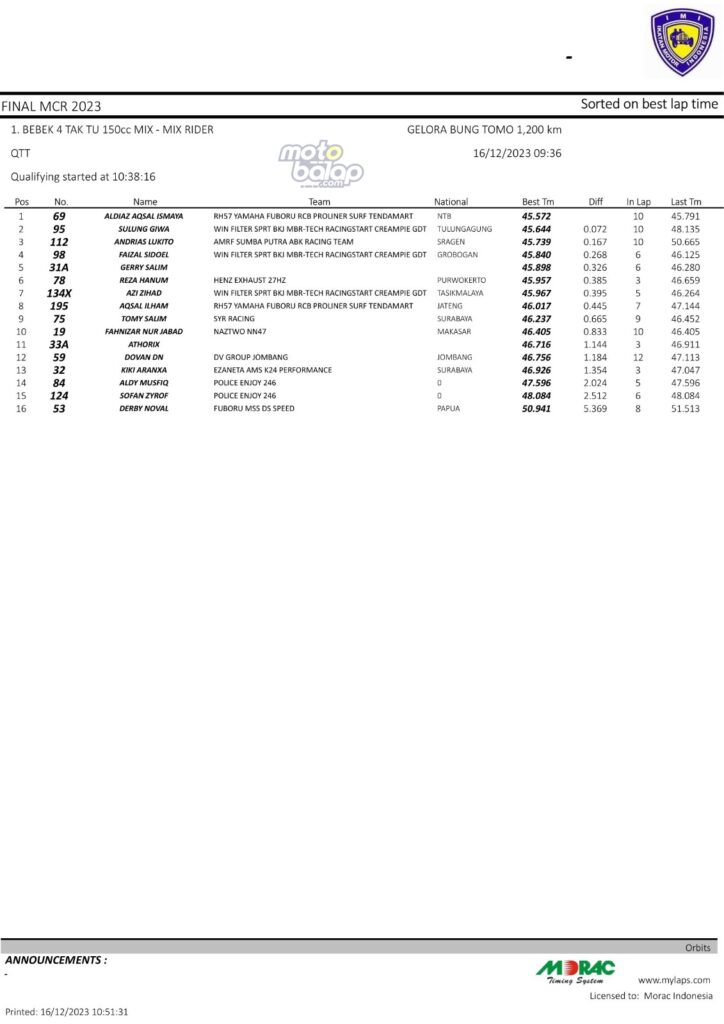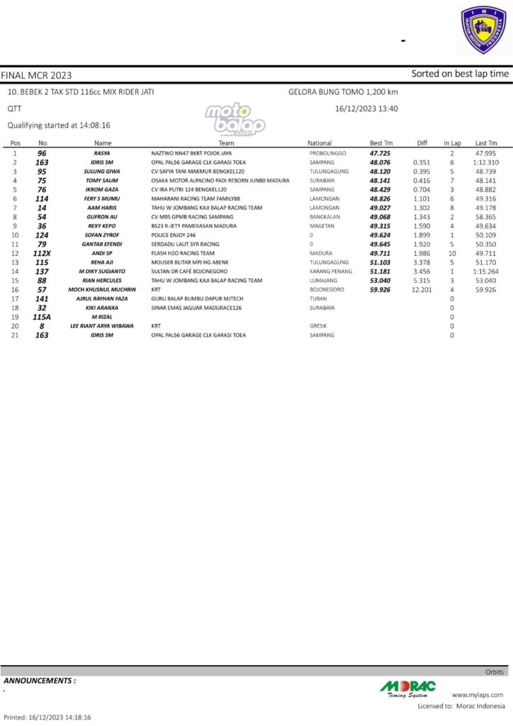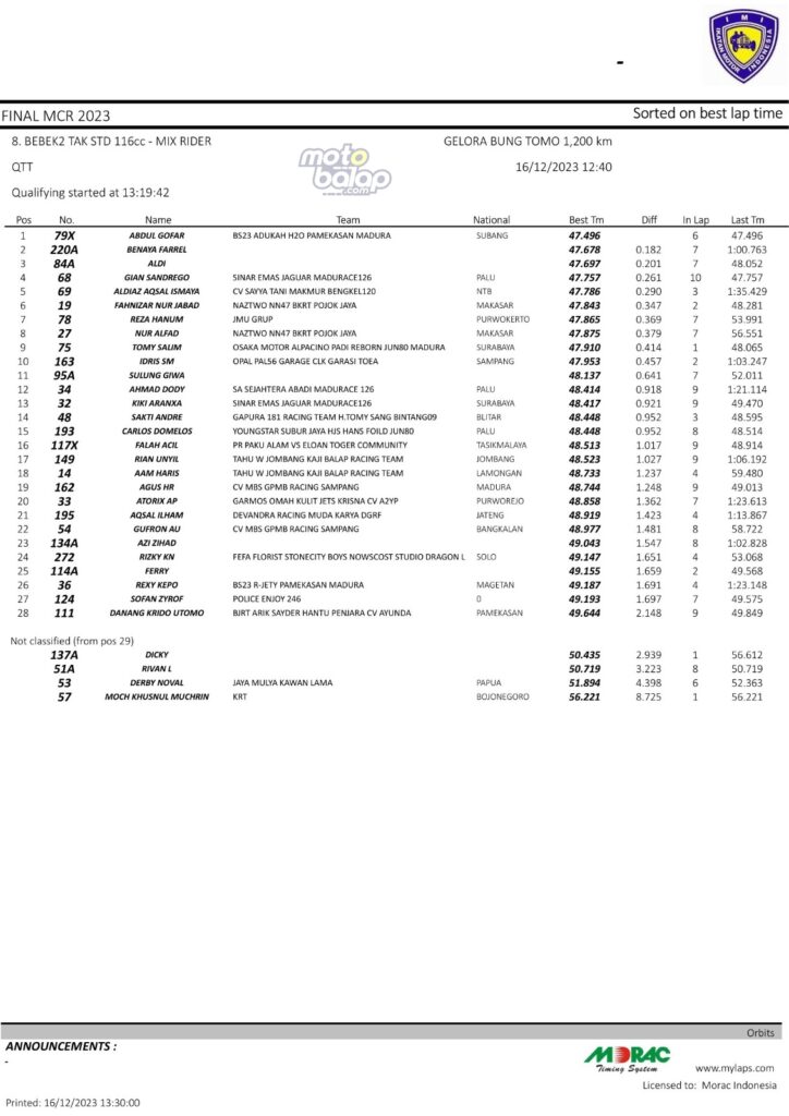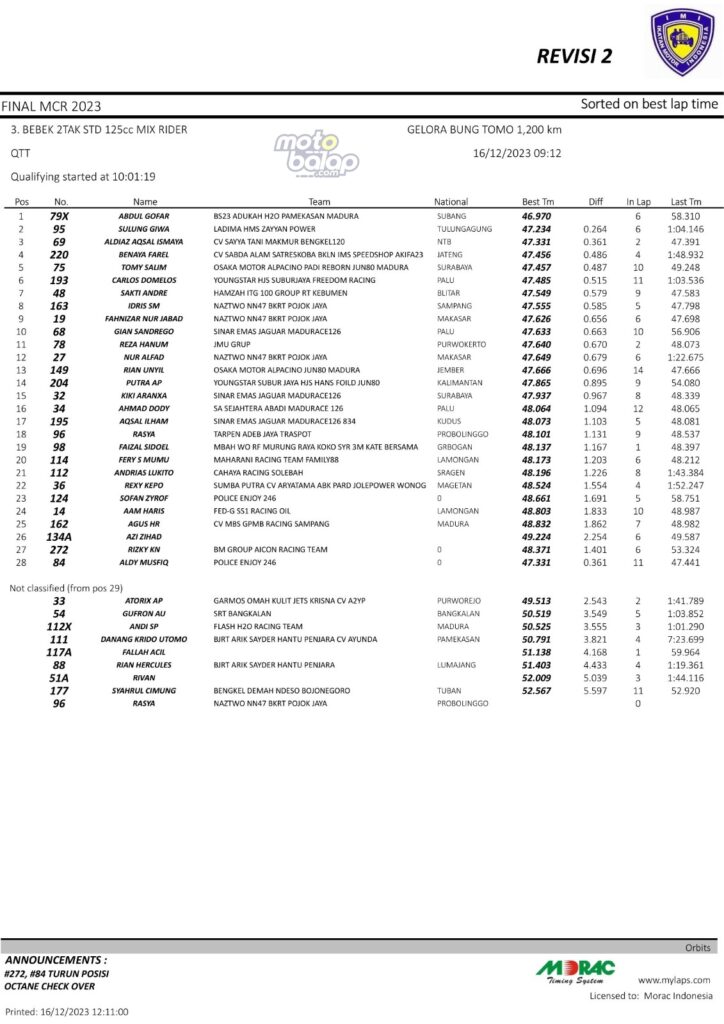 Dari keselurahan kelas yang dilombakan, di bawah ini merupakan Hasil QTT Final Matapanah Cup Race 2023 Surabaya sebagai berikut: