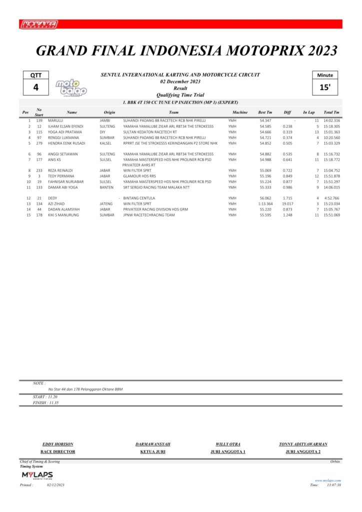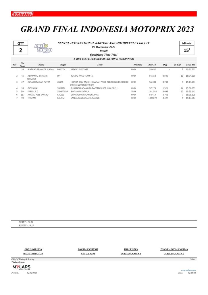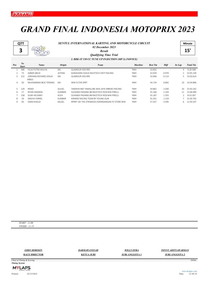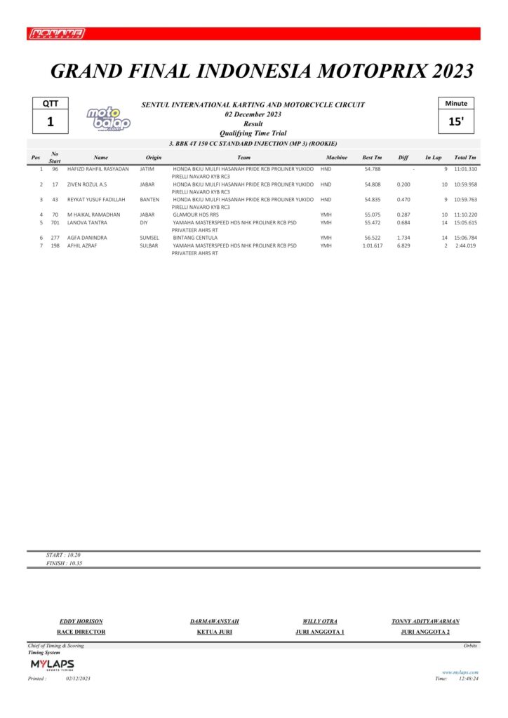 Dari keselurahan kelas yang dilombakan, di bawah ini merupakan Hasil QTT Grand Final Kejurnas Motoprix 2023 Sentul Kecil adalah sebagai berikut: