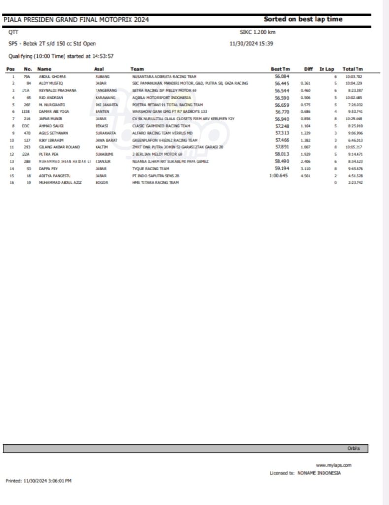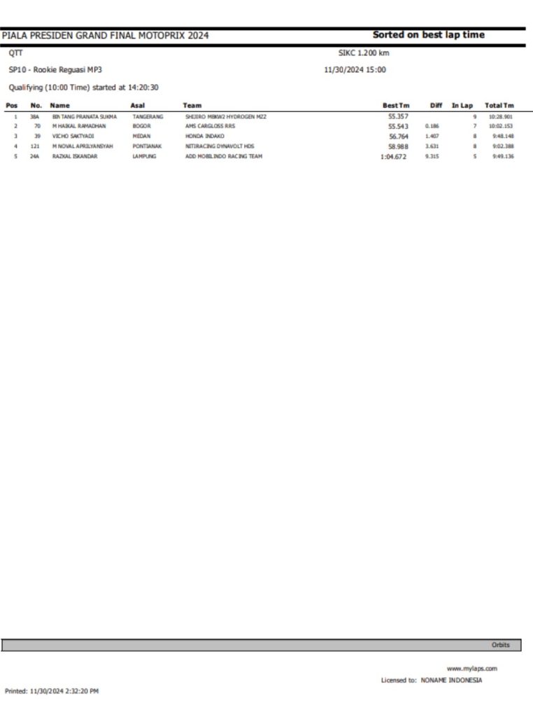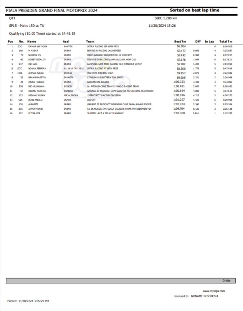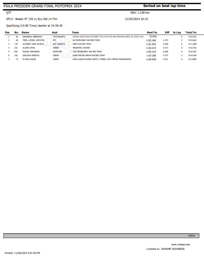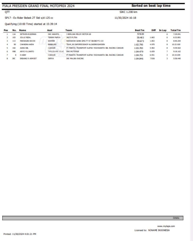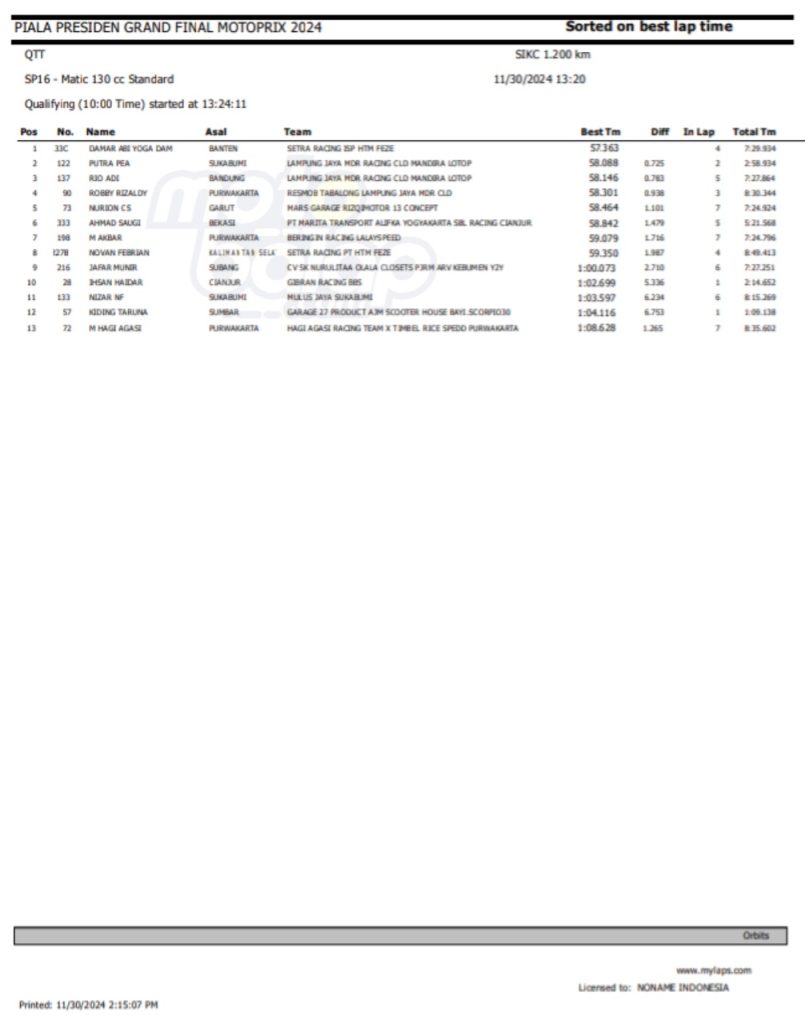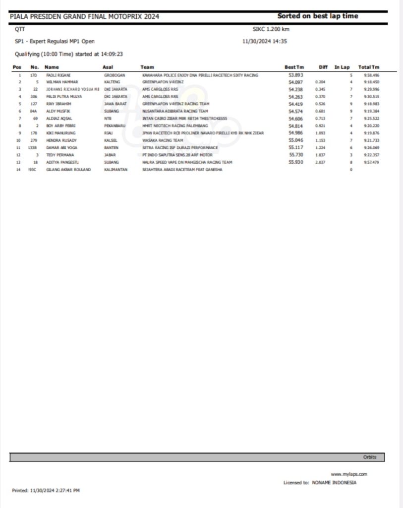 Dari keseluruhan kelas yang lombakan, di bawah ini merupakan Hasil QTT Grand Final Motoprix dan Indoclub Championship 2024 adalah sebagai berikut: