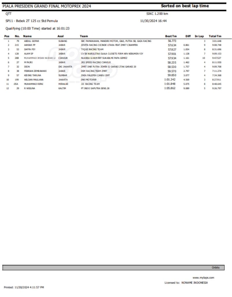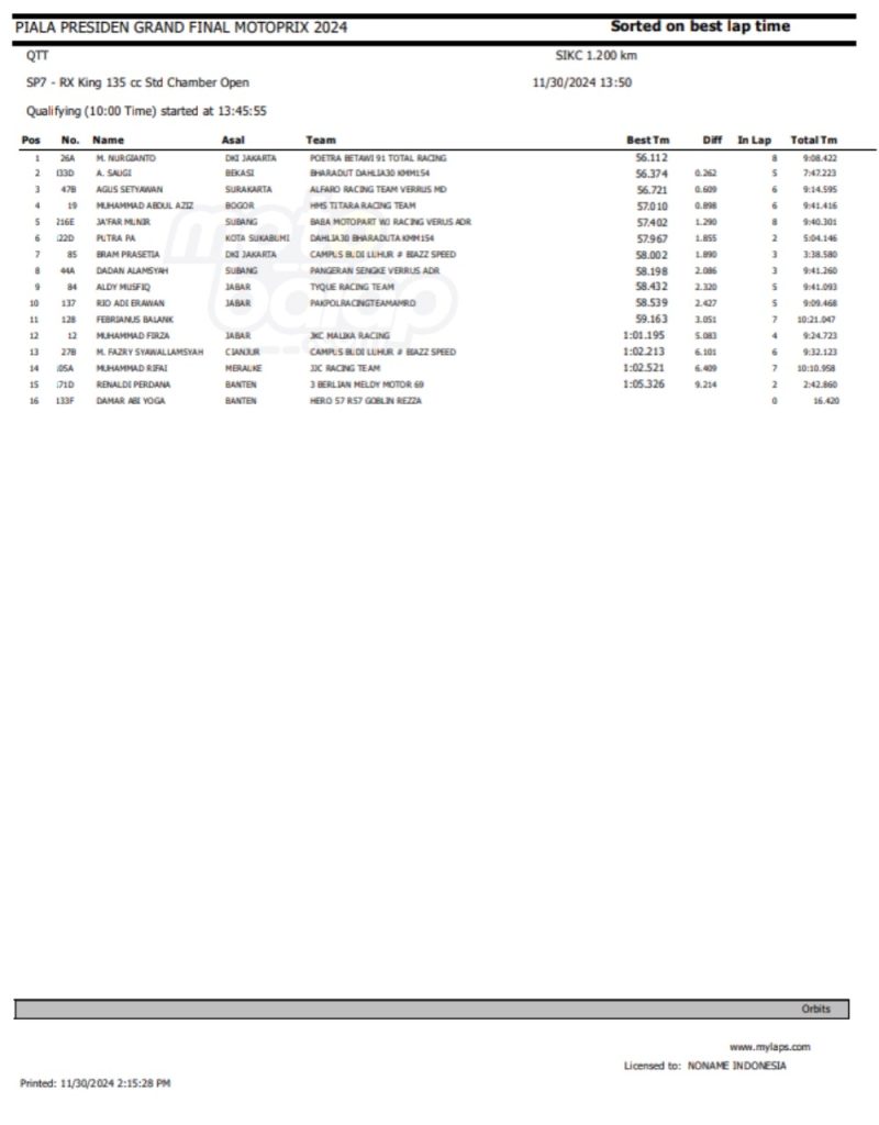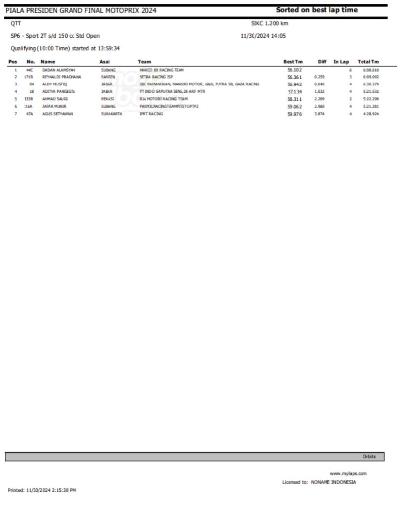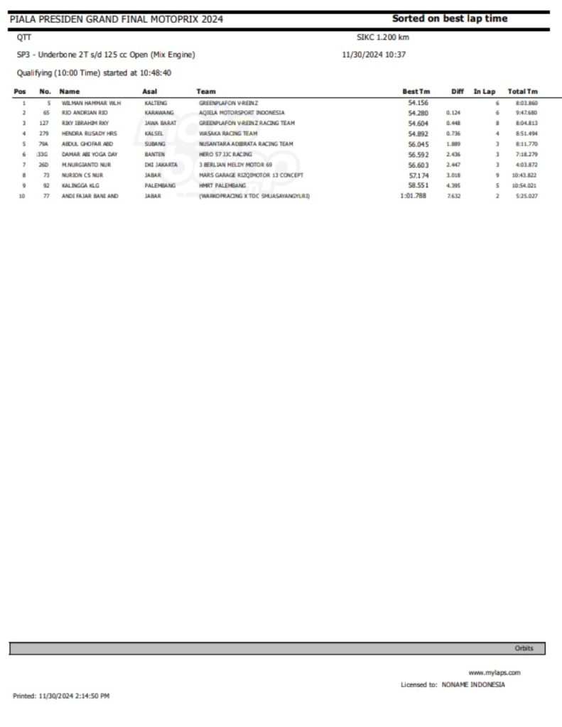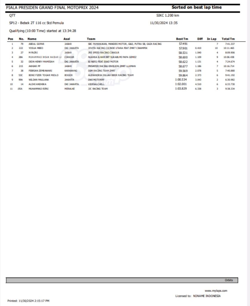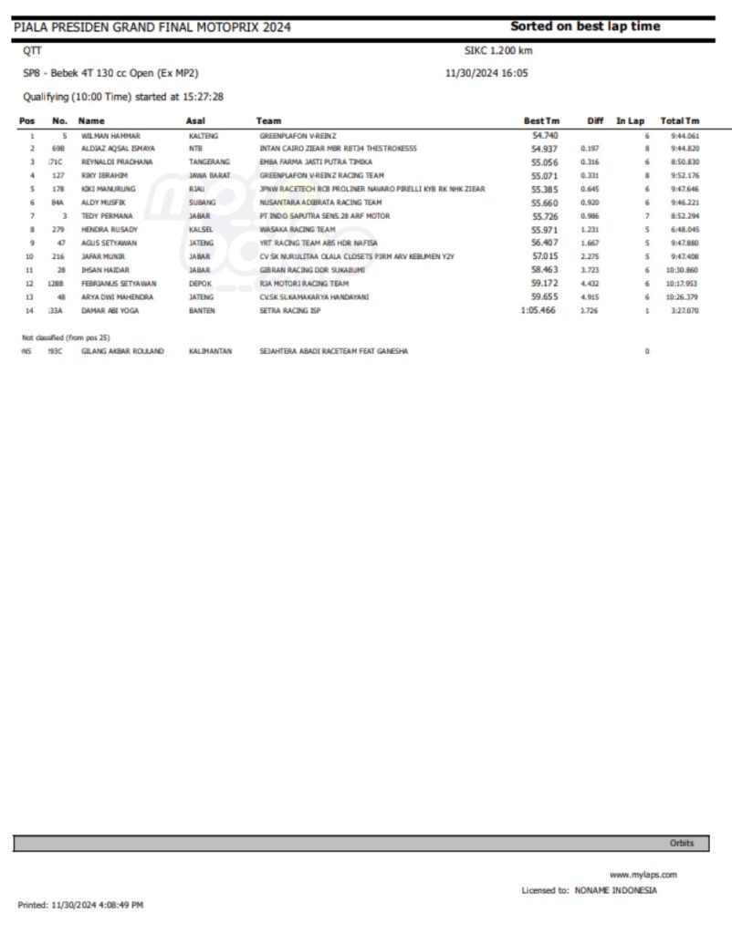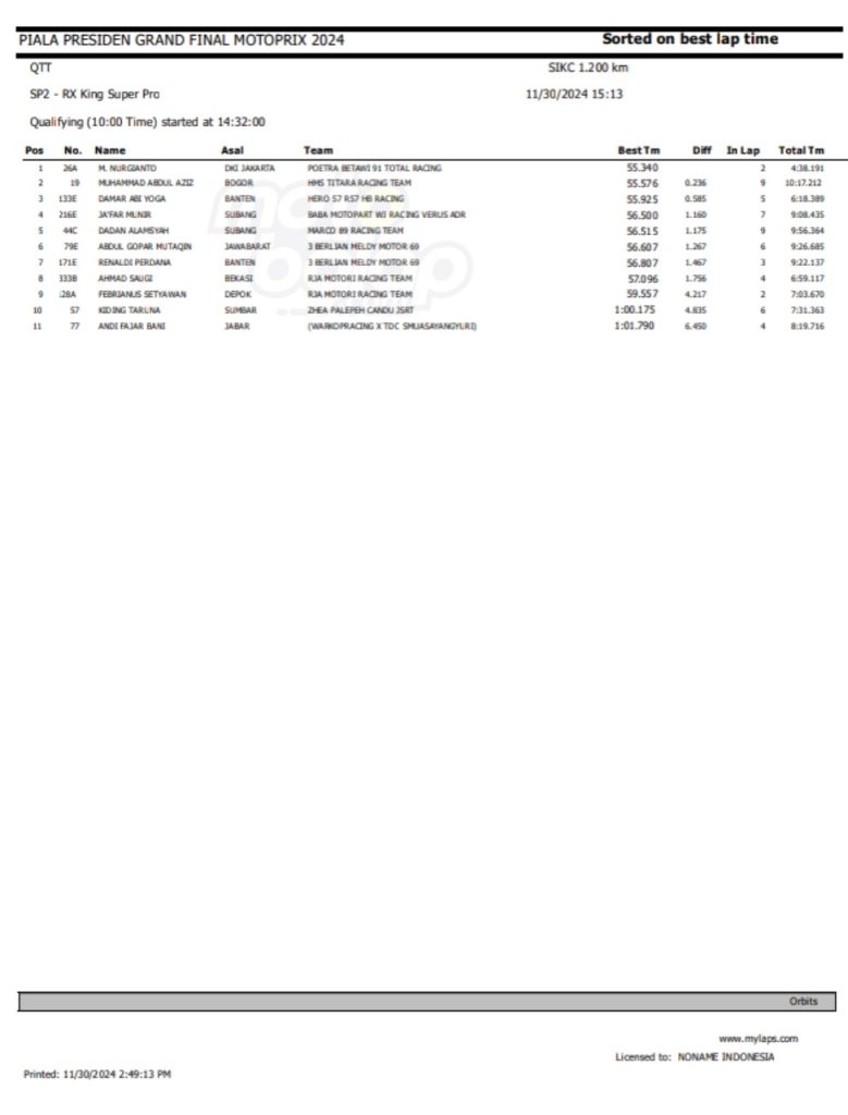 Dari keseluruhan kelas yang lombakan, di bawah ini merupakan Hasil QTT Grand Final Motoprix dan Indoclub Championship 2024 adalah sebagai berikut: