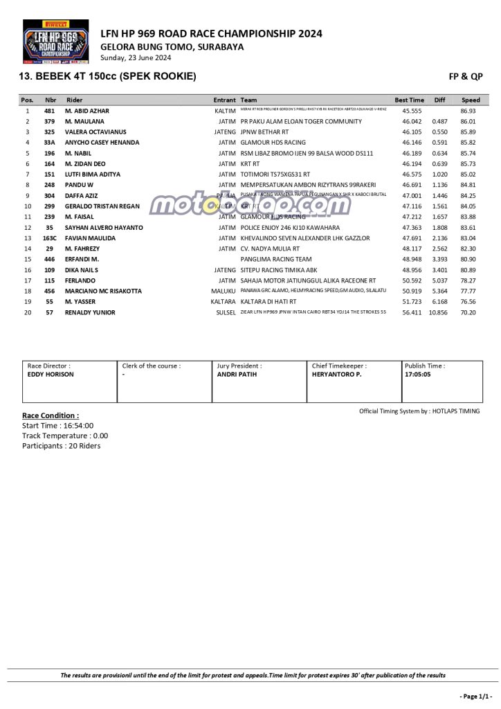 MOTOBALAP.COM- Berikut adalah hasil lengkap kualifikasi LFN HP969 Road Race Championship 2024 putaran pertama yang berlangsung di sirkuit Gelora Bung Tomo (GBT) Surabaya pada Minggu 23 Juni 2024.