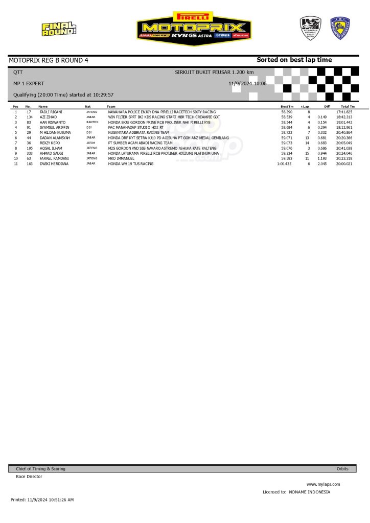 Fadli, yang tampil dengan penuh percaya diri, mencatatkan waktu tercepatnya dengan 58.390 detik. Dengan hasil ini, Fadli akan memulai balapan dari posisi paling depan pada kelas MP1 Expert memberikan peluang besar untuk meraih podium utama di final Kejurnas Motoprix kali ini.