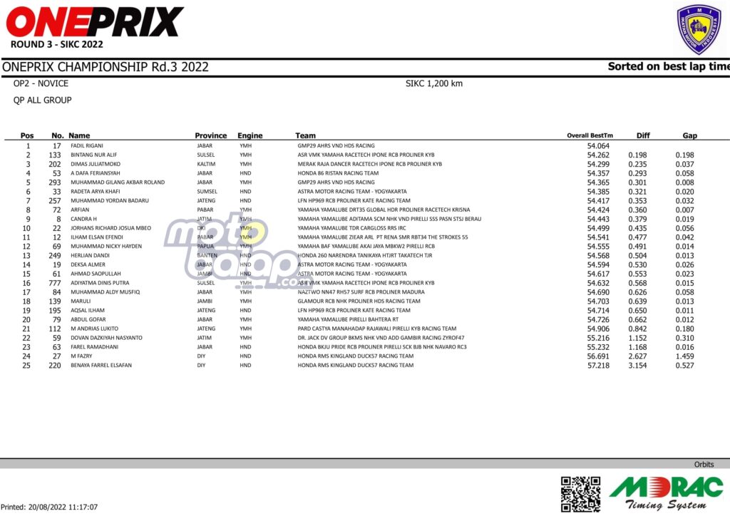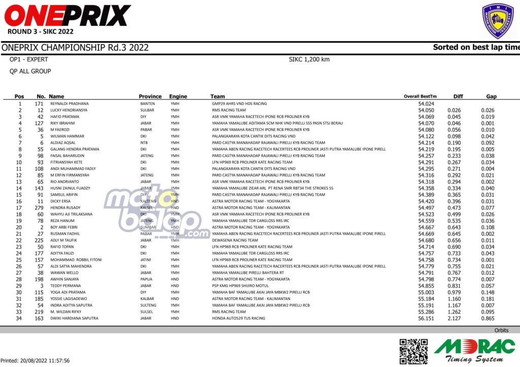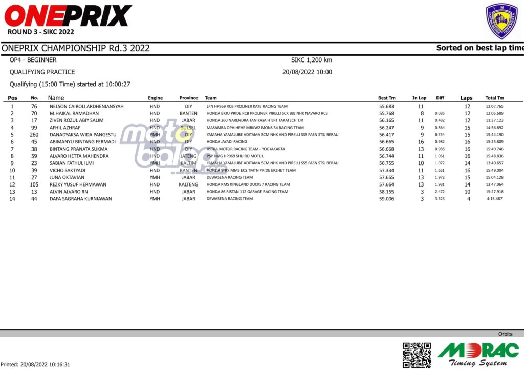 MOTOBALAP.COM – Kejuaraan nasional (kejurnas) balap motor bergengsi di Indonesia bertajuk Oneprix Indonesia Motorprix Championship putaran 3 di Sentul International Karting Circuit, Bogor, Jawa Barat, Sabtu (20/08/2022) telah berlangsung sesi kualifikasi.