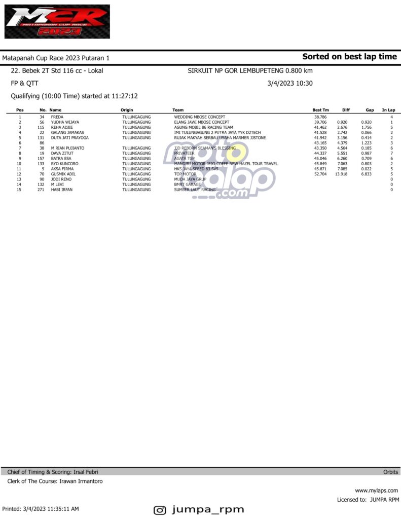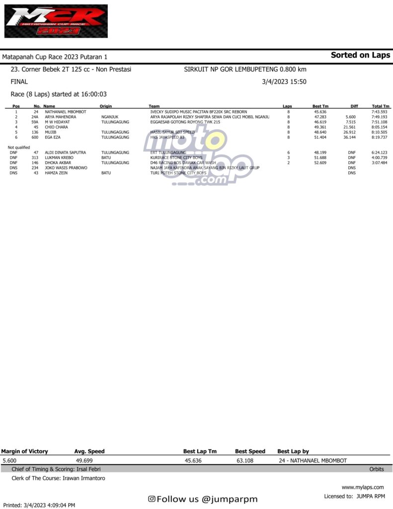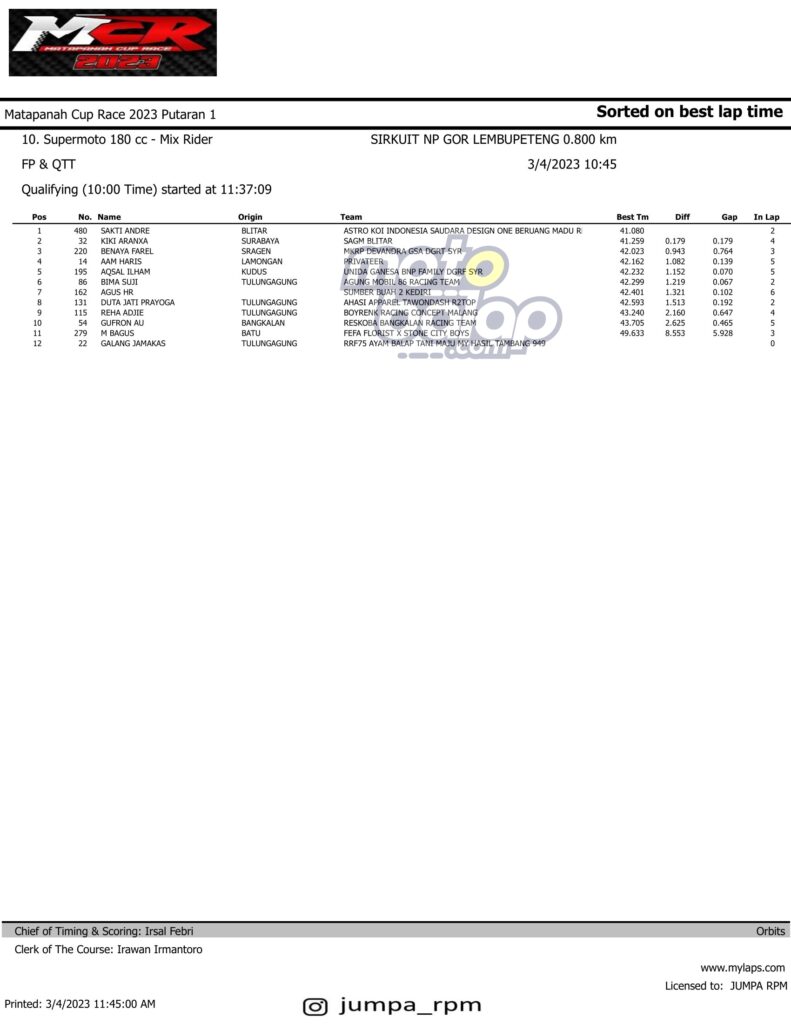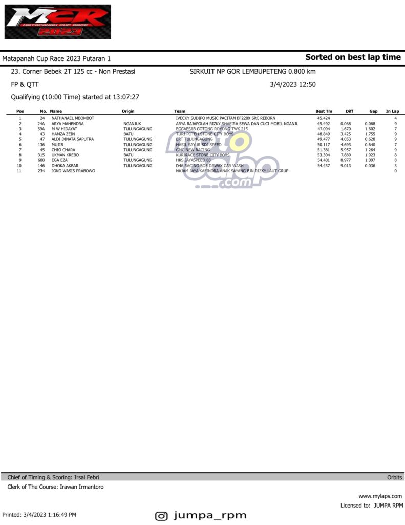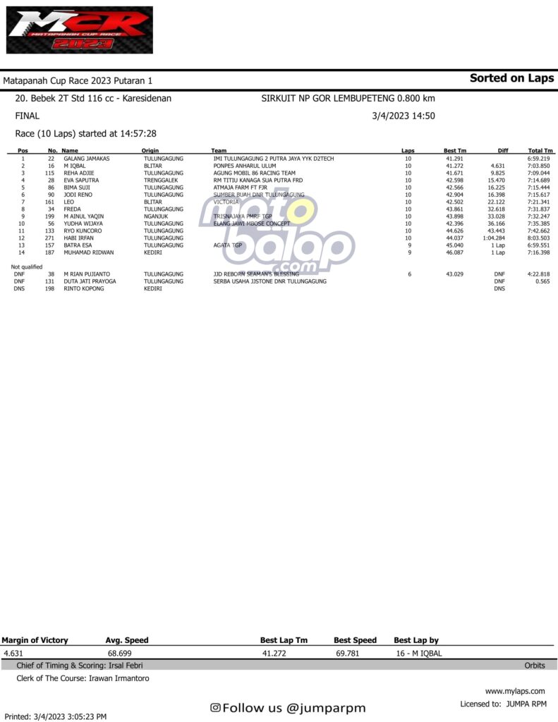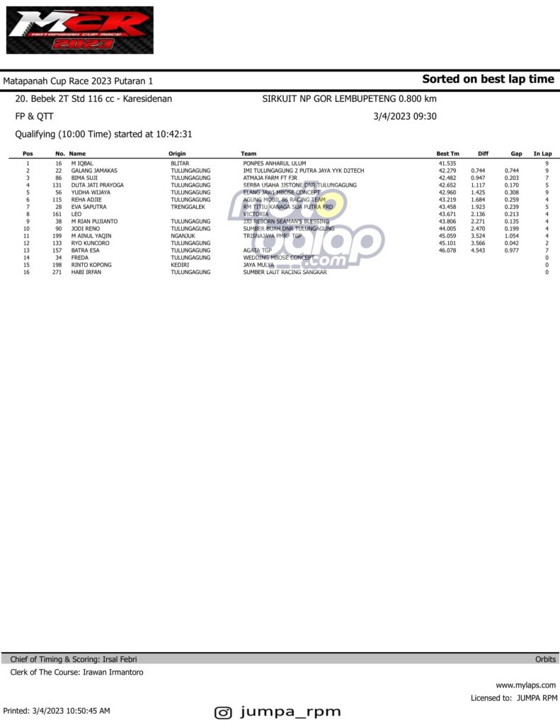 Dari keseluruhan QTT dan Race yang dilombakan, di bawah ini merupakan Hasil QTT & Race Mata Panah Cup Race (MCR) 2023 Tulungagung Sabtu adalah sebagai berikut: