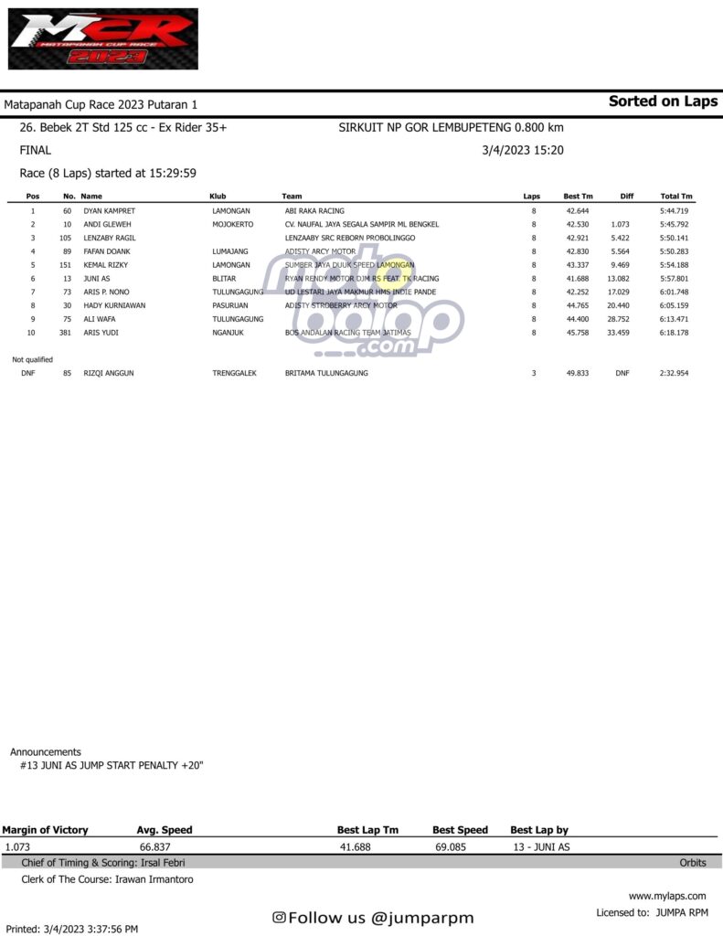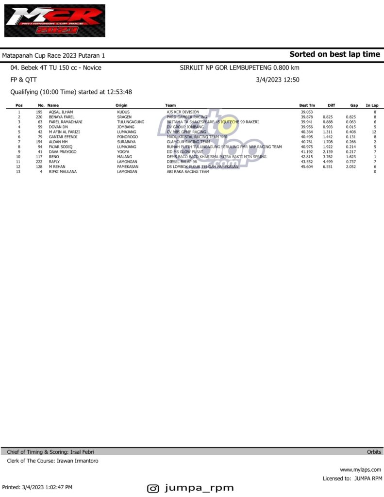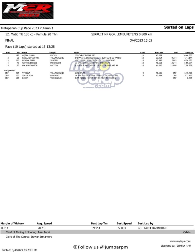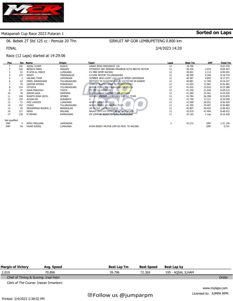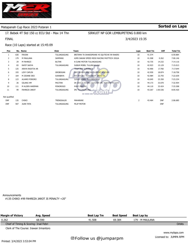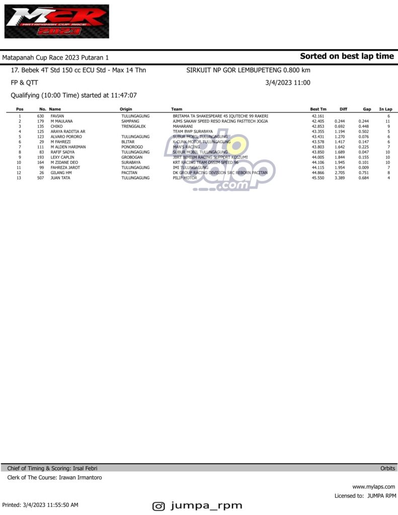 Dari keseluruhan QTT dan Race yang dilombakan, di bawah ini merupakan Hasil QTT & Race Mata Panah Cup Race (MCR) 2023 Tulungagung Sabtu adalah sebagai berikut: