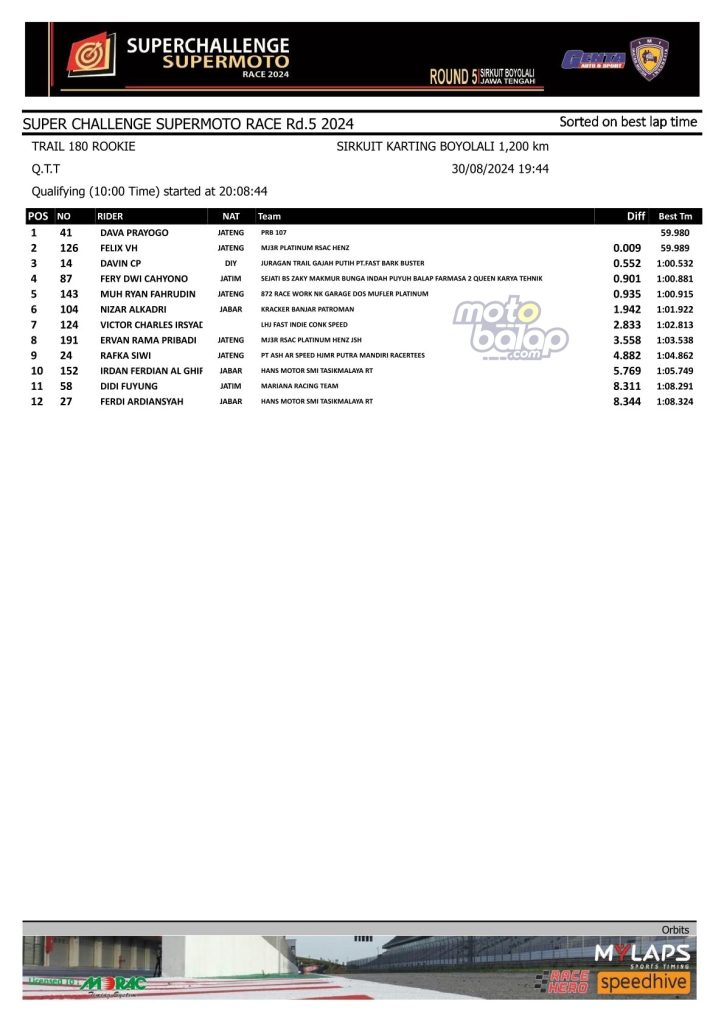 MOTOBALAP.COM – Kejuaraan Balap Motor bertajuk Superchallenge Supermoto Race Seri Kejurnas putaran 5 diawali dengan sesi QTT yang berlangsung sengit di sirkuit Boyolali, 30 Agustus 2024.