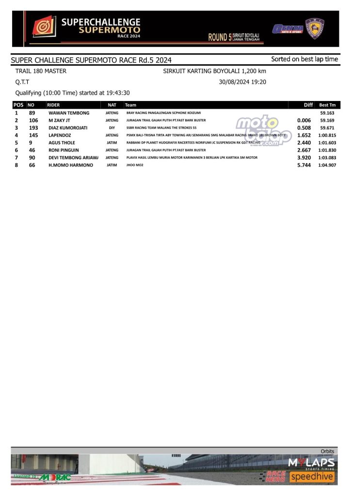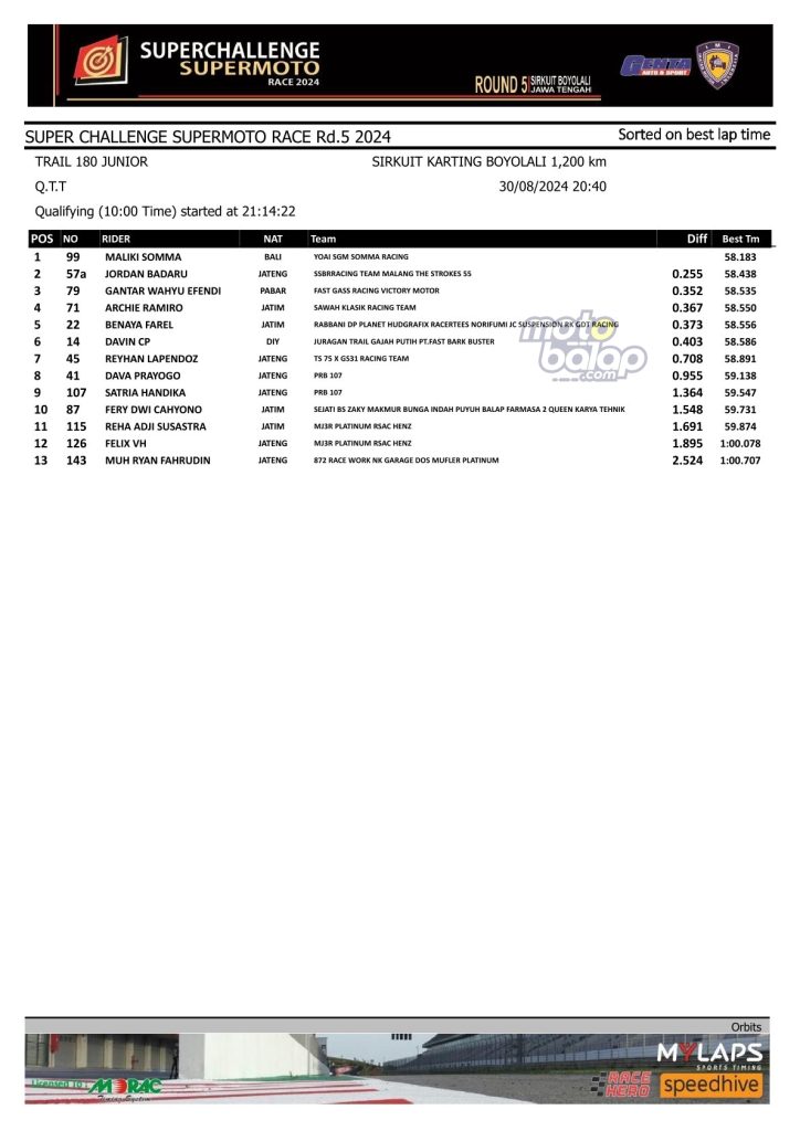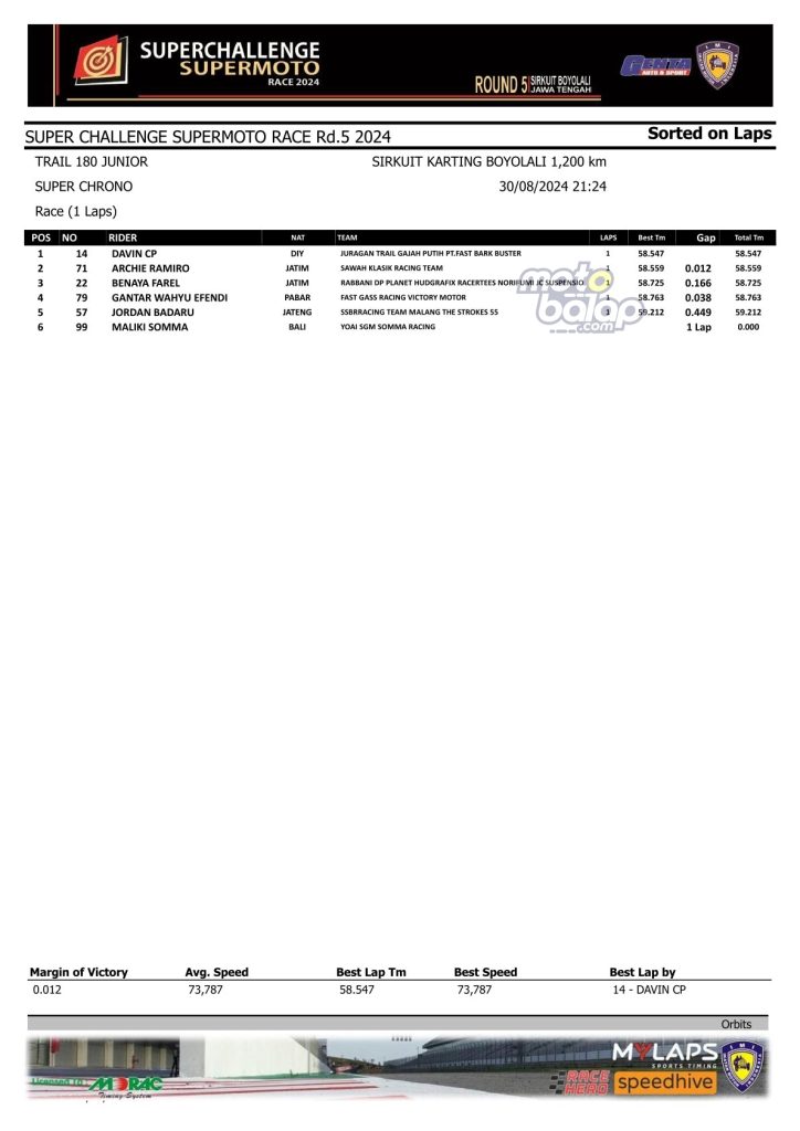 Dari keselurahan kelas yang dilombakan, di bawah ini merupakan Superchallenge Supermoto Race Seri 5 Boyolali adalah sebagai berikut: