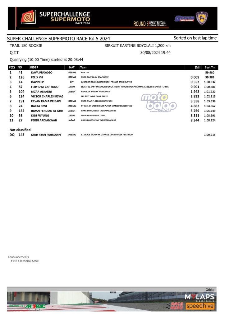 MOTOBALAP.COM – Kejuaraan Balap Motor bertajuk Superchallenge Supermoto Race Seri Kejurnas putaran 5 diawali dengan sesi QTT yang berlangsung sengit di sirkuit Boyolali, 30 Agustus 2024.