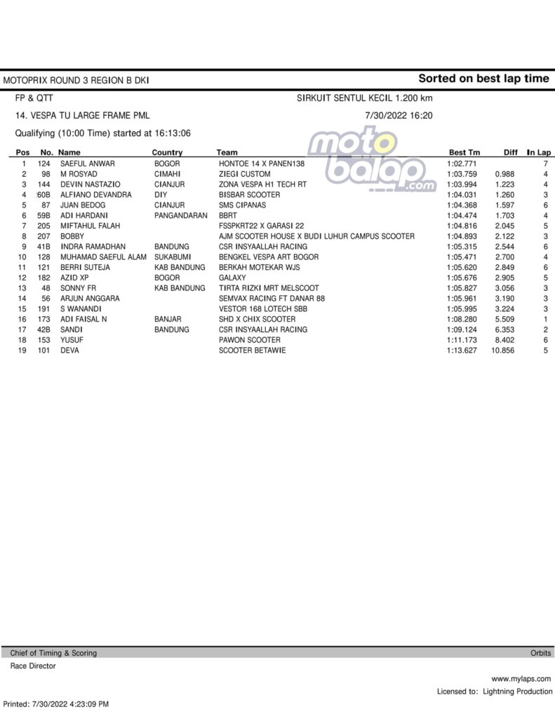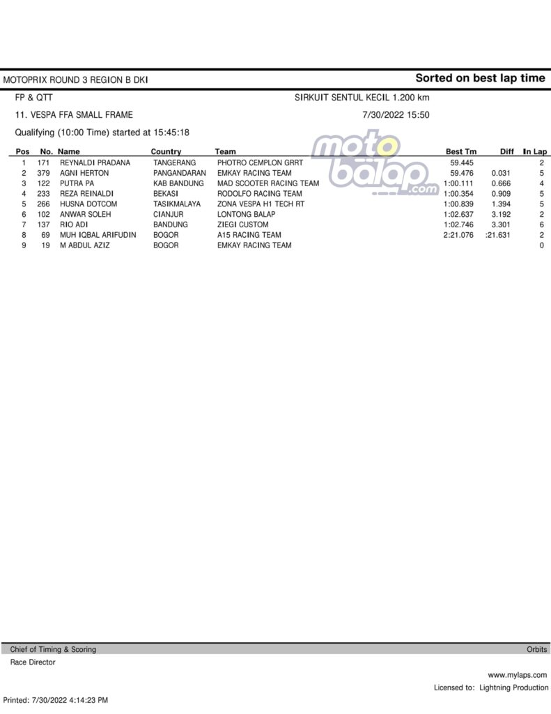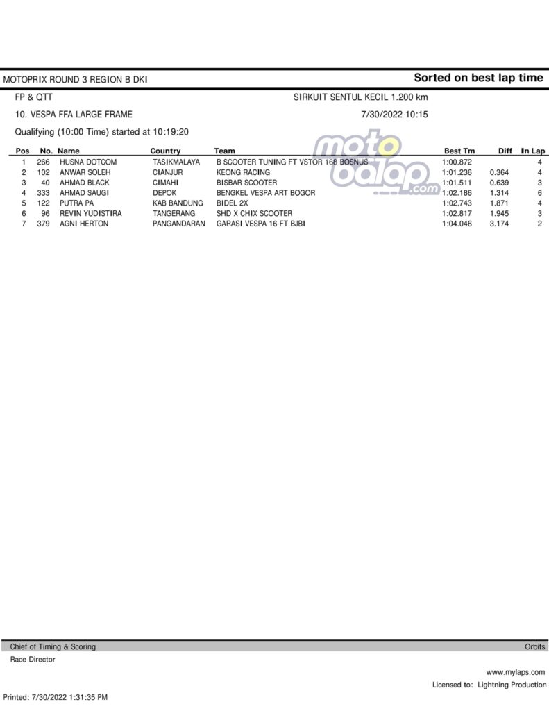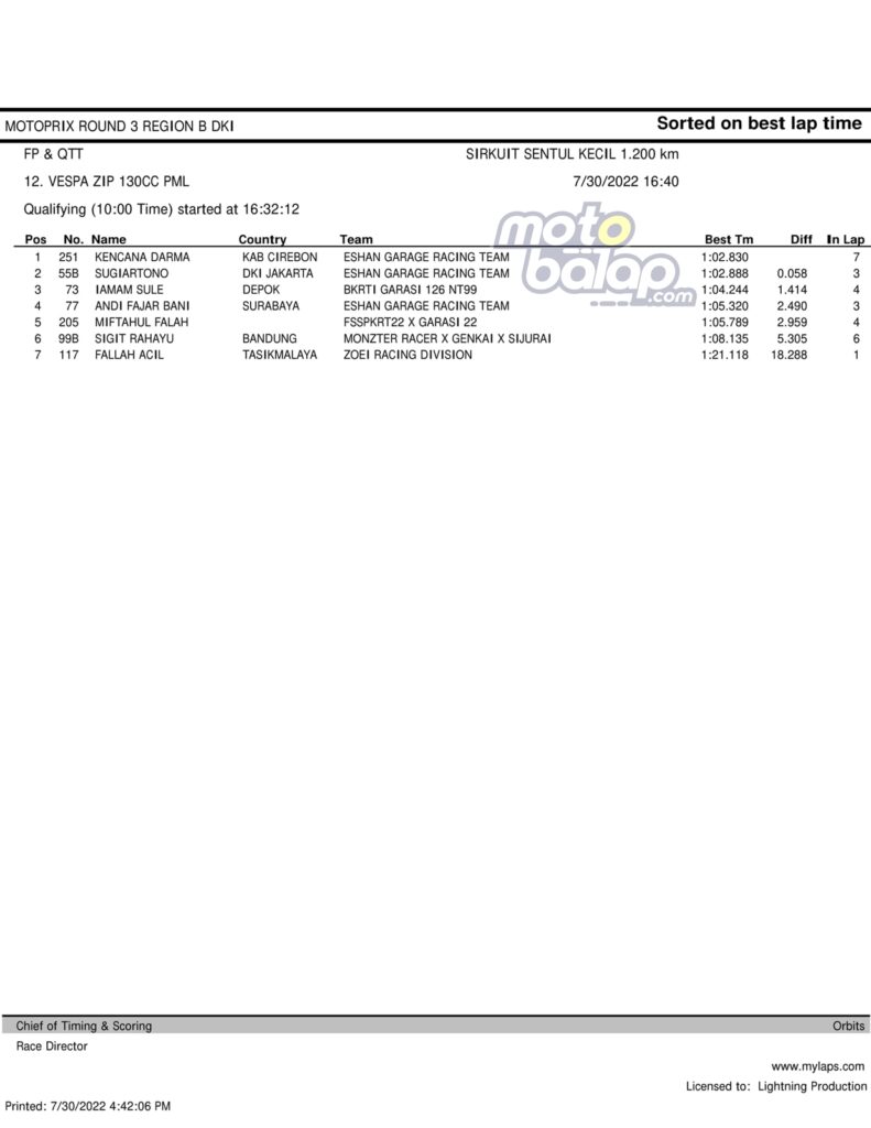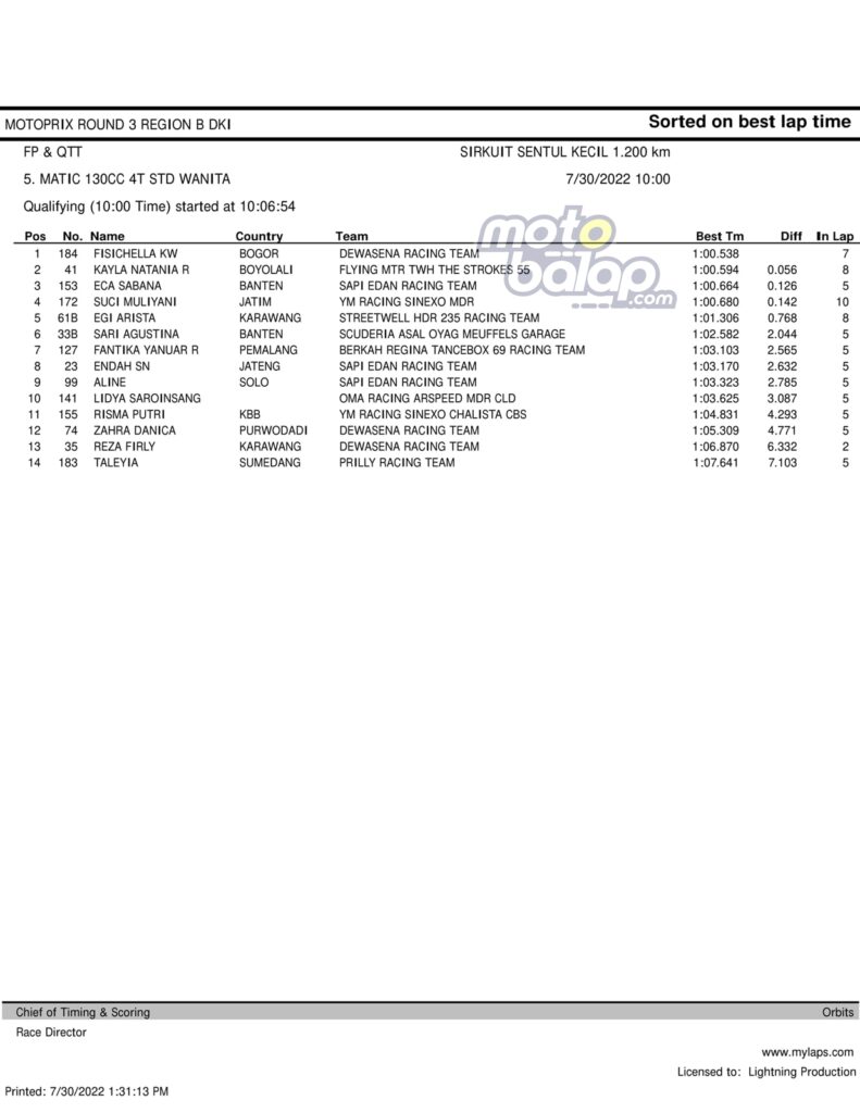 MOTOBALAP.COM – Berikut merupakan hasil QTT Supporting Class Kejurnas Motoprix Region B Putaran 3 di Sentul International Karting Circuit (SIKC) Sabtu, 30 Juli 2022 adalah sebagai berikut:
