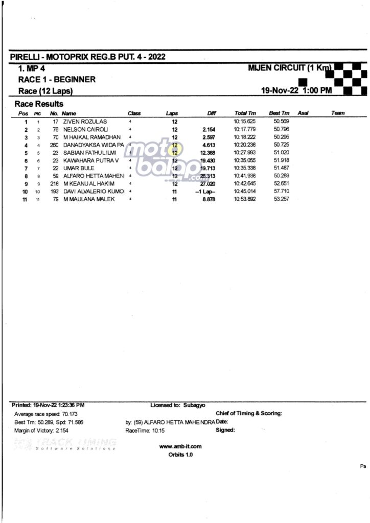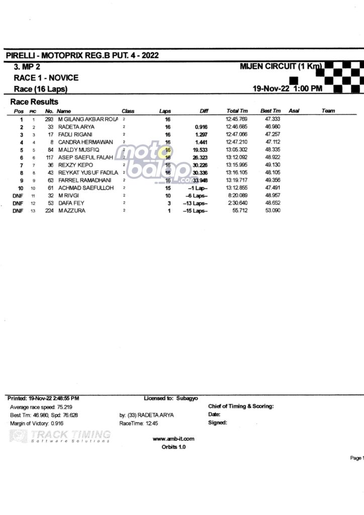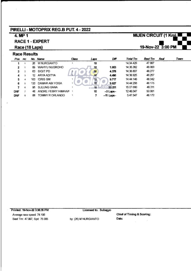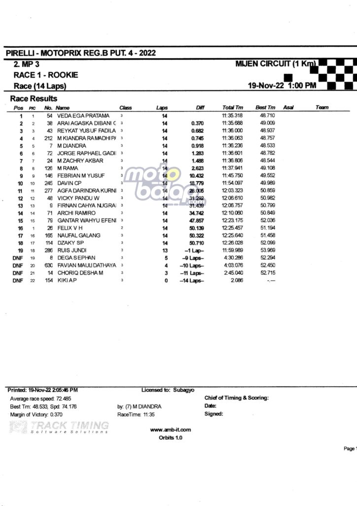Di Bawah ini merupakan Hasil Race 1 Kejurnas Motoprix Region B Putaran 4 Mijen adalah sebagai berikut: