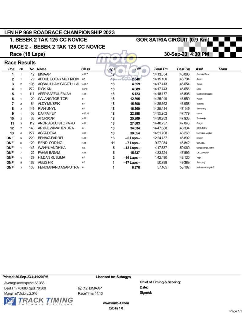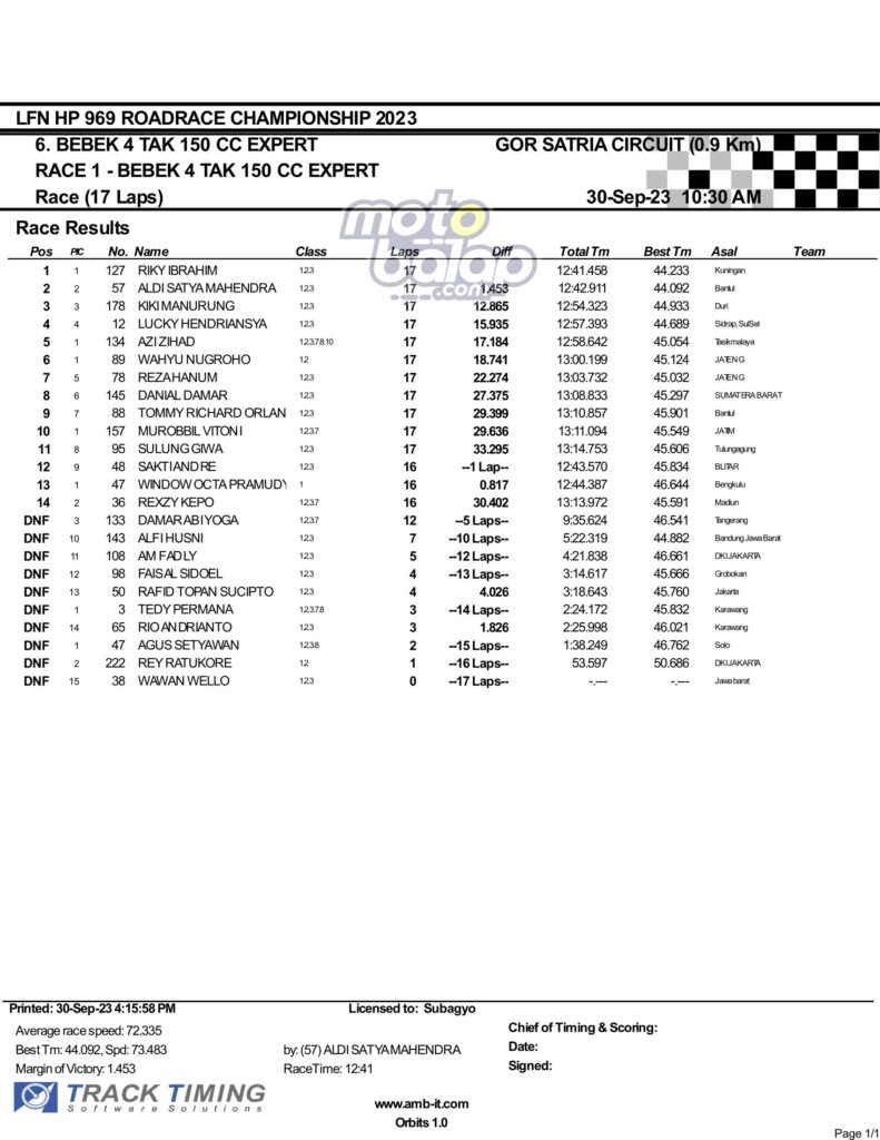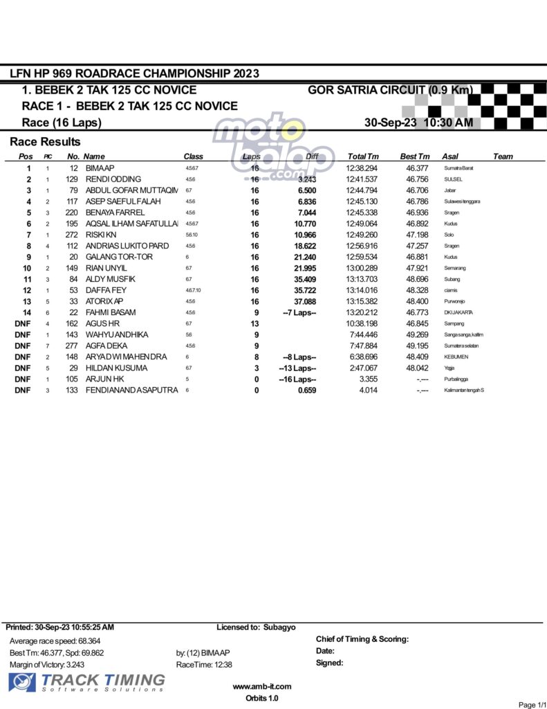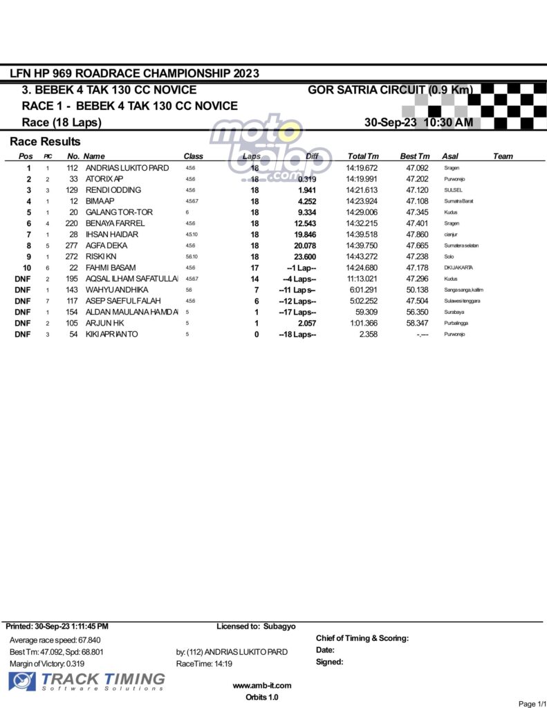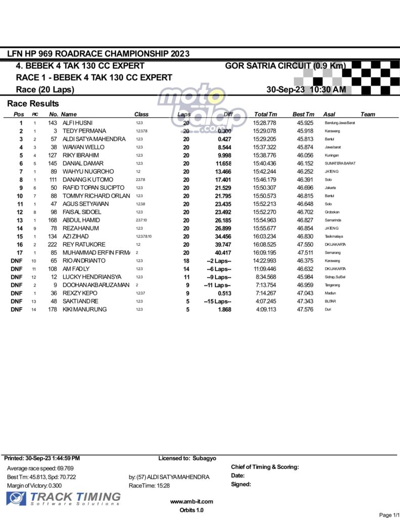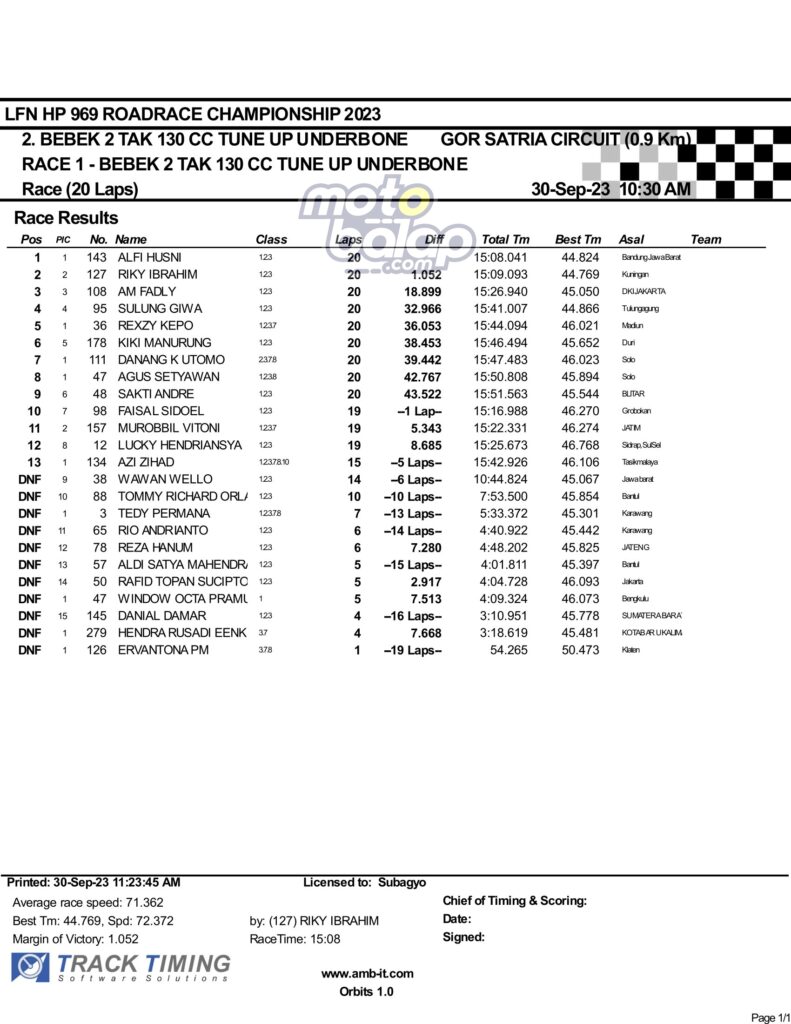 Dari keselurahan kelas yang dilombakan, di bawah ini merupakan Hasil Race 1 LFN HP969 Road Race Championship 2023 Purwokerto adalah sebagai berikut: