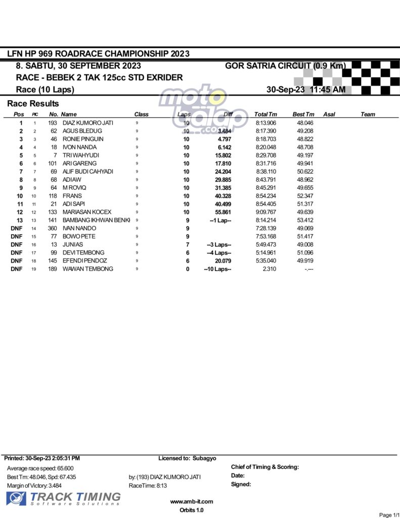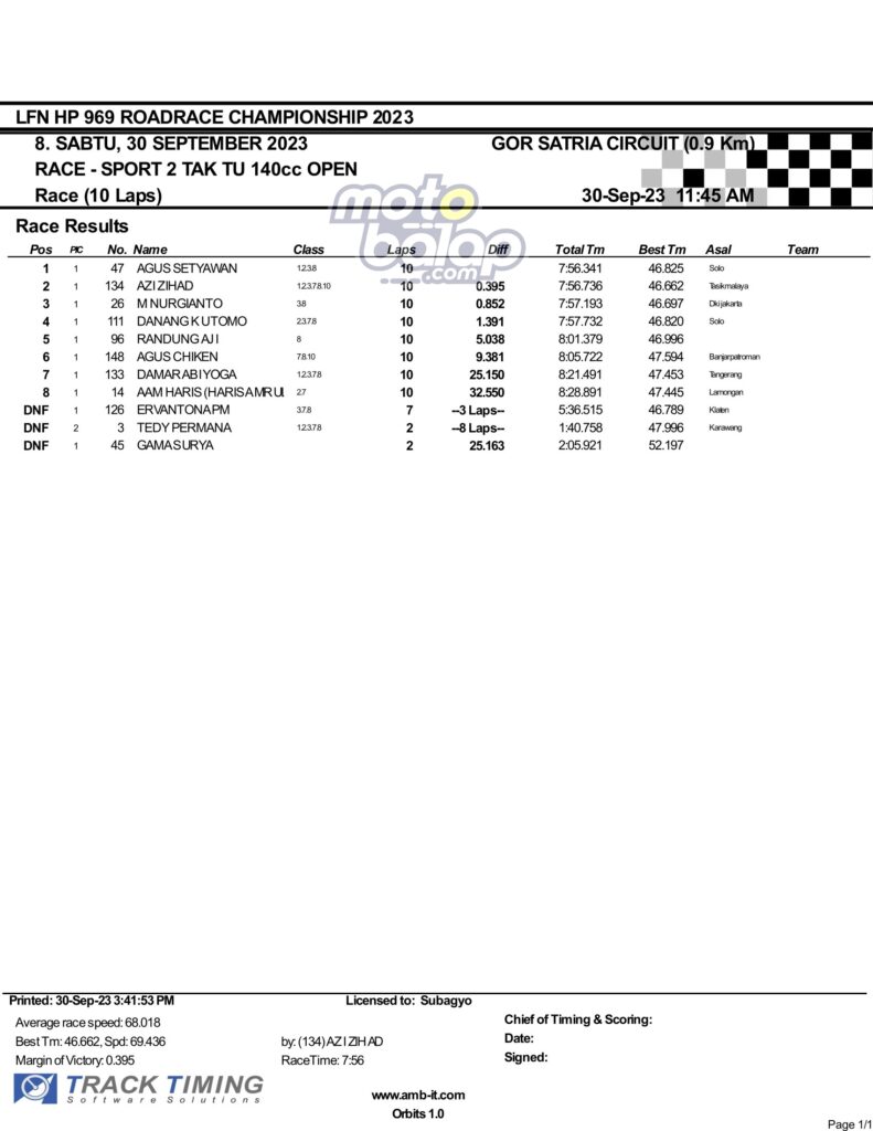 Hasil Race 1 LFN HP969 Road Race Championship 2023 Purwokerto
