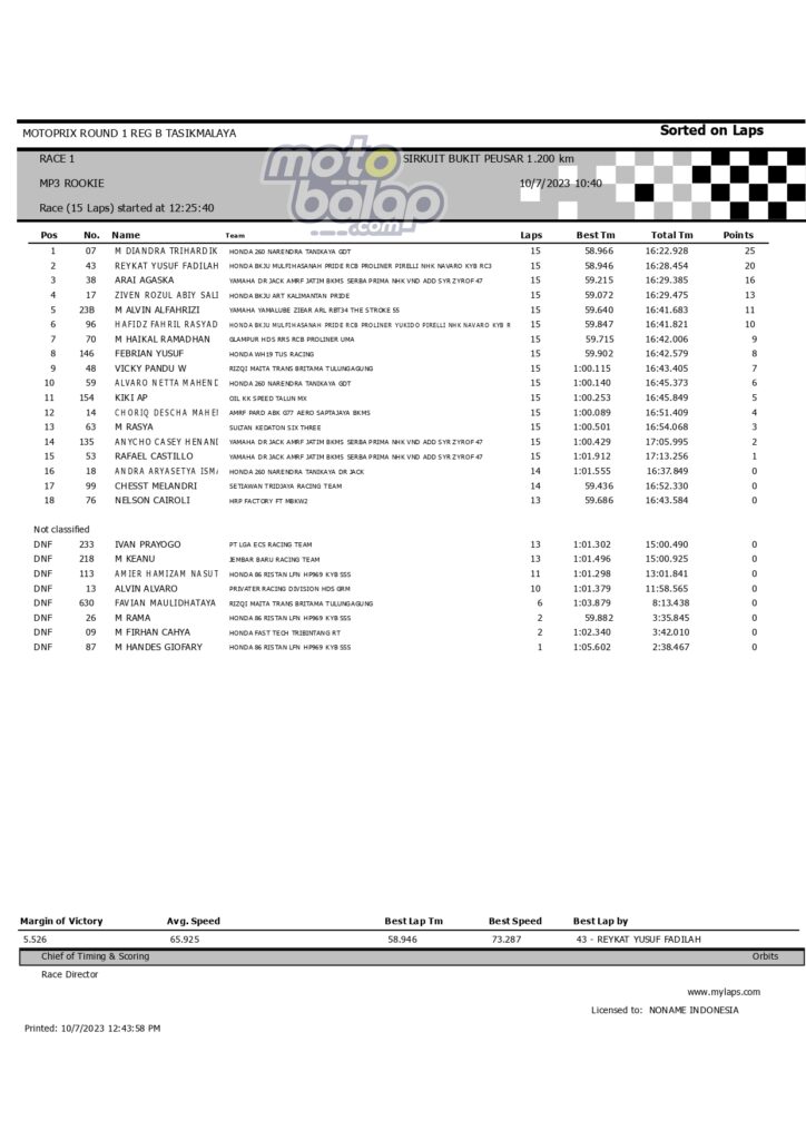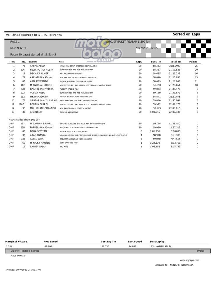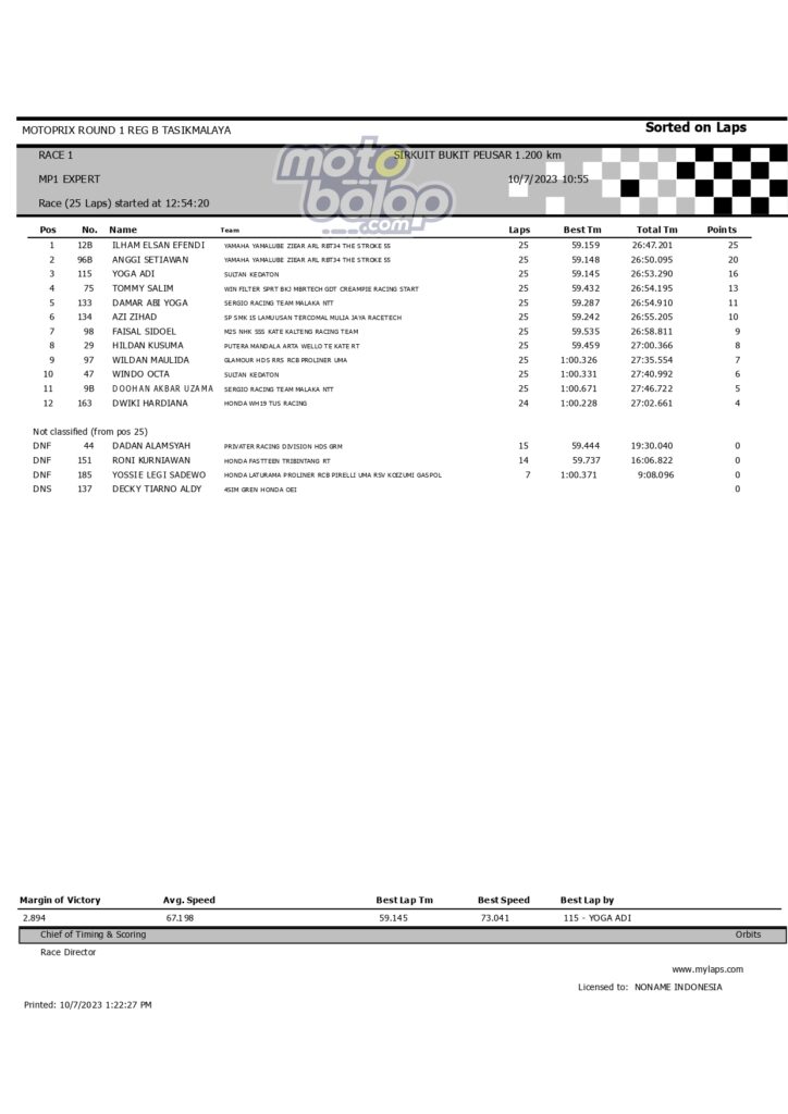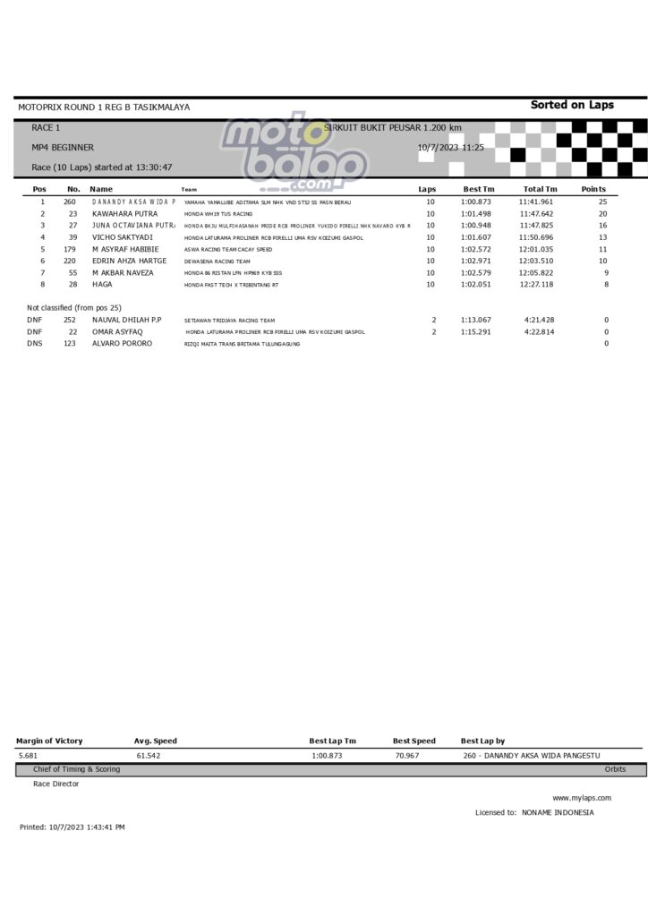 Dari keselurahan kelas yang dilombakan, di bawah ini merupakan Hasil Race 1 Motoprix Put.1 Region B Tasikmalaya adalah sebagai berikut: