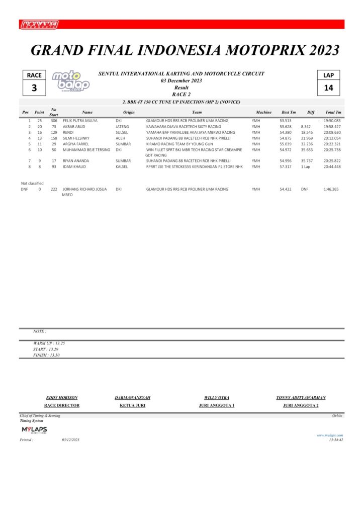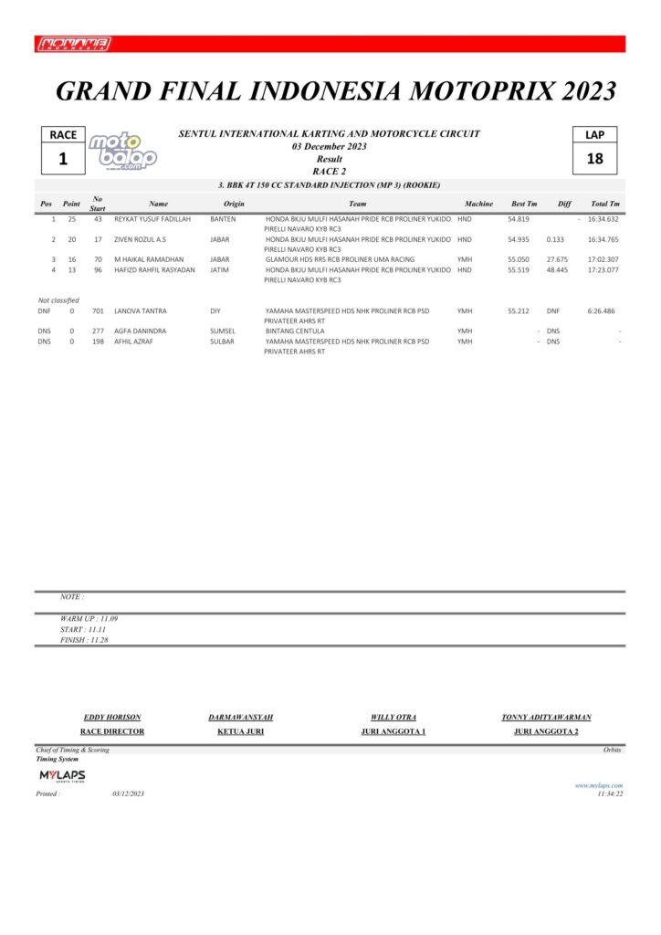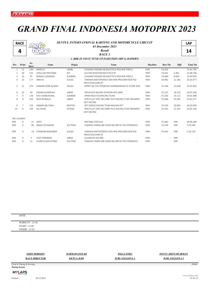 Dari keselurahan kelas yang dilombakan, di bawah ini merupakan Hasil Race 2 Grand Final Kejurnas Motoprix 2023 Sentul Kecil adalah sebagai berikut: