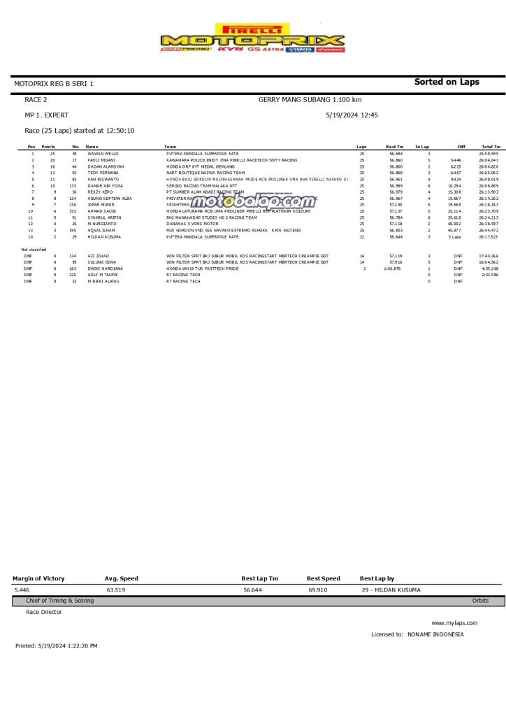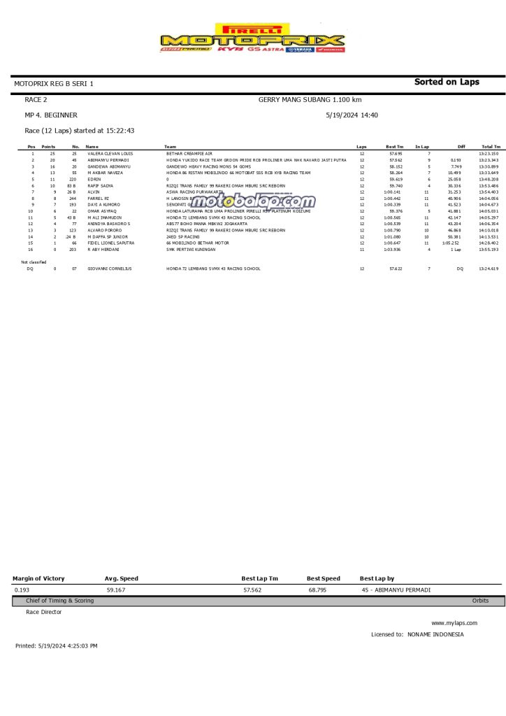 MOTOBALAP.COM- Berikut adalah hasil race kedua Kejurnas Motoprix 2024 Region B Seri 1 yang berlangsung di Sirkuit Gery Mang, Subang (19/5).