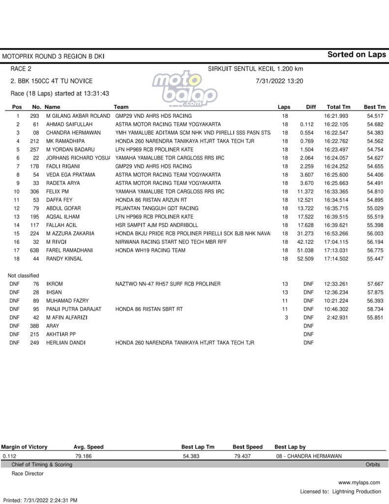 MOTOBALAP.COM – Berikut merupakan hasil Race 2 Kejurnas Motoprix Region B Putaran 3 di Sentul International Karting Circuit (SIKC) Minggu, 31 Juli 2022 adalah sebagai berikut: