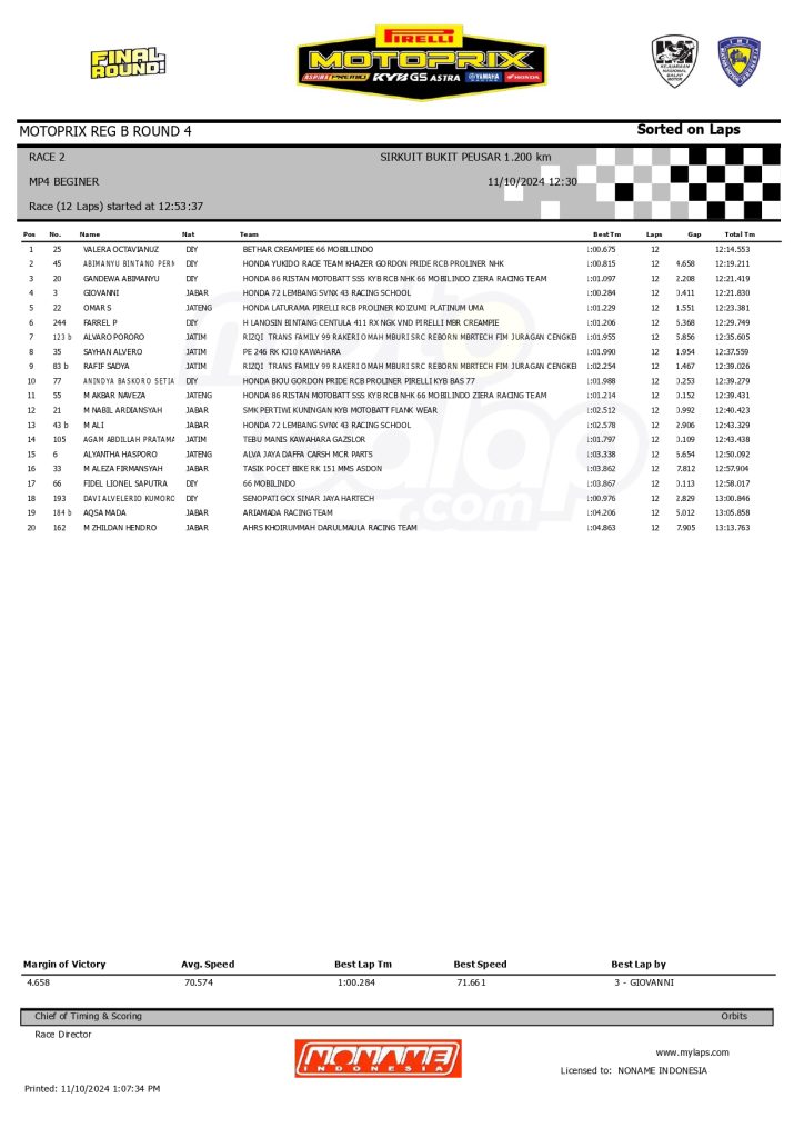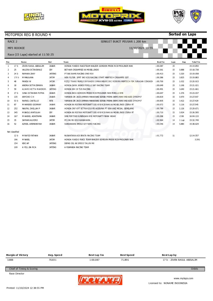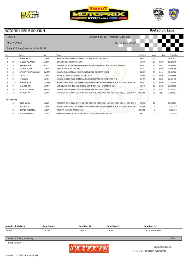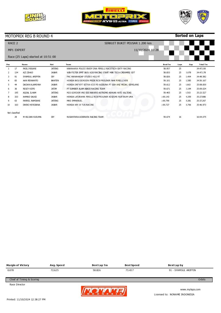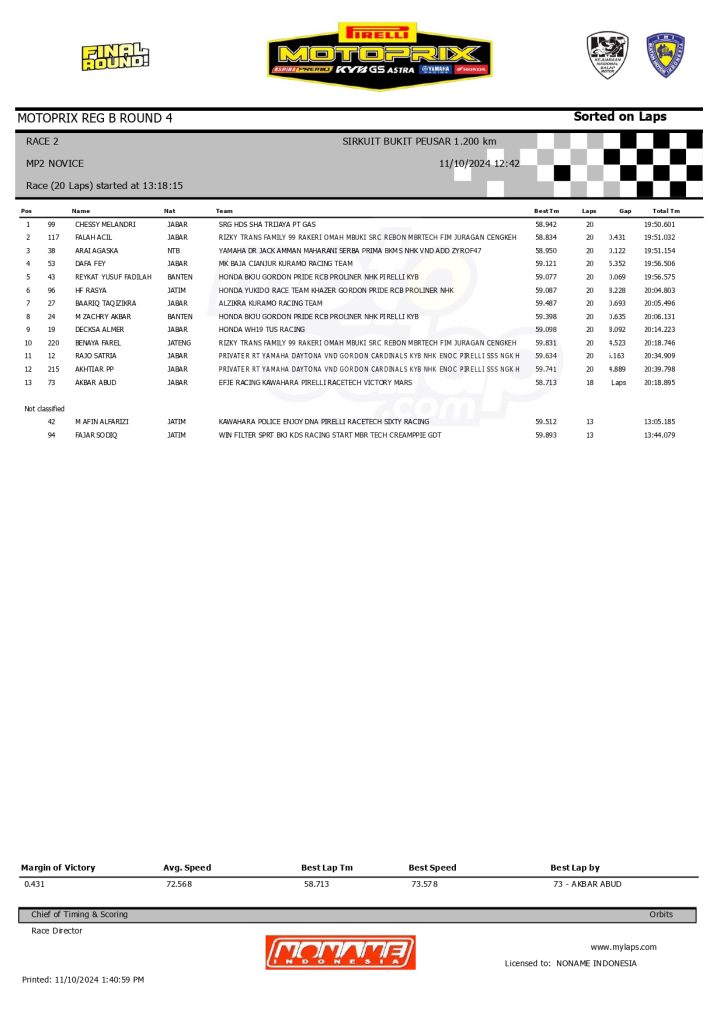 MOTOBALAP.COM – Berikut ini adalah hasil Race 2 kelas utama (poin) serta hasil Race 1 Novice putaran final Kejurnas Motoprix Region B yang berlangsung di sirkuit Bukit Peusar, Tasikmalaya, Jawa Barat pada Minggu 10 November 2024.