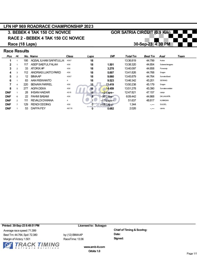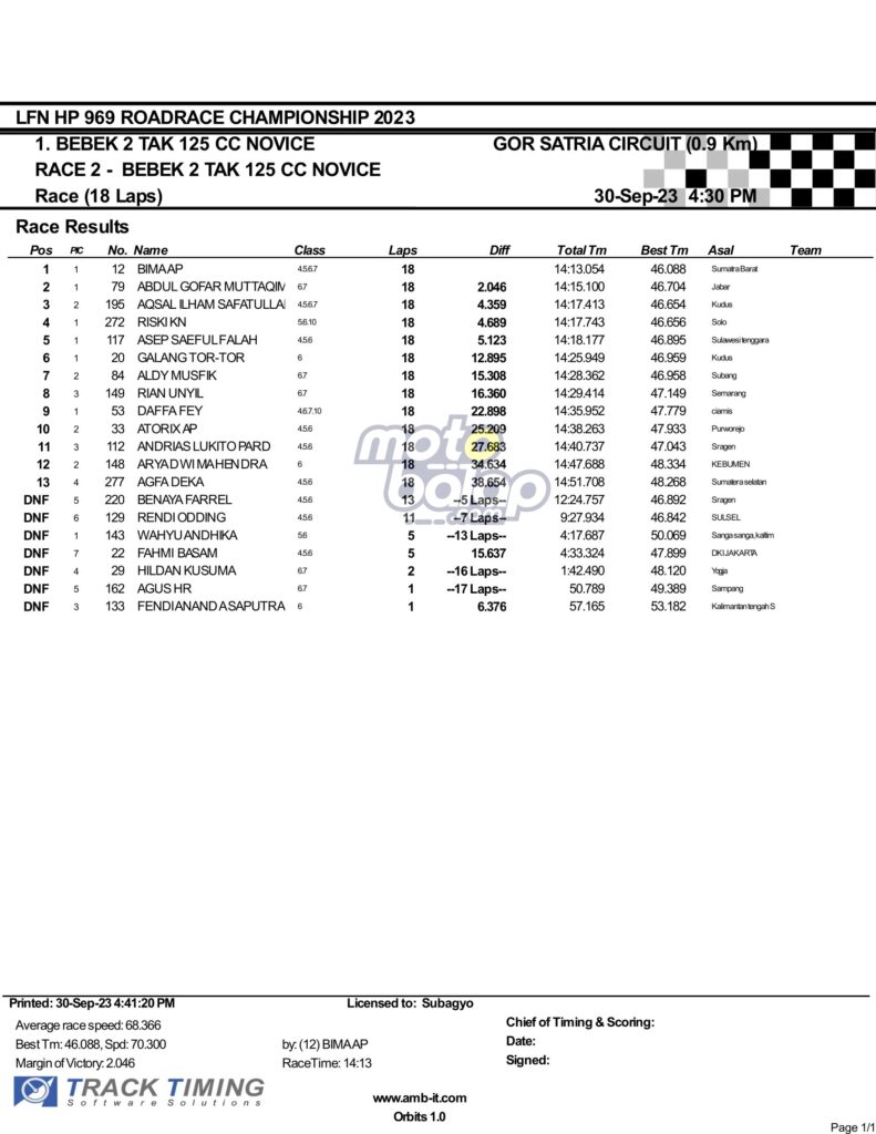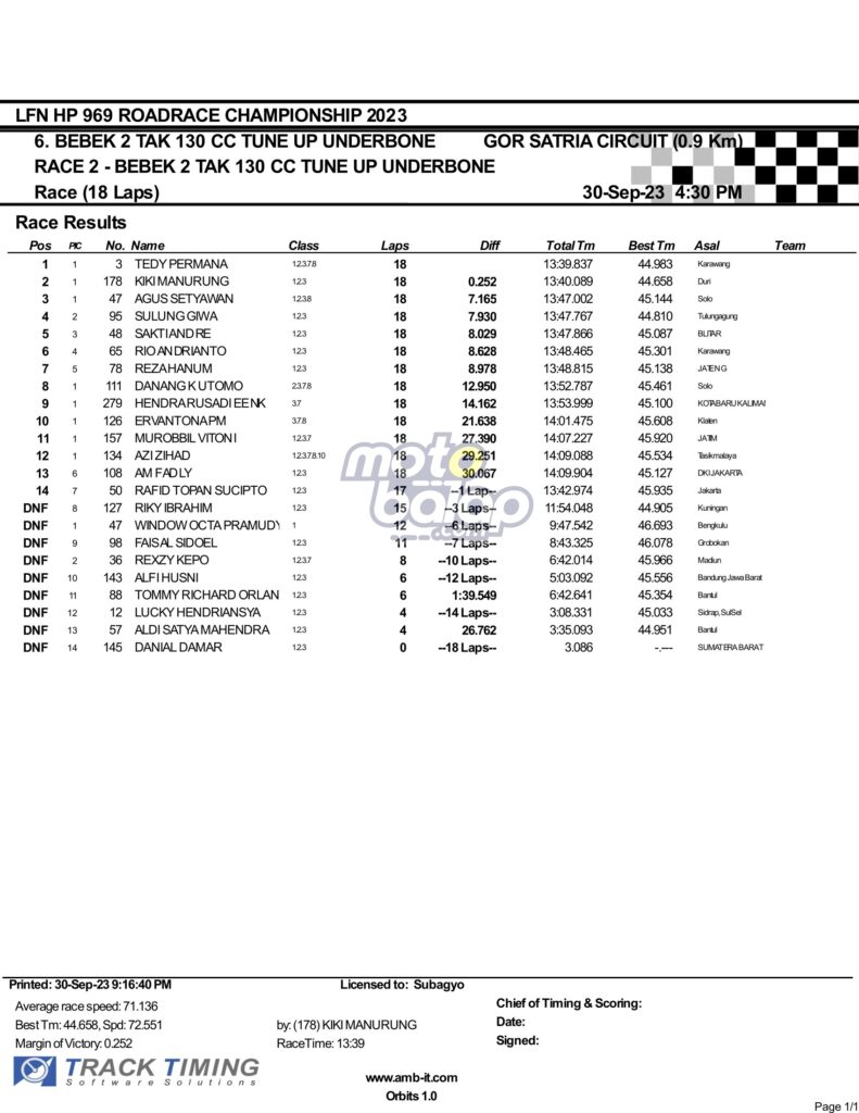 Dari keselurahan kelas yang dilombakan, di bawah ini merupakan Hasil Race 2 LFN HP969 Road Race Championship 2023 Purwokerto adalah sebagai berikut: