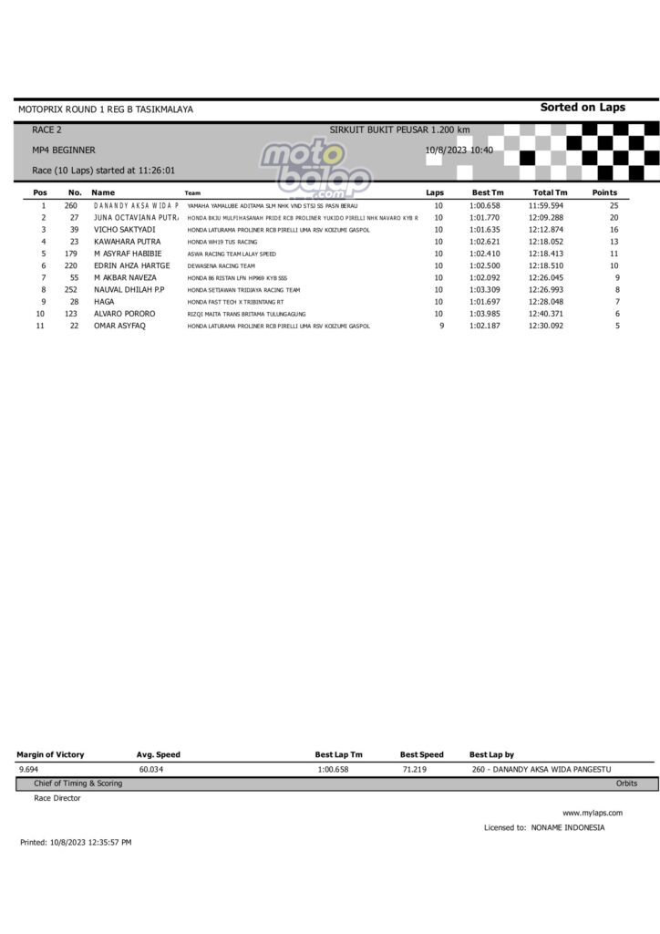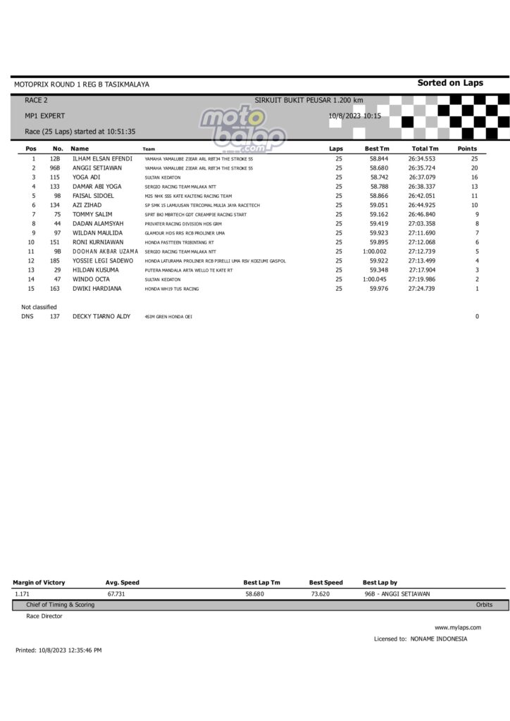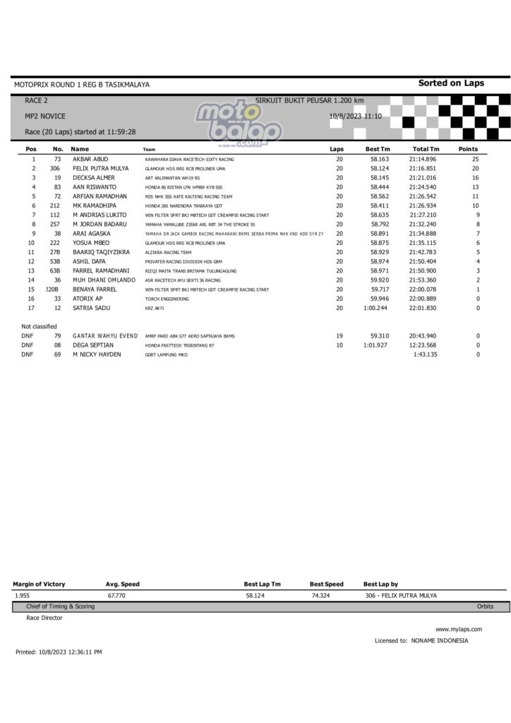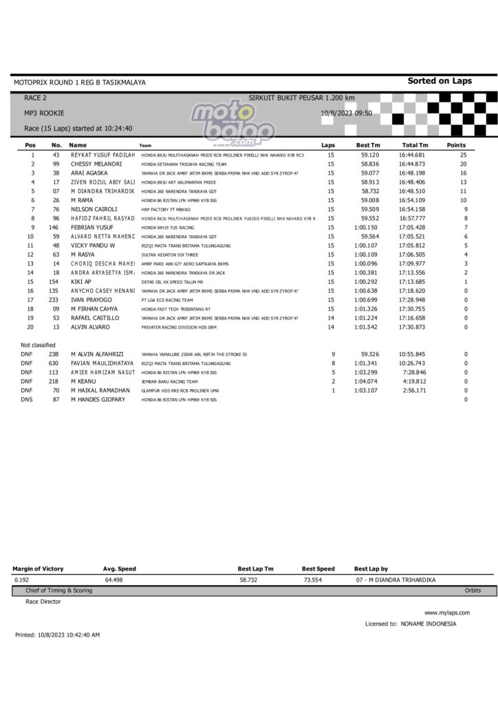 Dari keselurahan kelas yang dilombakan, di bawah ini merupakan Hasil Race 2 Motoprix Put.1 2030 Region B Tasikmalaya adalah sebagai berikut: