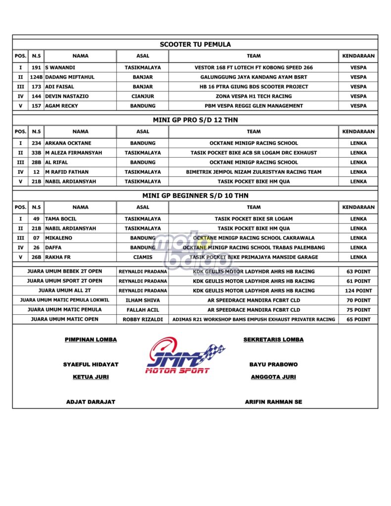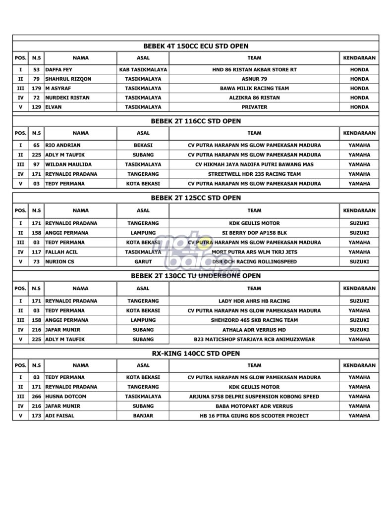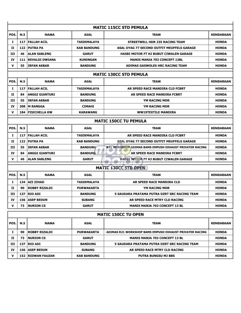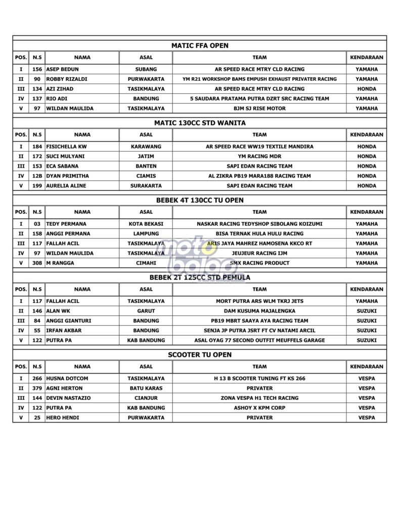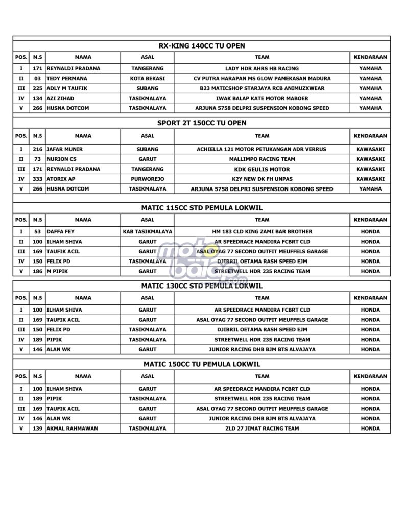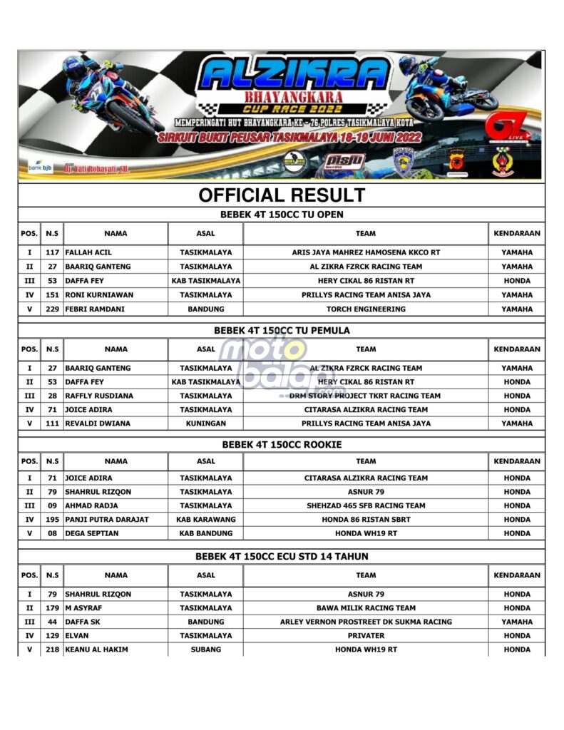 Tasikmalaya, MOTOBALAP.COM – Hasil Race Alzikra Bhayangkara Cup Race 2022 yang dihelat di sirkuit Bukit Peusar, Tasikmalaya, Minggu (19/06/2022) adalah sebagai berikut: