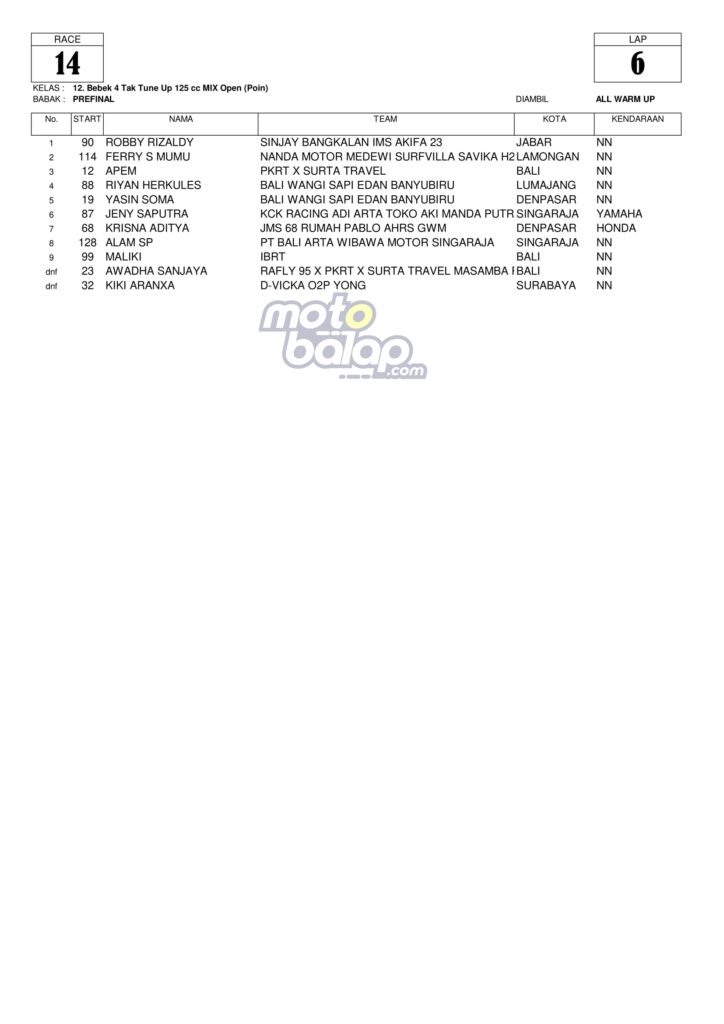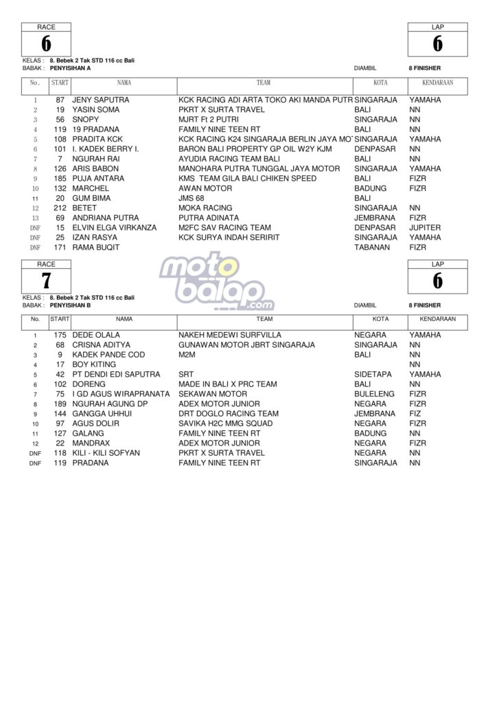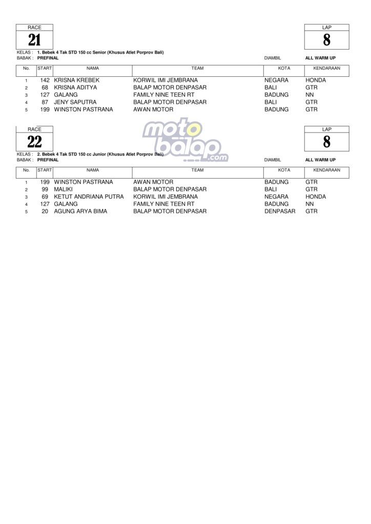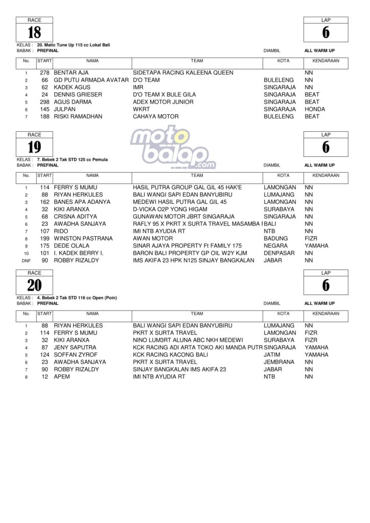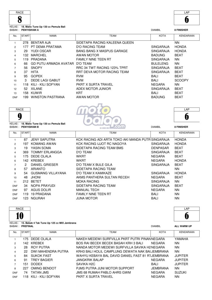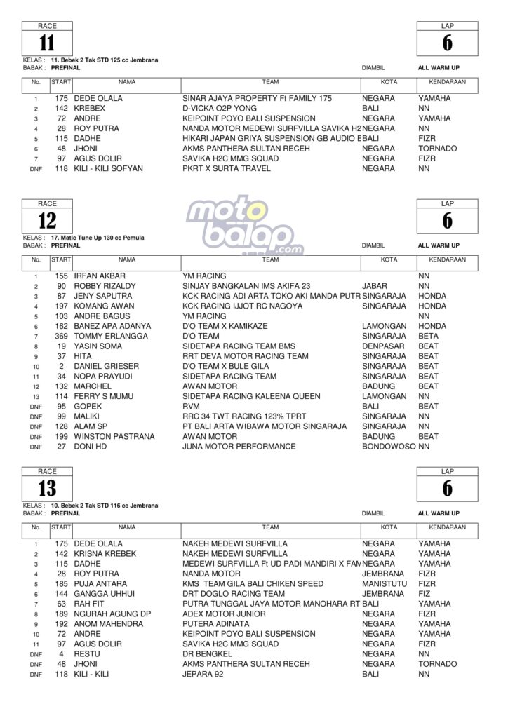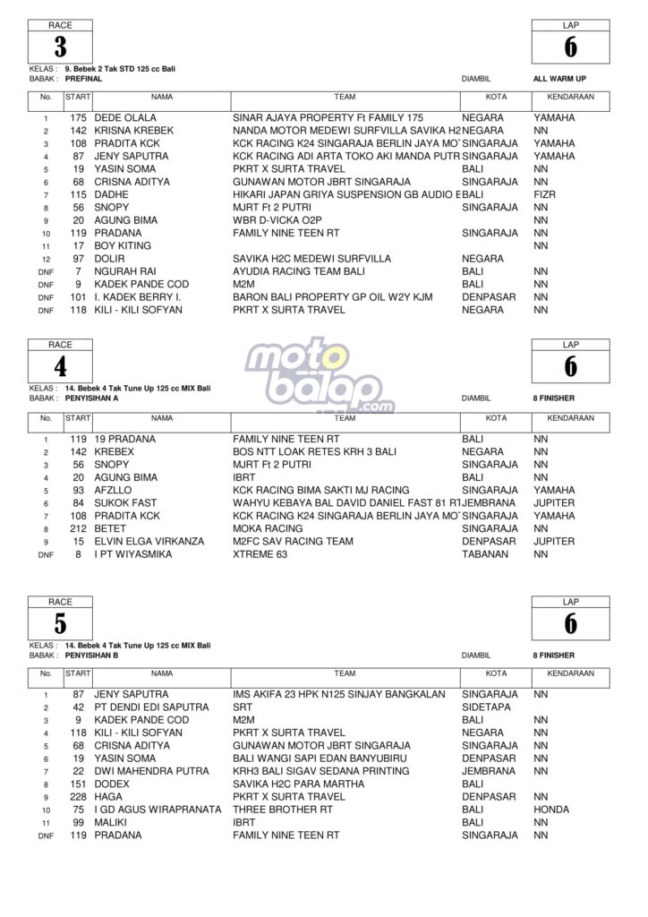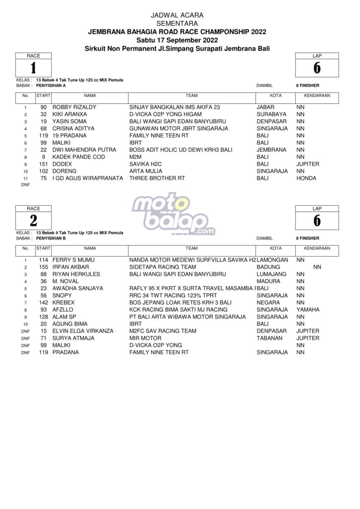 MOTOBALAP.COM Berikut merupakan Hasil Race dan Prefinal Jembrana Bahagia Road Race Championsip 2022 yang berlangsung di sirkuit non permanen jl. Simpang Surapati Jembrana Bali, Sabtu (17/09/2022) adalah sebagai berikut: