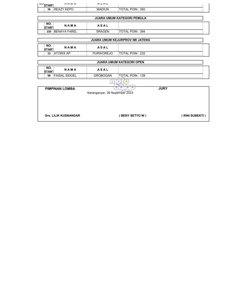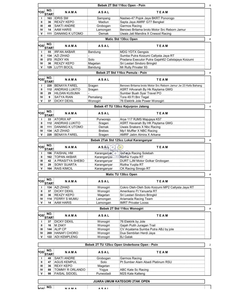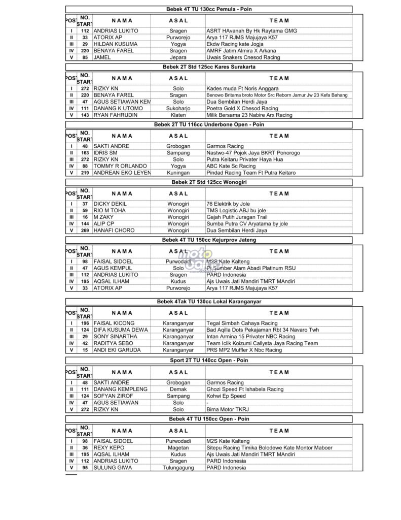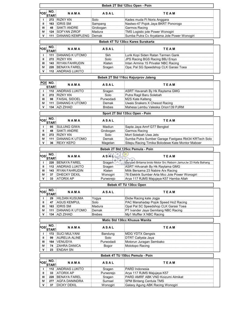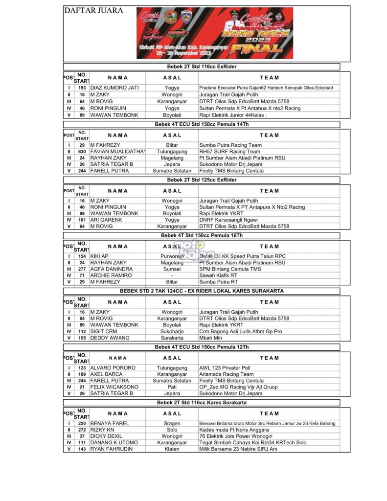 Dari keselurahan kelas yang dilombakan, di bawah ini merupakan Hasil Race Minggu Final Kejurprov Jateng Casytha Manahadap Road Race 2023 Karanganyar adalah sebagai berikut: