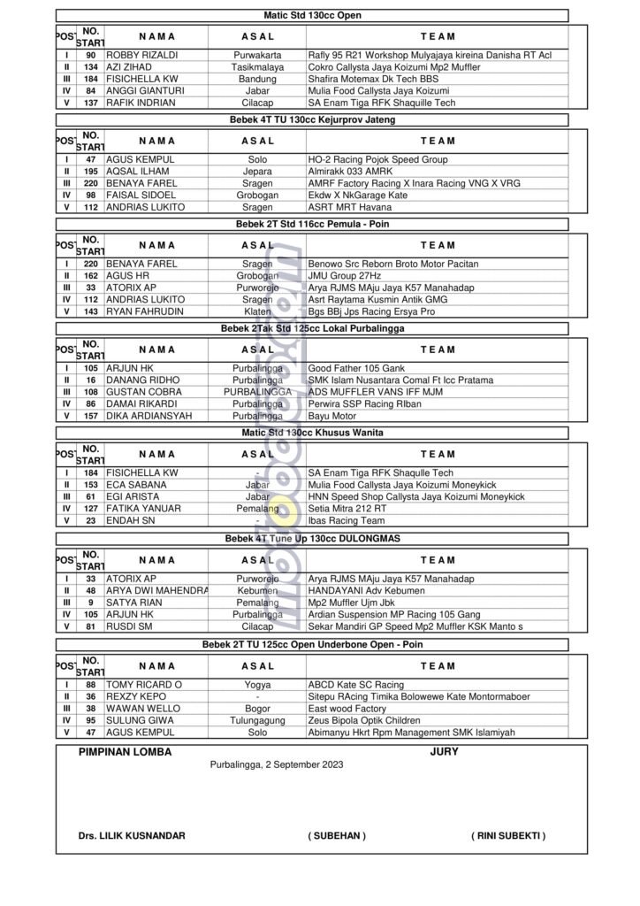 Dari keselurahan kelas yang dilombakan, di bawah ini merupakan Hasil Race Minggu Kejurprov Jateng Casytha Manahadap Road Race 2023 Seri 4 Purbalingga adalah sebagai berikut: