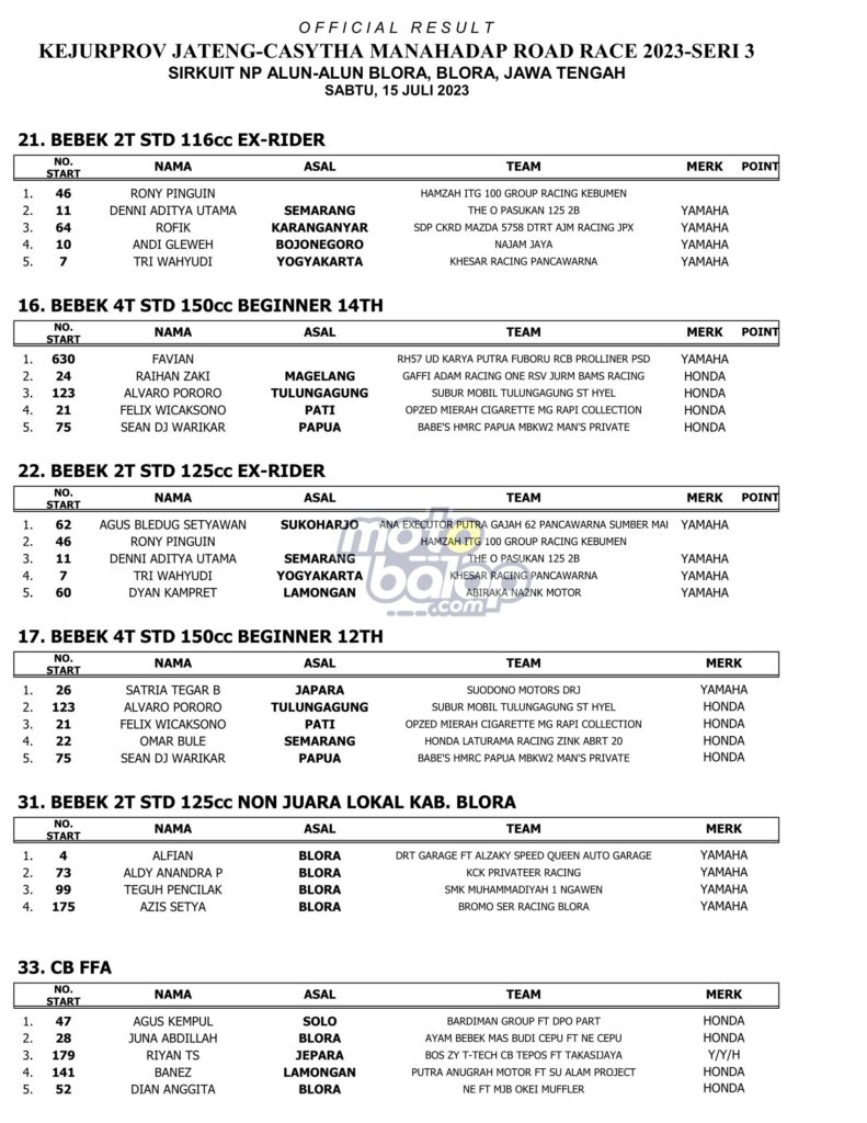 Dari keselurahan kelas yang dilombakan, di bawah ini merupakan Hasil Race Sabtu Kejurpov Jateng Casytha Manahadap Seri 3 adalah sebagai berikut: