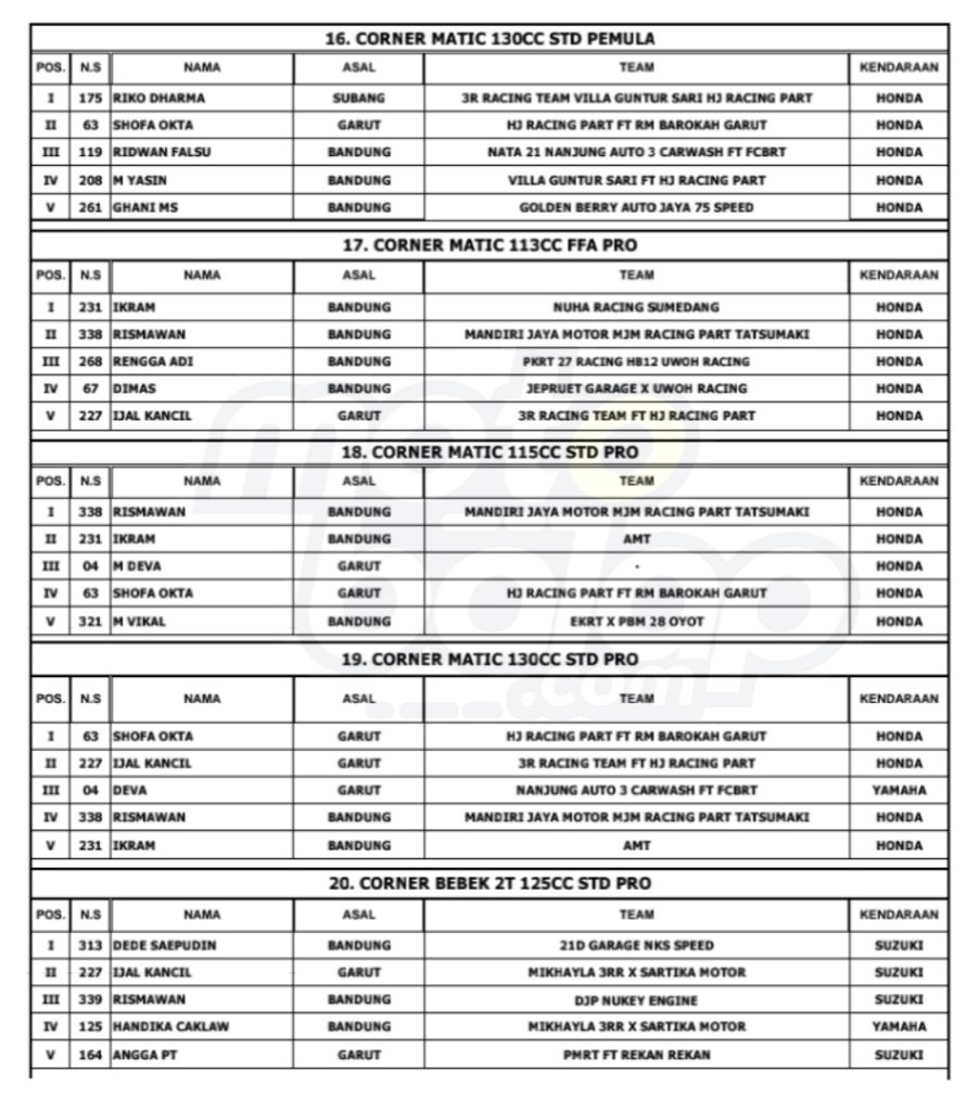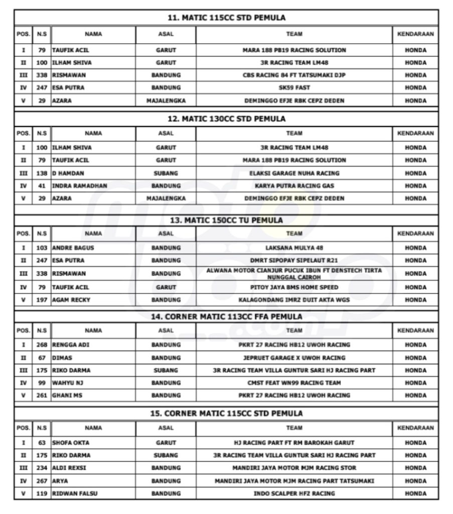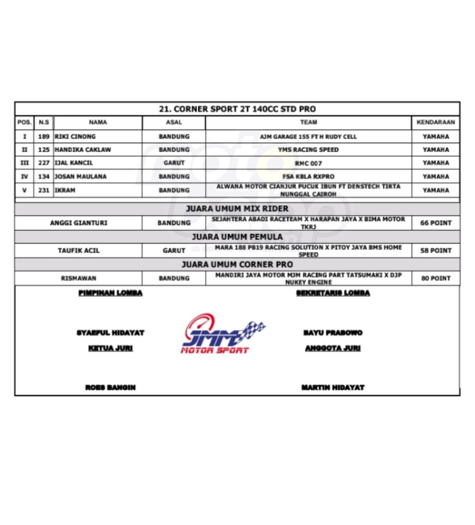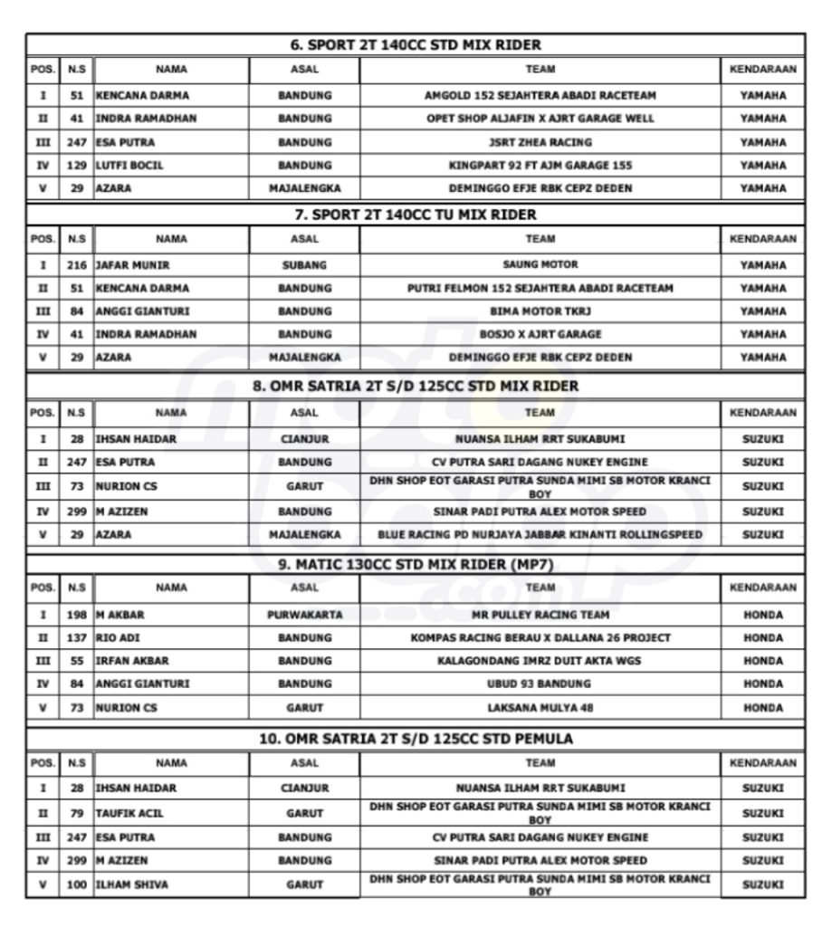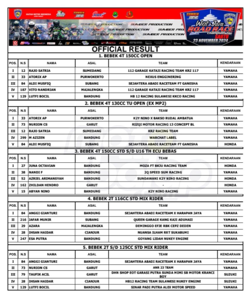 Dari keseluruhan kelas yang dilombakan, di bawah ini merupakan Hasil Race West Java Road Race Championship 2024 adalah sebagai berikut: