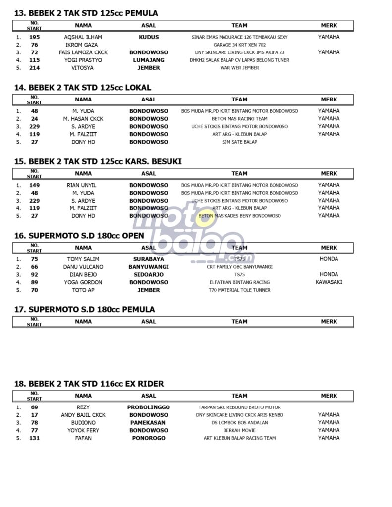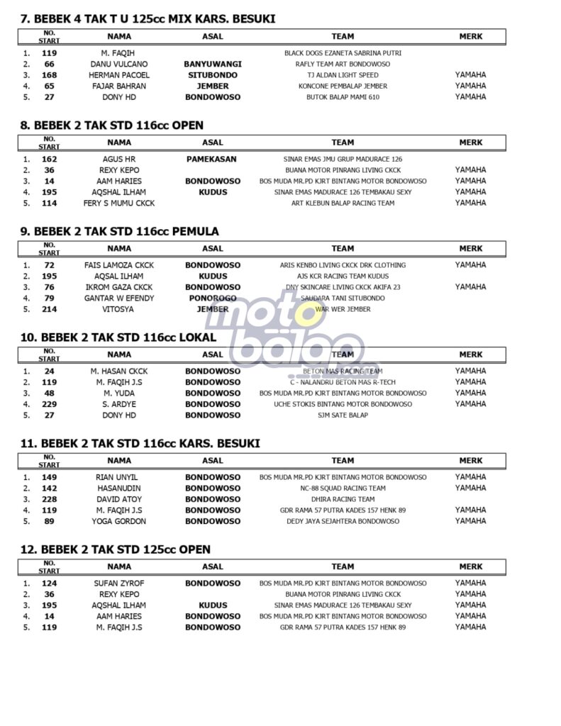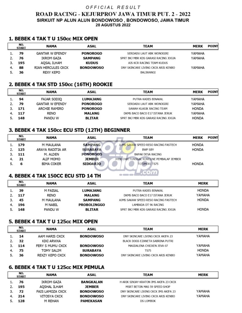 MOTOBALAP.COM – Di bawah ini merupakan hasil Road Racing Kejurprov Jawa Timur 2022 putaran 2 yang berlangsung di sirkuit non permanen Alun-Alun Bondowoso, Minggu (28/08/2022) adalah sebagai berikut: