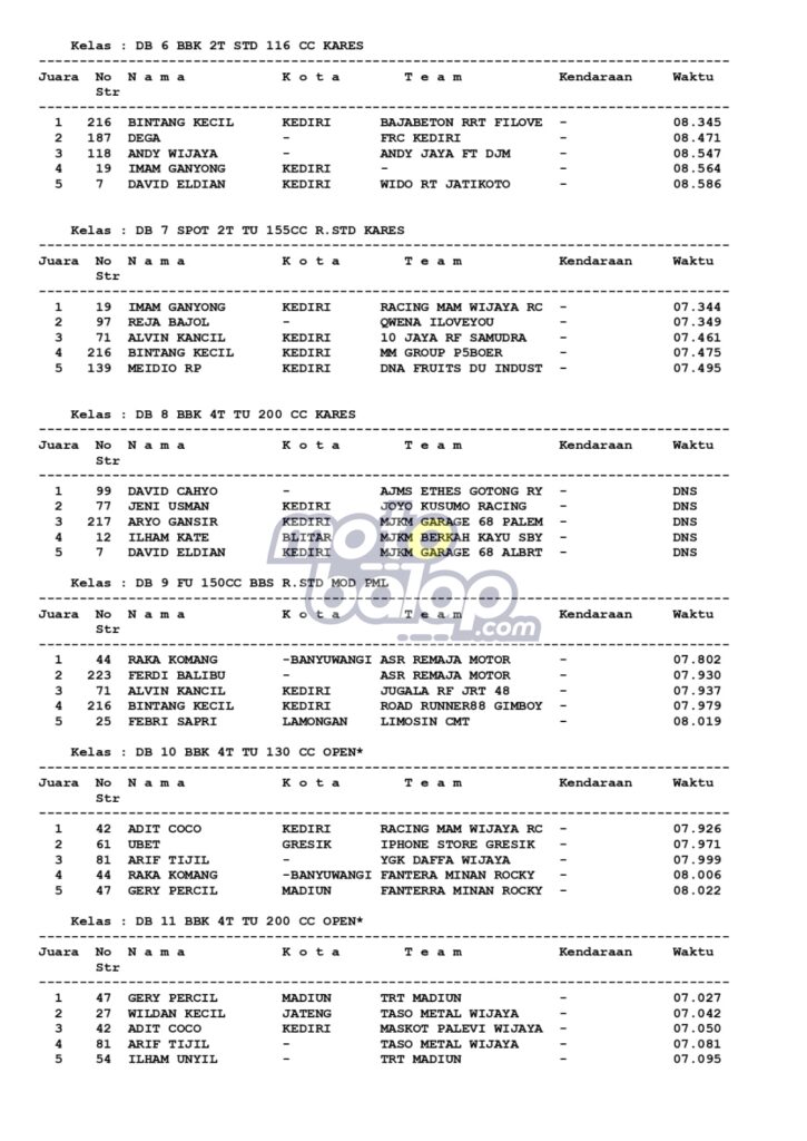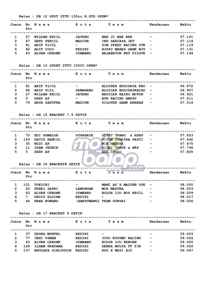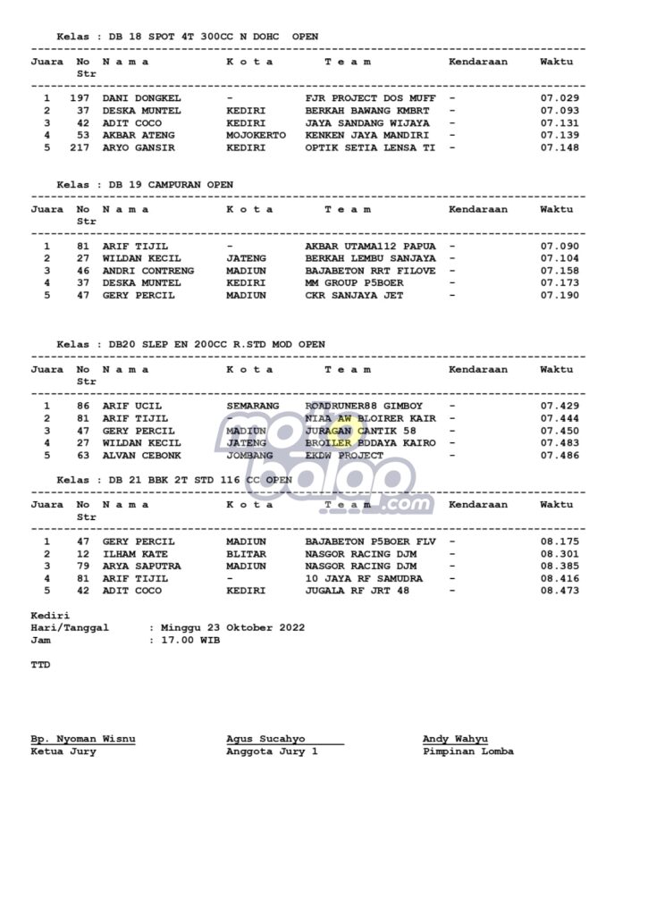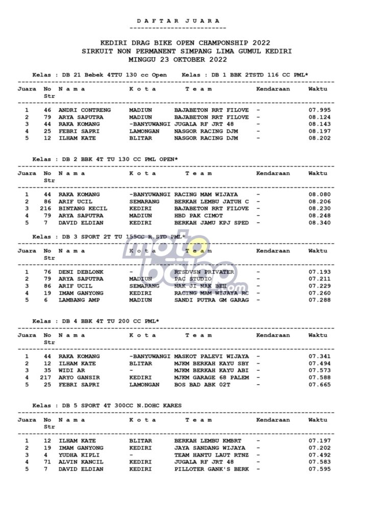Dari keseluruhan race yang dilombakan, di bawah ini merupakan Hasil Suryanation Motorland Racing Work Dragbike Kediri Open Championship 2022 adalah sebagai berikut: