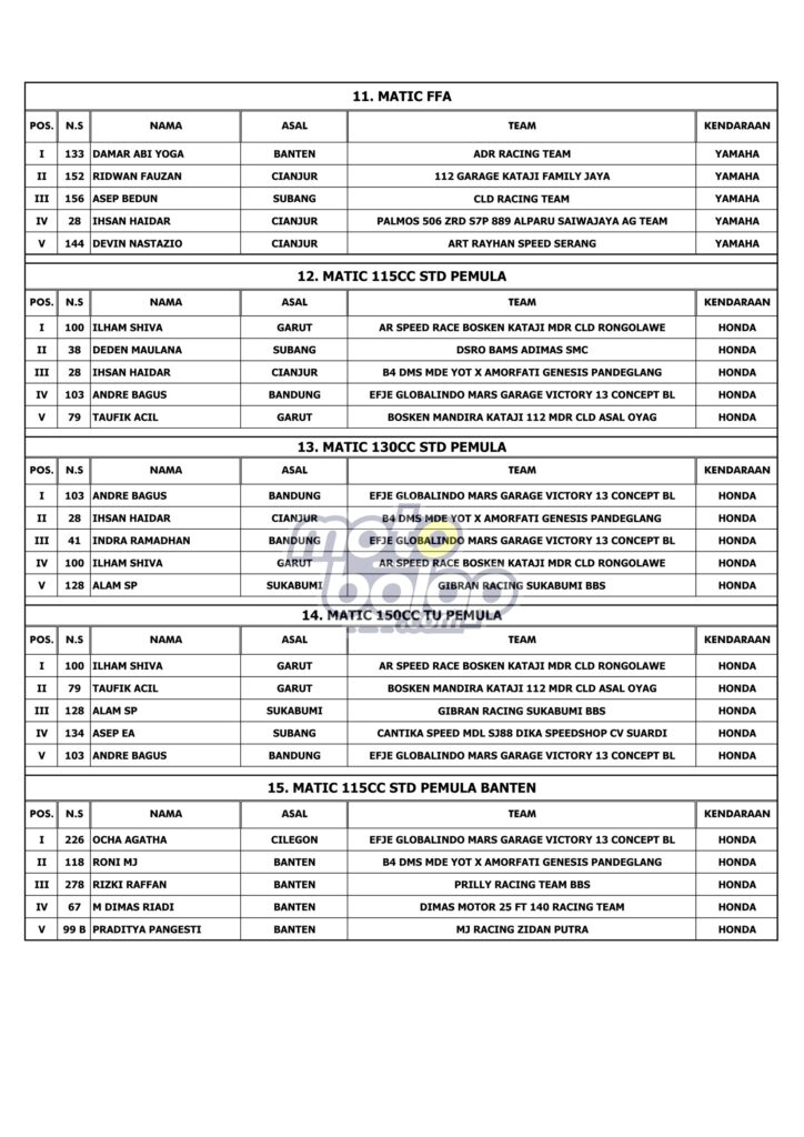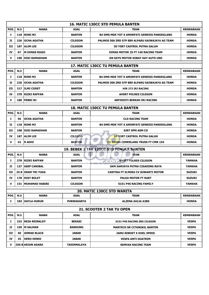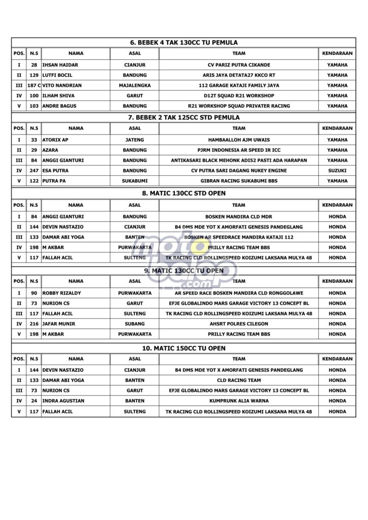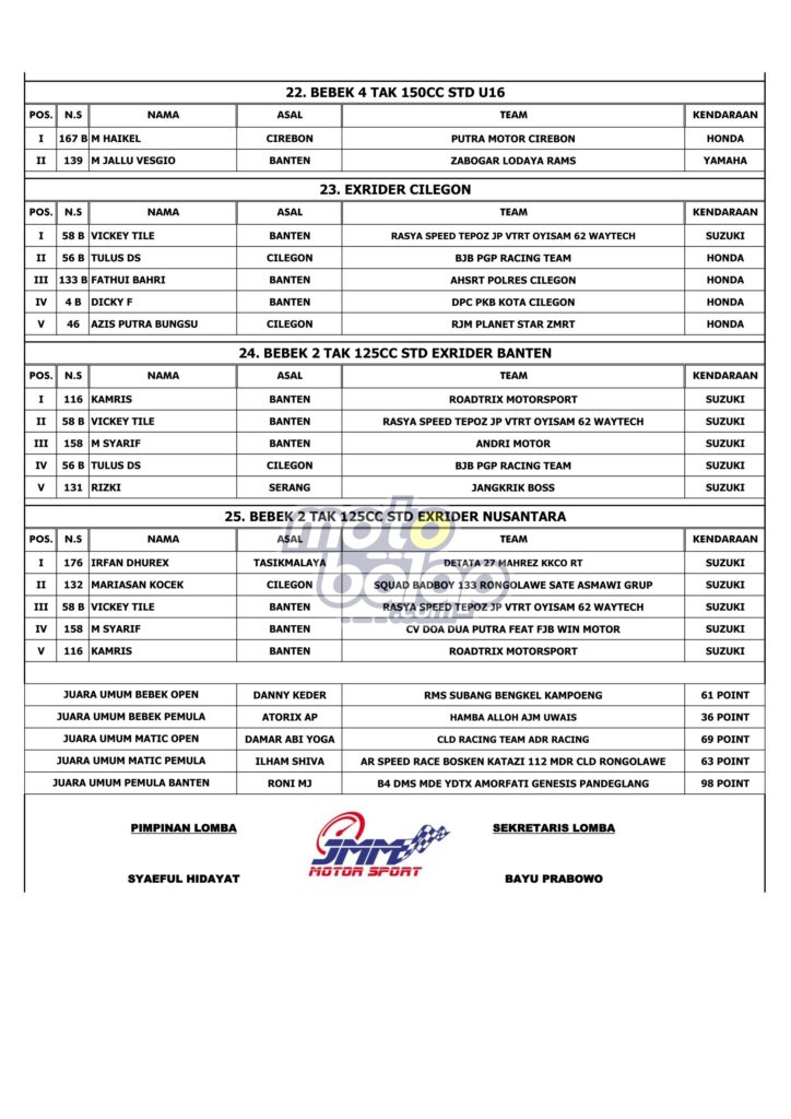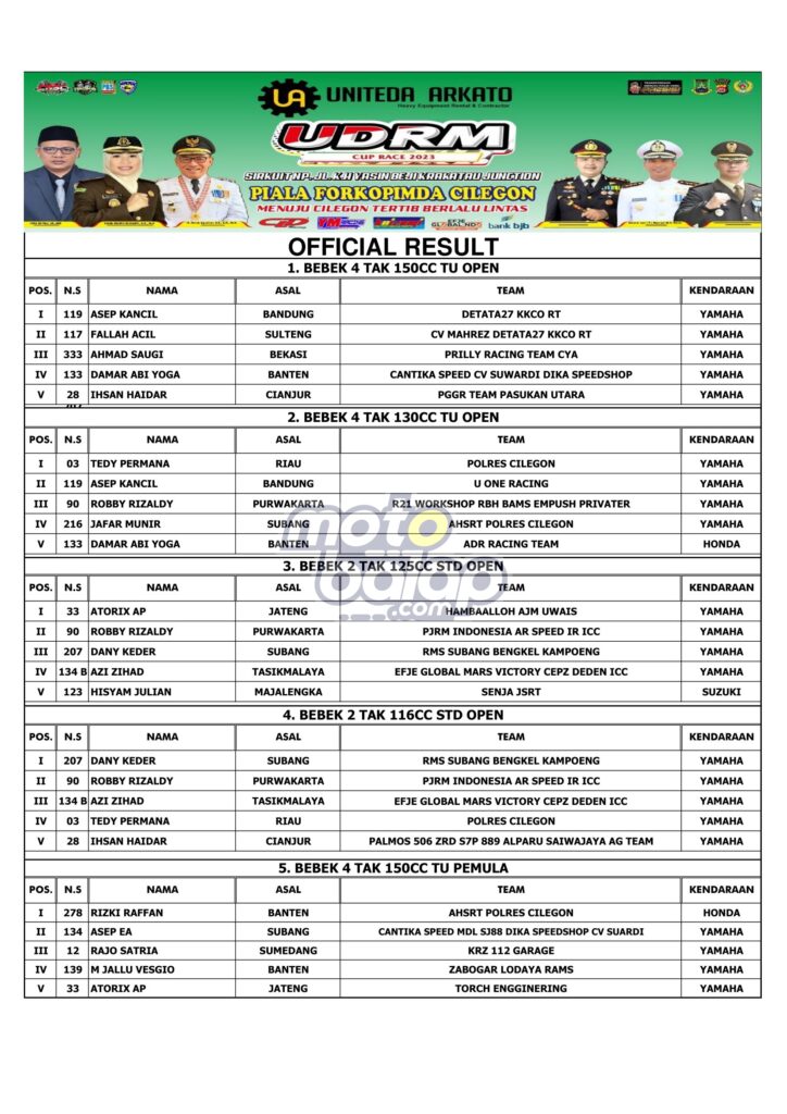 Dari keselurahan kelas yang dilombakan, di bawah ini merupakan UDRM Cup Race 2023 Cilegon 2023 adalah sebagai berikut: