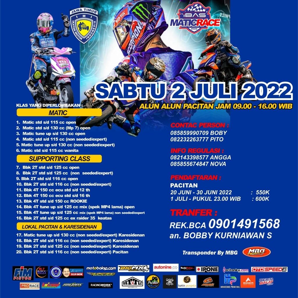Ibas Matic Race 2022 akan kembali mampir ke kota 1001 goa ini. Tercacat hampir 3 tahun lebih kabupaten Pacitan absen untuk mengelar event balap motor khususnya roadrace.