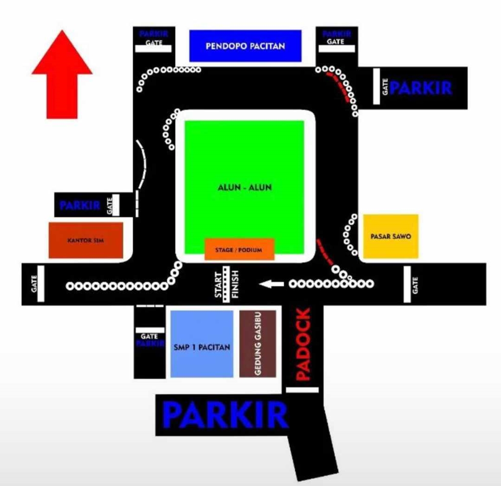 Dan untuk sirkuit kurang lebih akan tersaji seperti layout yang di bagikan penyelenggara kepada kami berikut bentuk layout sirkuit yang akan di gunakan untuk balapan pada hari Sabtu (02/7/22) di sirkuit non permanen Alon-alon kabupaten Pacitan, Jawa Timur.